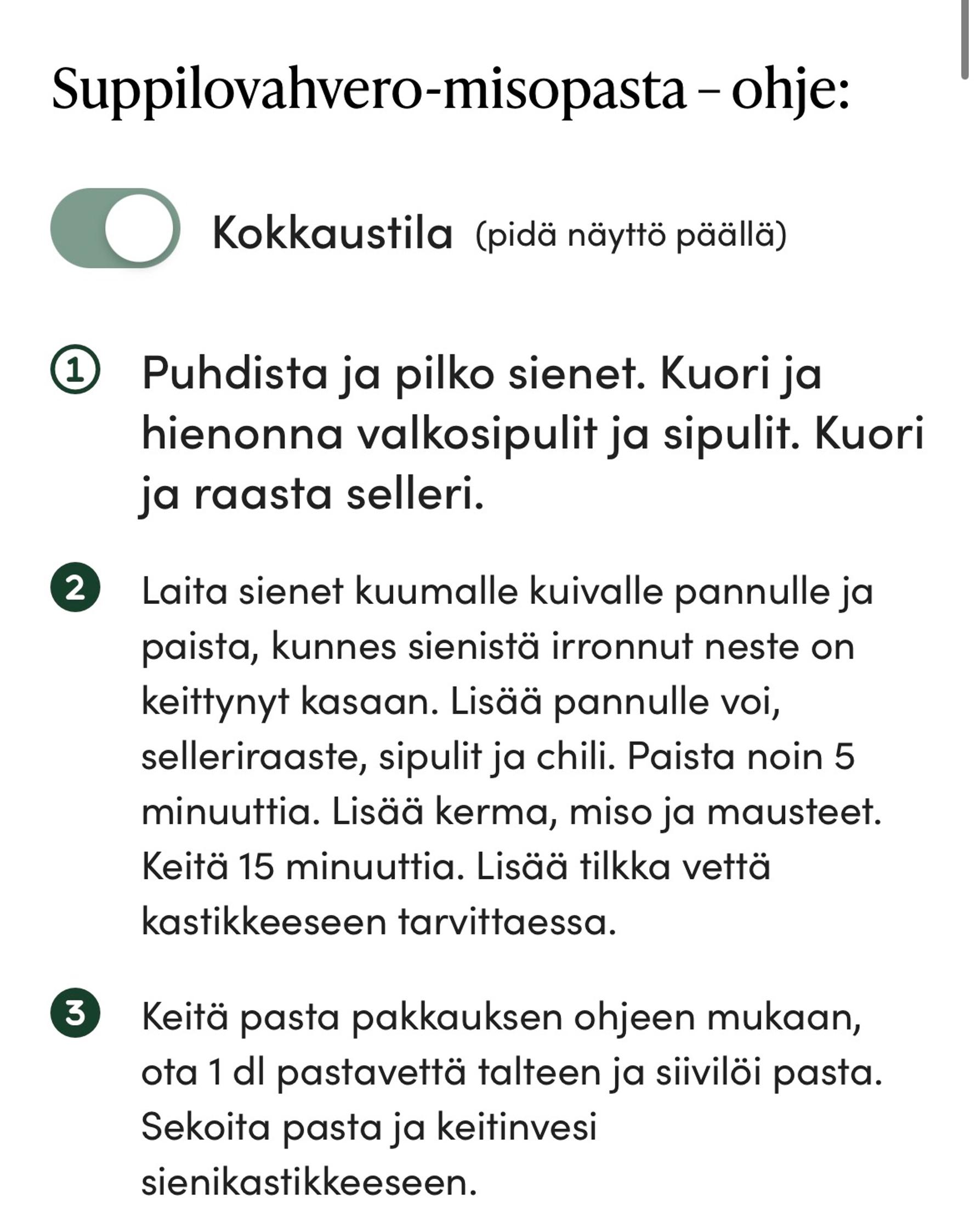 Eikä siinä vielä kaikki! Olemme helpottaneet kokkaamista kehittämällä Kotona-sivuston reseptien käytettävyyttä. Kun käytät reseptejämme, klikkaa päälle kokkaustila, jolloin puhelimen näyttö pysyy auki koko ruoanvalmistuksen tai leipomishetken ajan. Näin puhelimen näyttö ei tahriudu jauhoista tai rasvasta. Toinen uusi ominaisuus Kotona-resepteissä on se, että pystyt kliksuttelemaan vaiheet tehdyiksi. Näin ohjetta on aikaisempaa helpompi seurata. Hyviä kokkaushetkiä!