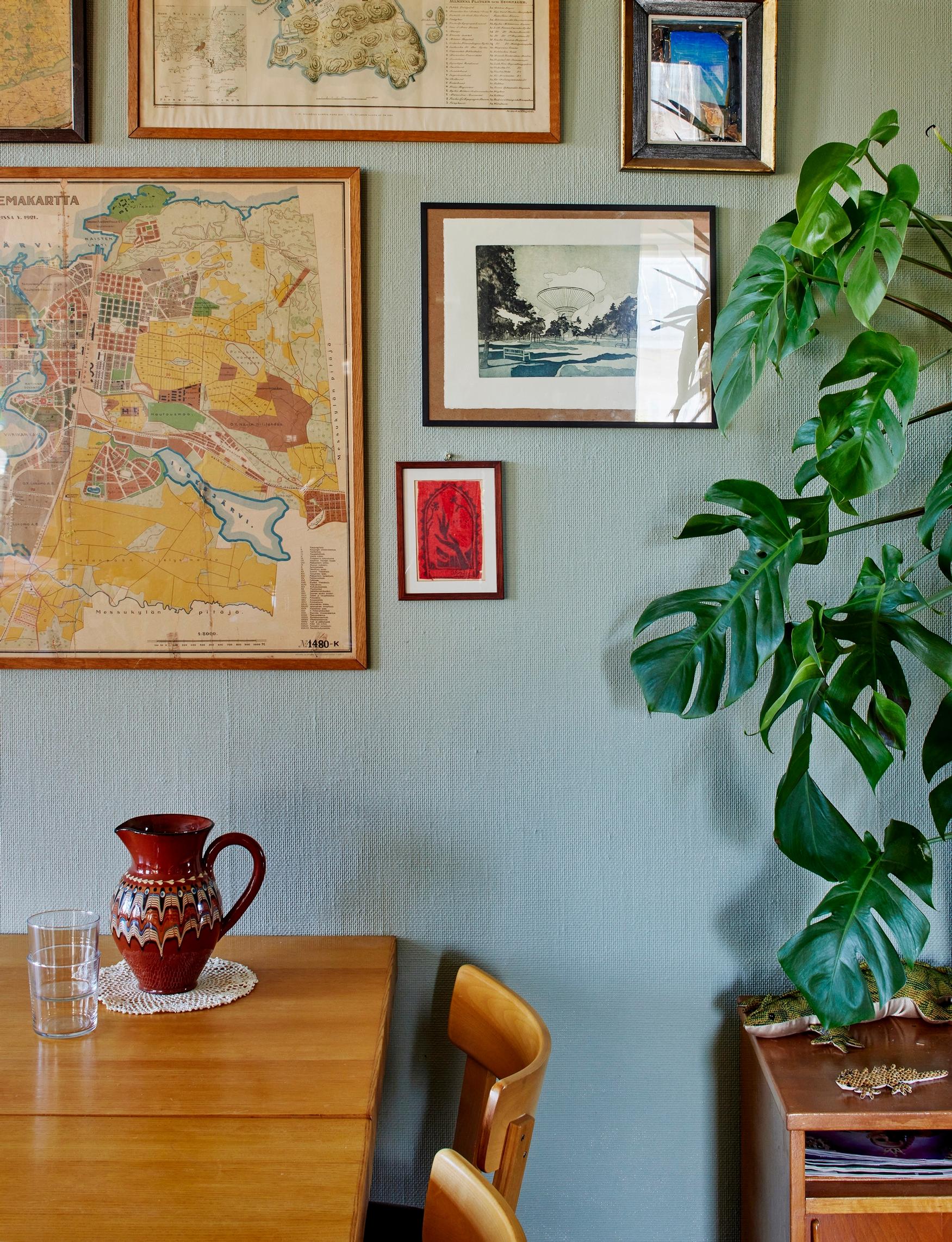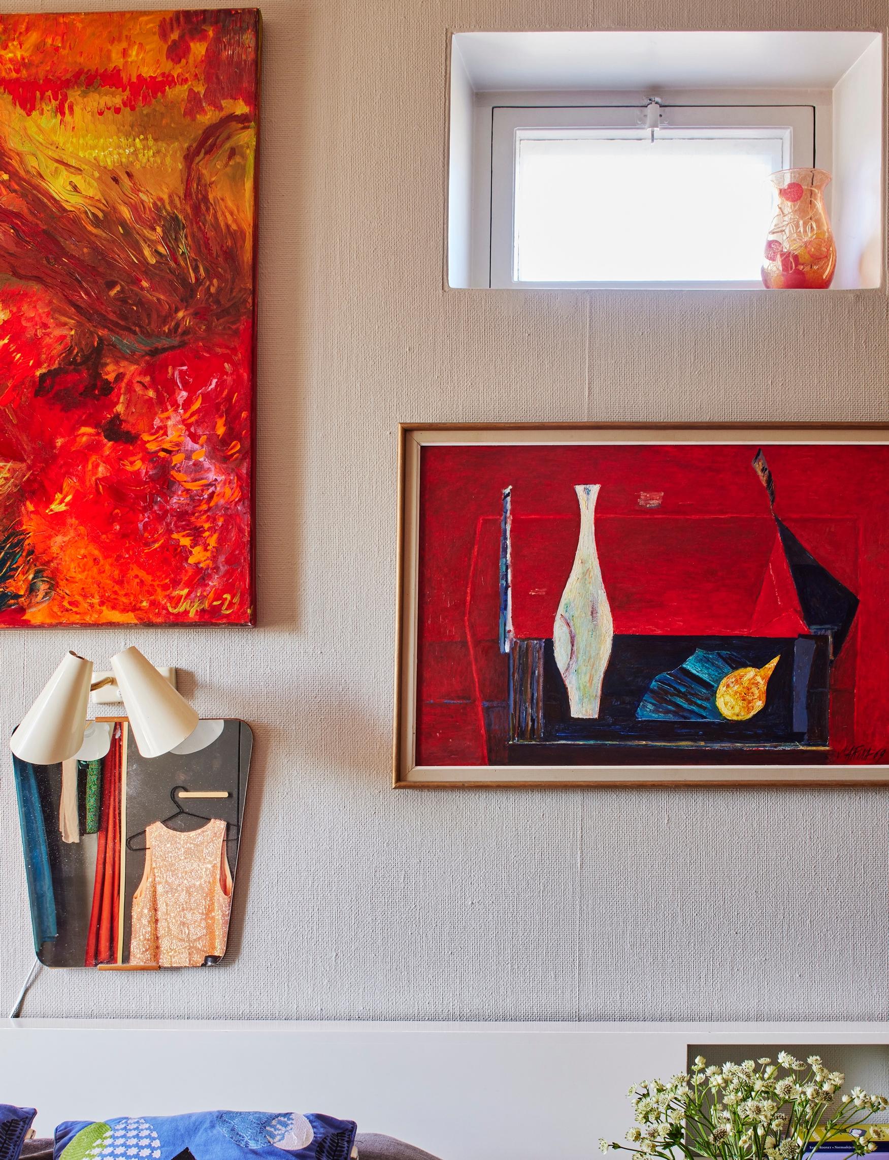 Samppa: Minulle on kertynyt paljon taidetta. Muuton jälkeen pistin taulut nojailemaan seiniä vasten, jolloin näin yhdellä silmäyksellä niiden värit ja tyylin. Taulukollaasi on helpointa tehdä lattialla.