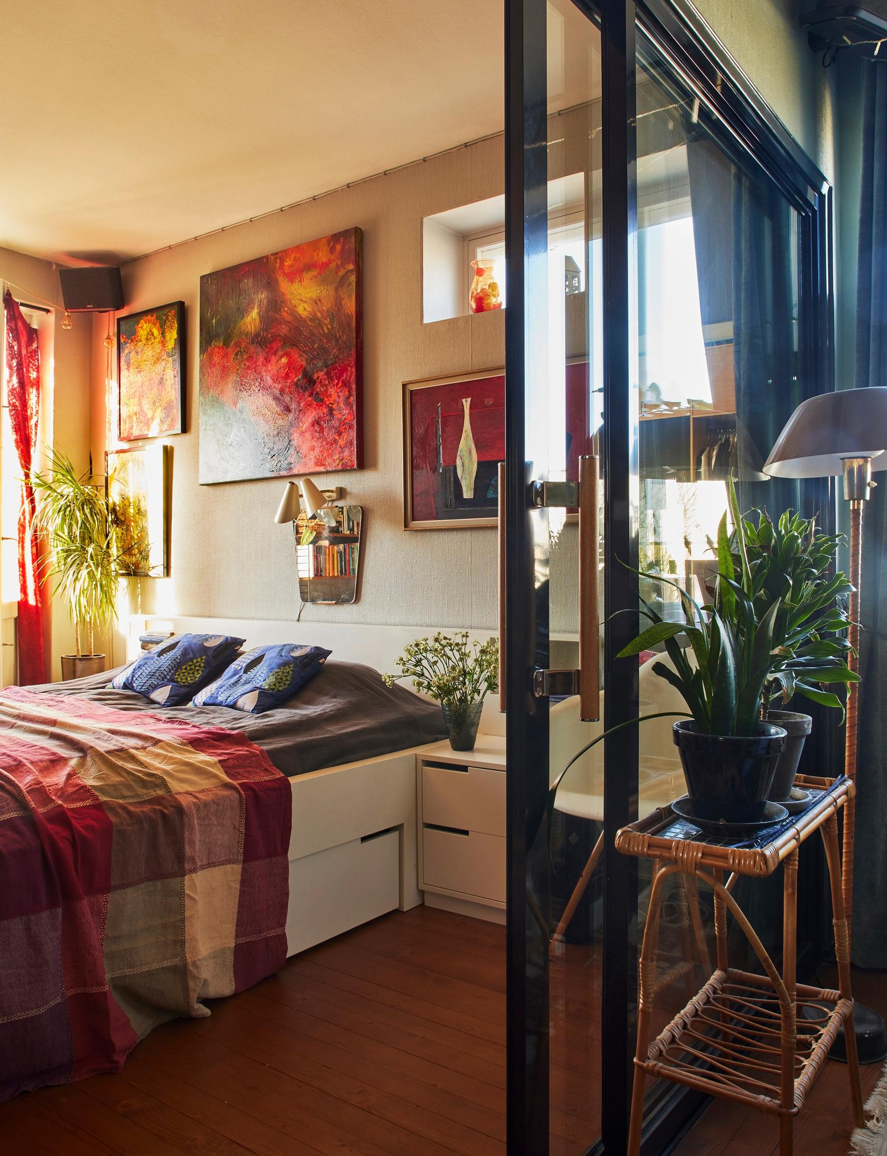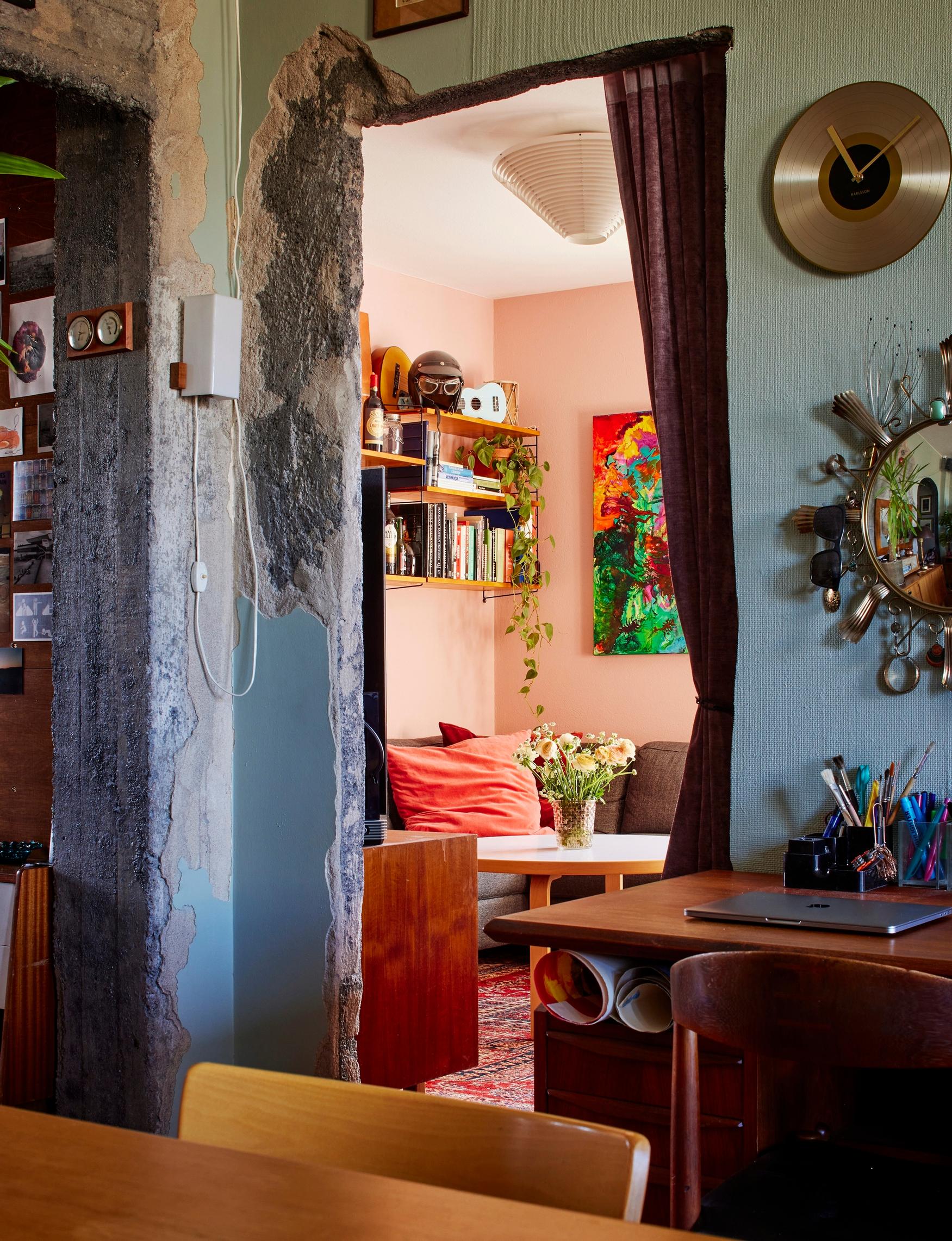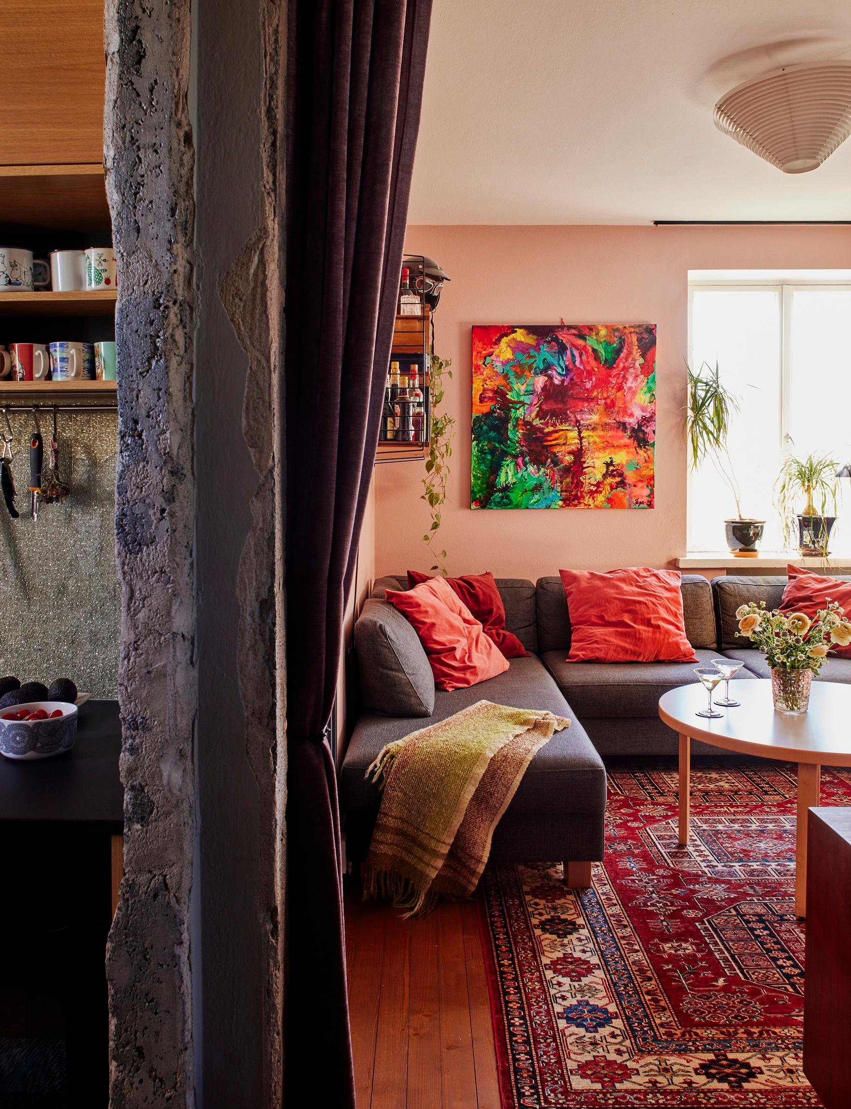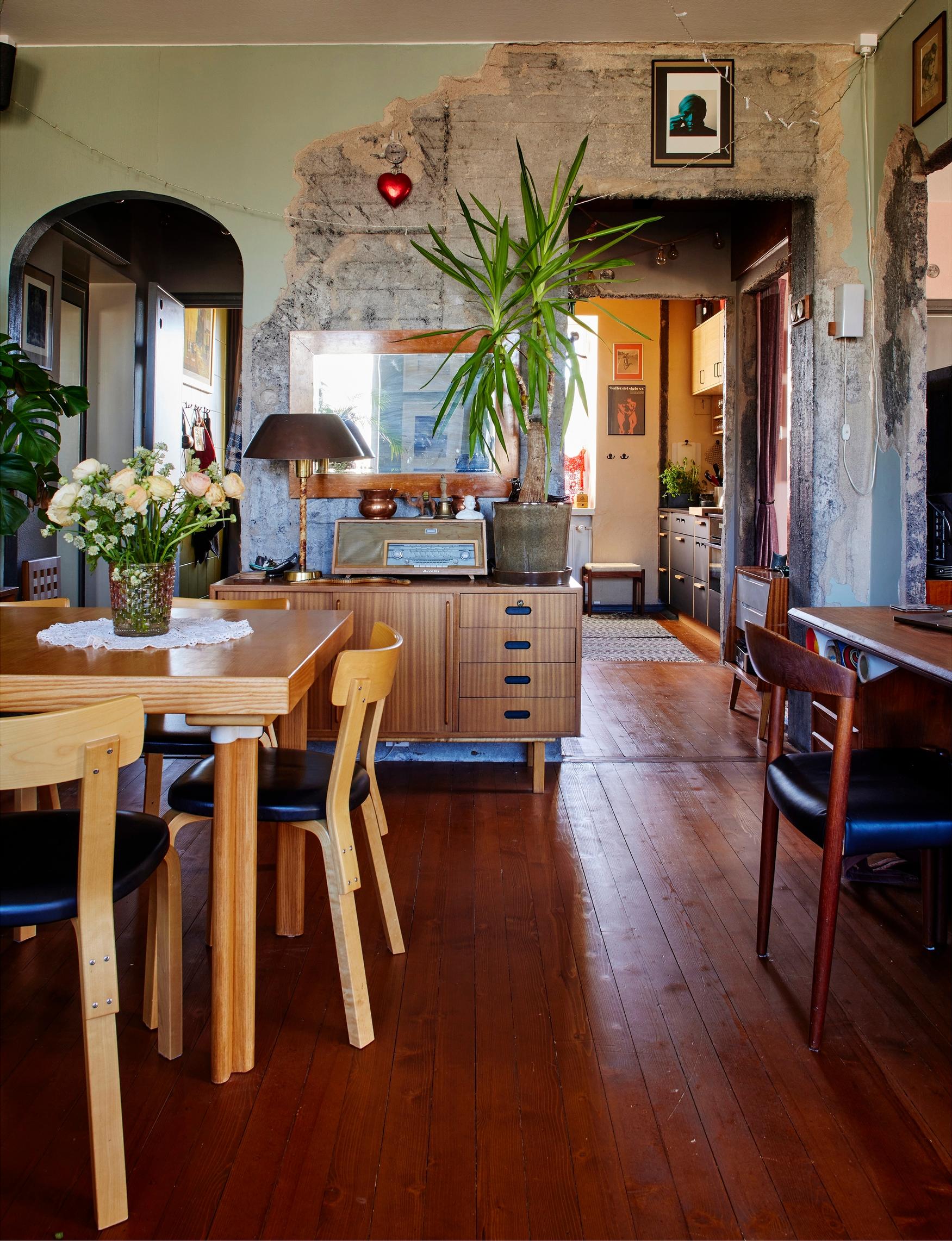 Muuta ei tarvittu, sillä vintagekalusteilla, värikkäällä kuvataiteella ja rouheilla materiaaleilla sisustettu asunto tuntui Jennistä heti kotoisalta, koska se muistutti hänen omaa tyyliään ja kotiaan.
