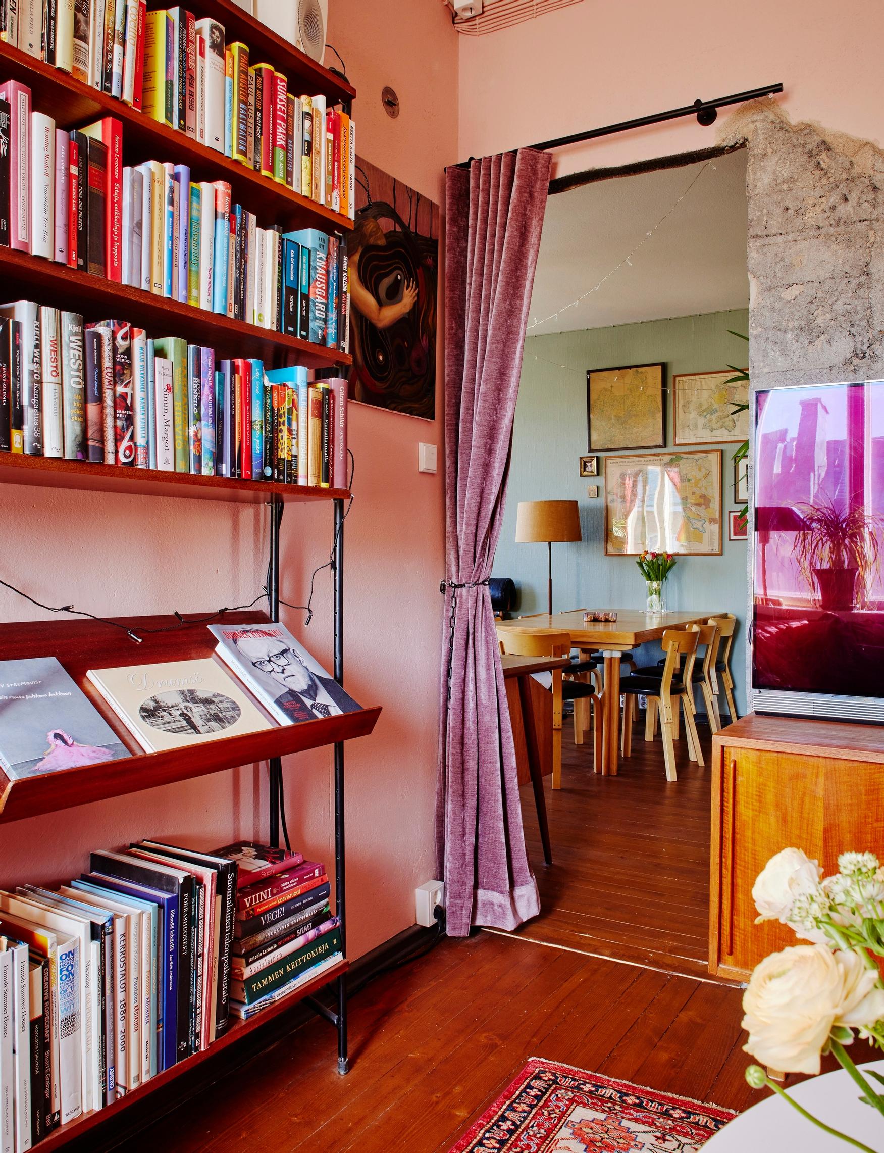 Olen pitkään haaveillut puupintoihin sopivista murretuista väreistä kotonani. Tämä on ensimmäinen kotini, jonka olen voinut suunnitella itselleni ilman kompromisseja. Halusin jokaiseen huoneeseen eriväriset seinät ja valitsin maalisävyt huoneiden tunnelman mukaan. Tv-huoneen vaaleanpunaiset seinät ohjasivat kaluste- ja tauluvalintojani.