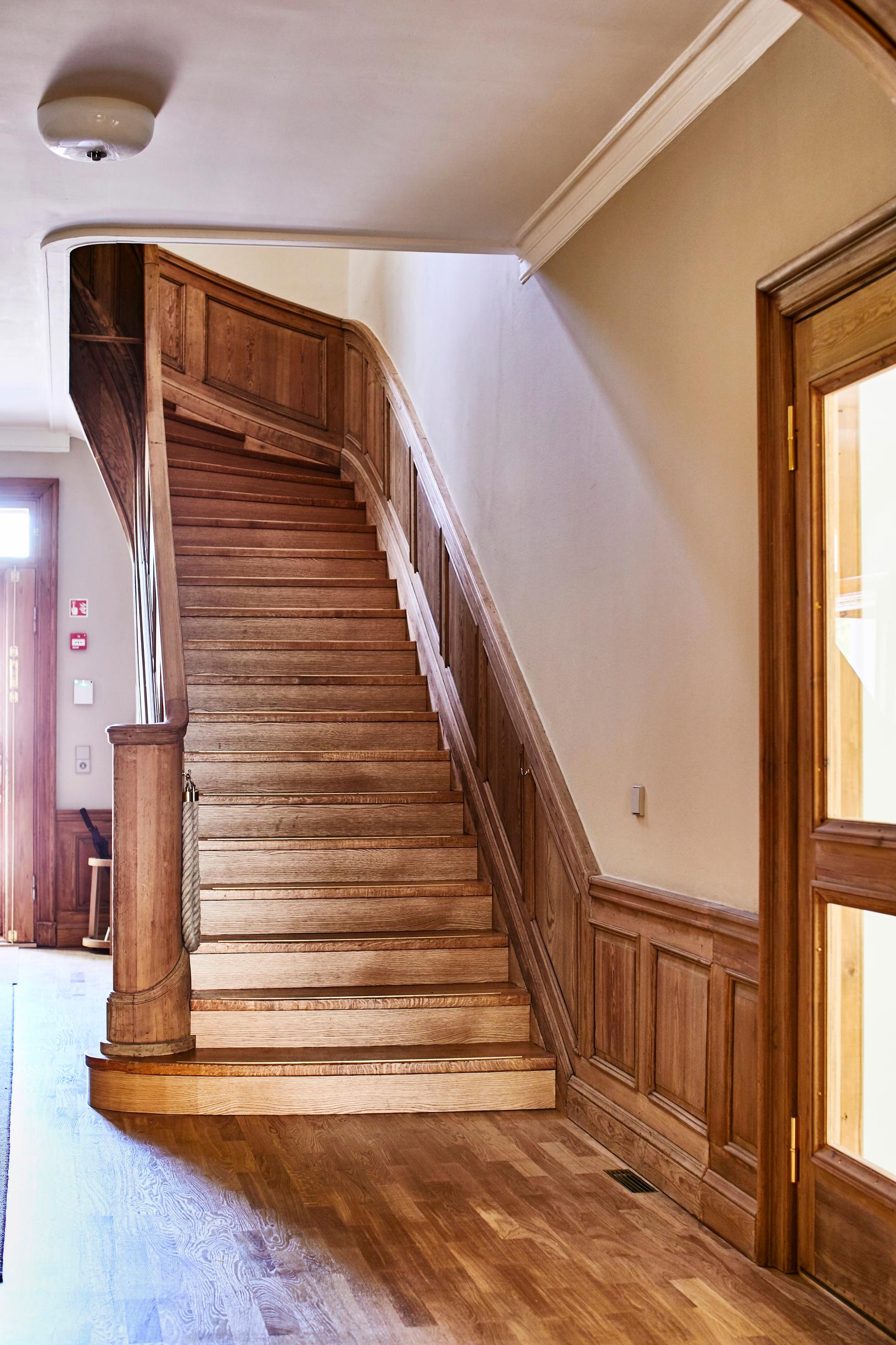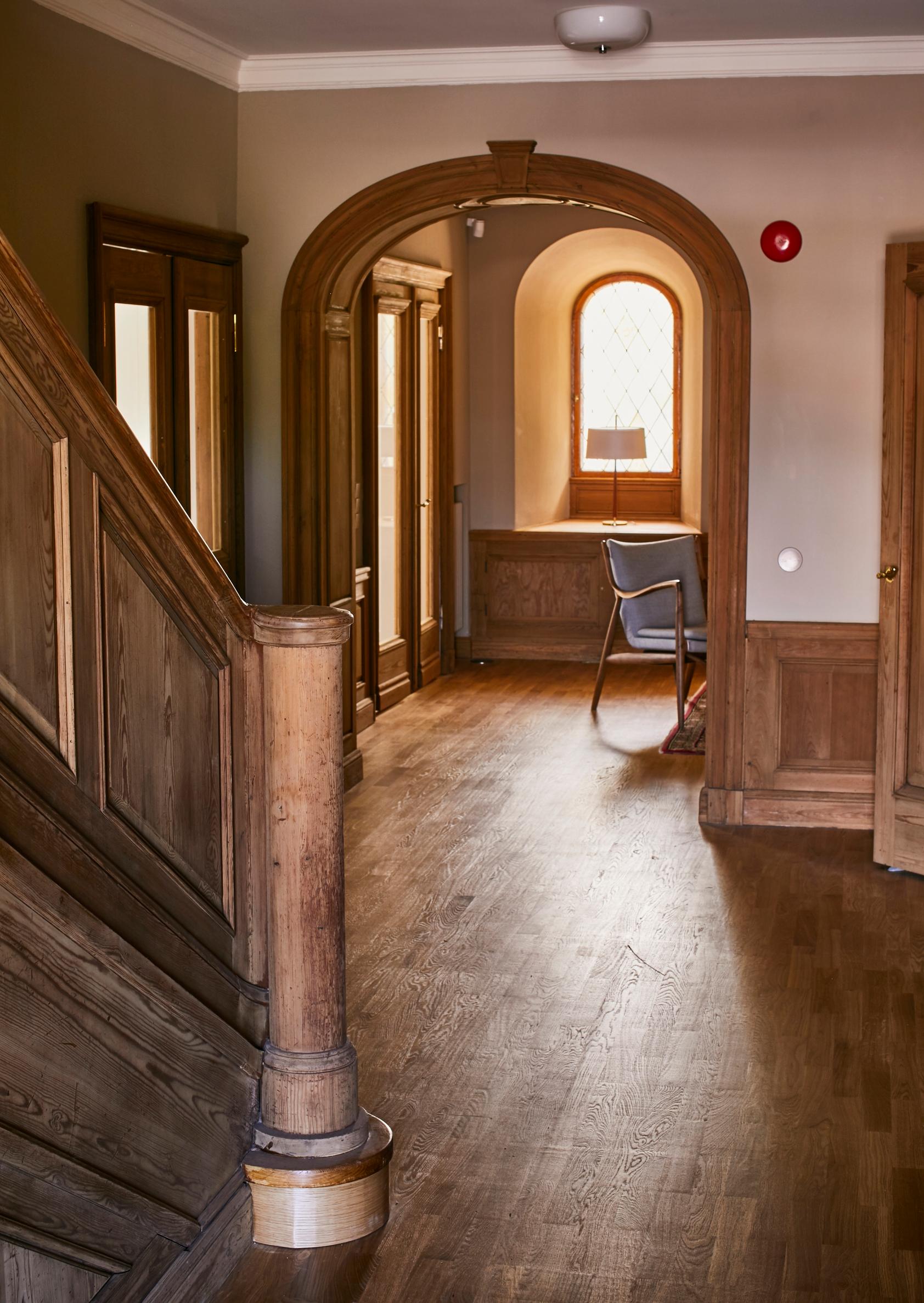 Kartanon eri kerroksissa liikutaan monissa aikakausissa. Alakerta on palautettu 1920-luvulla tehdyn remontin tummiin väreihin ja tammipintoihin.