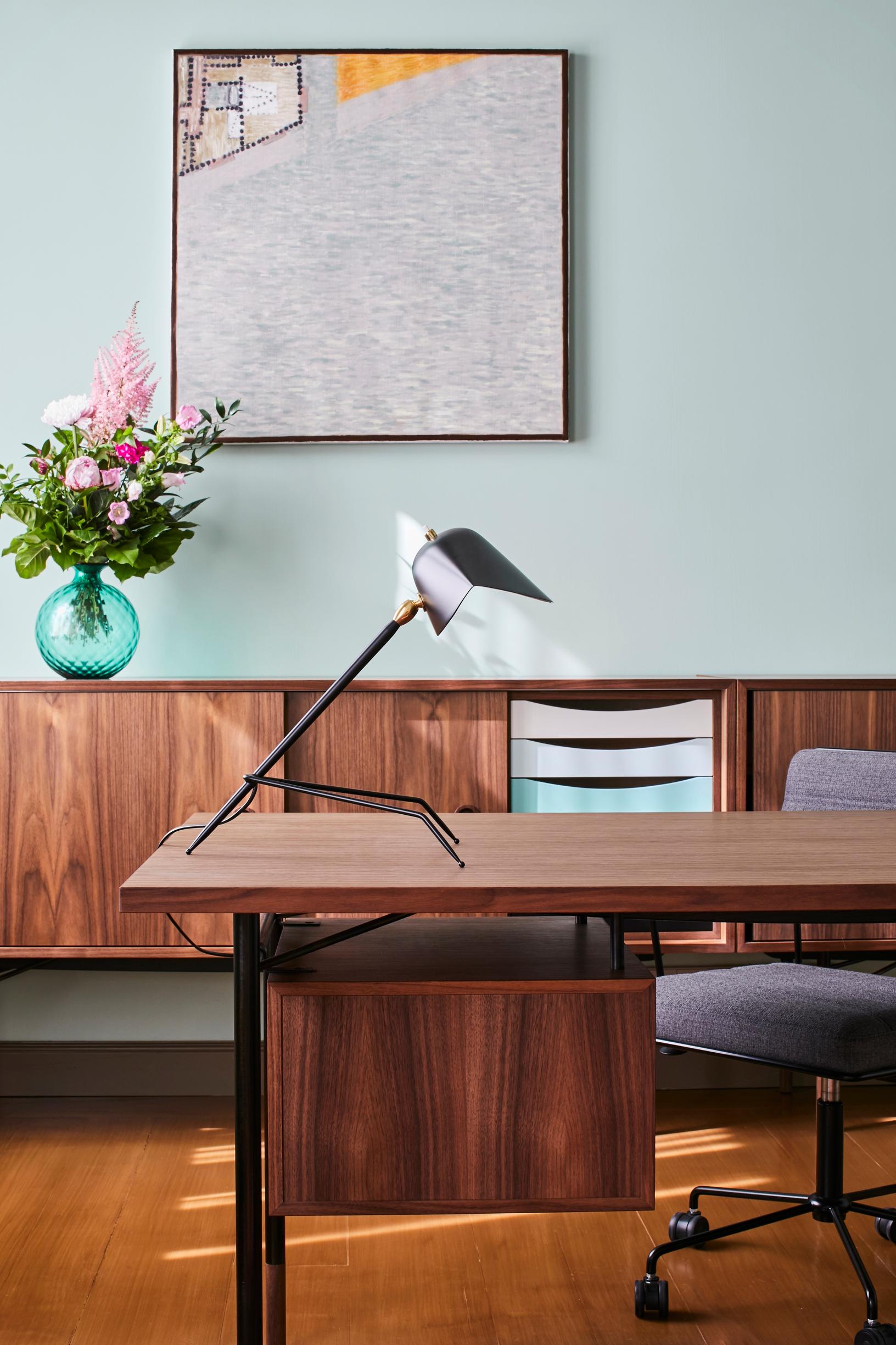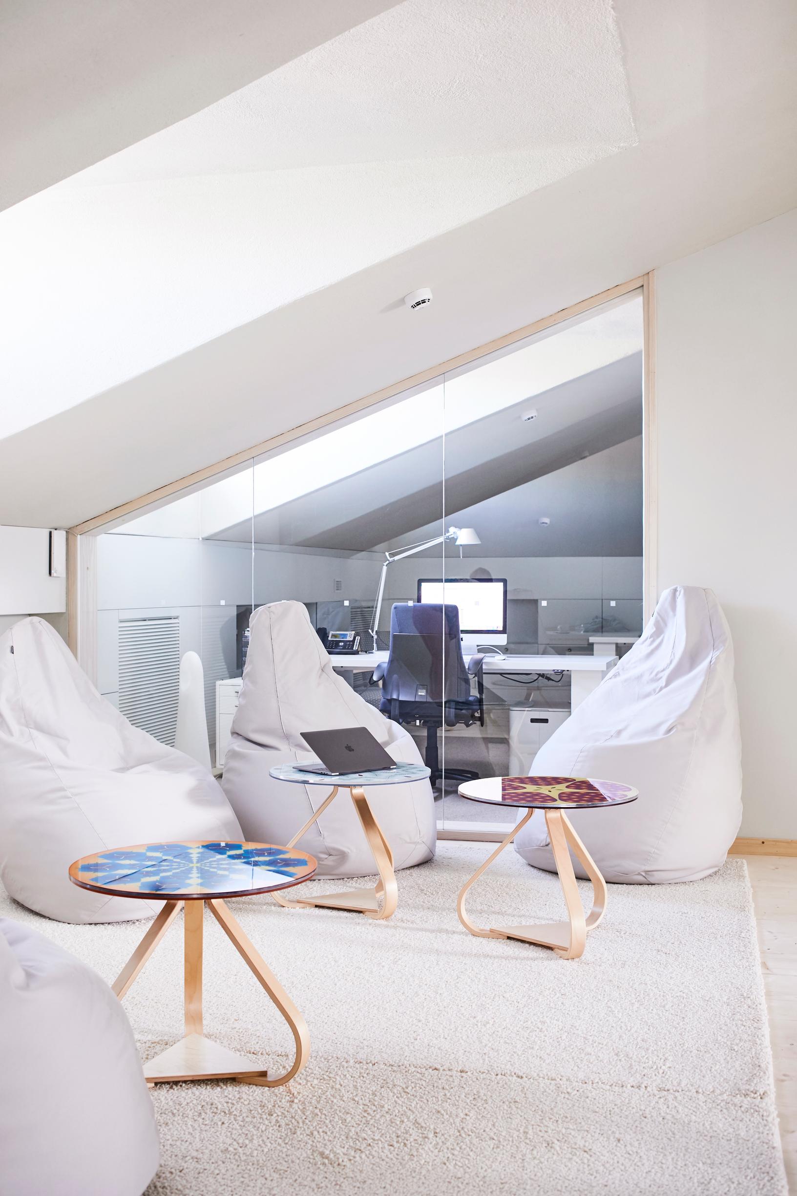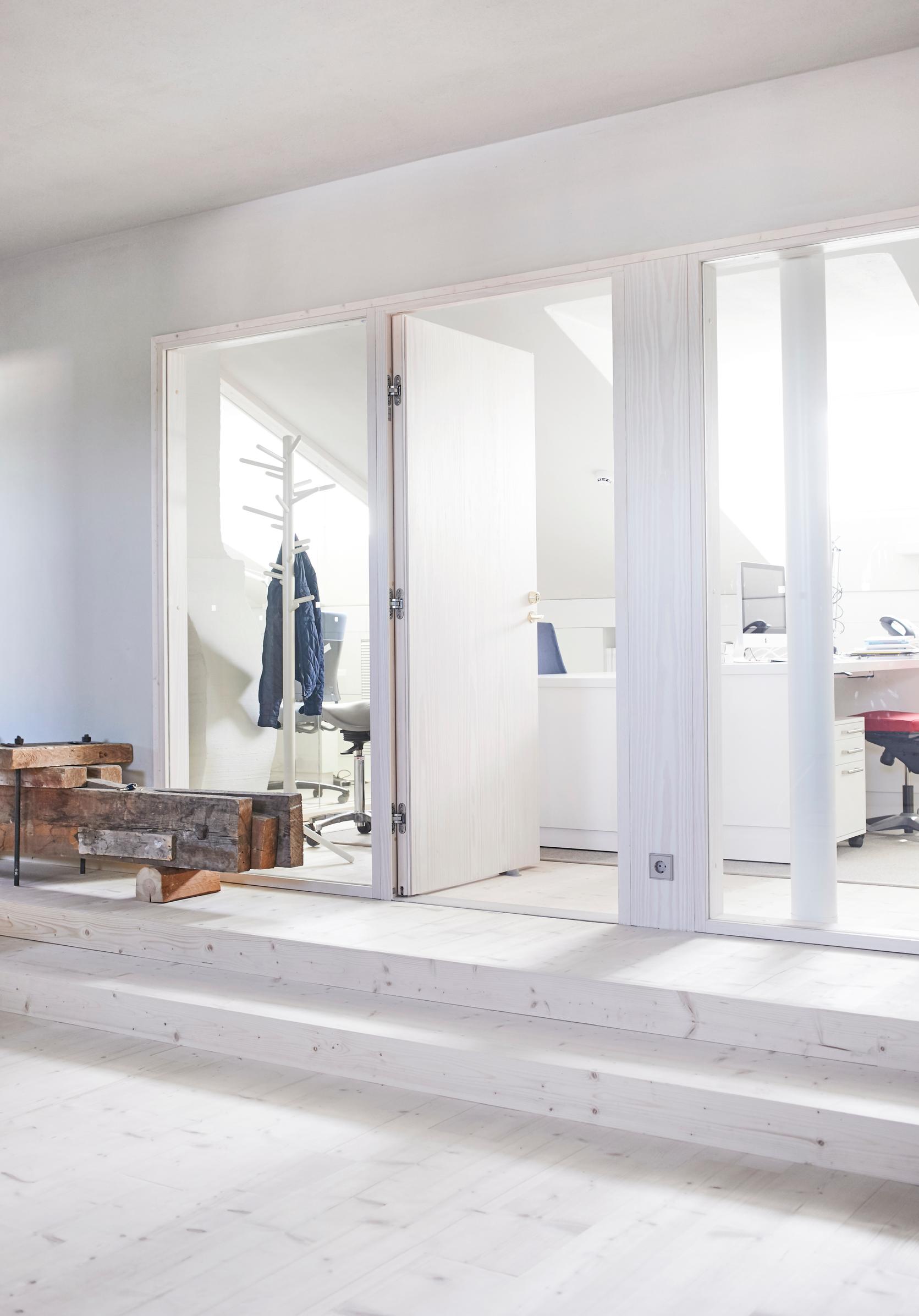 Ylimpään kerrokseen siirryttäessä tunnelma muuttuu jälleen: työtiloiksi muutettu asumaton vintti on moderni valkoisine seinineen, suopakuurattuine kuusilautalattioineen ja lasipintoineen.