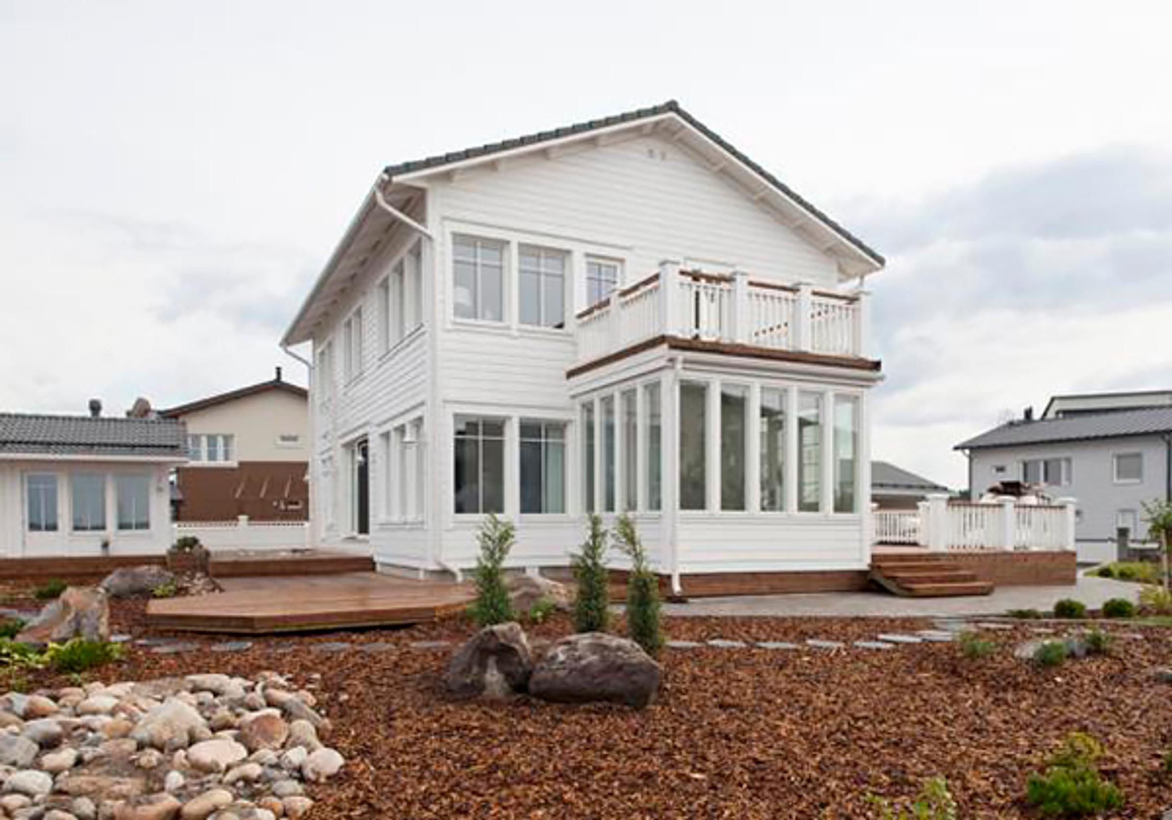 Kaksikerroksisessa perinnepuutalossa oli saaristolaisromanttinen henki. Suuret terassit ja parvekkeet tarjosivat monipuolista oleskelutilaa.