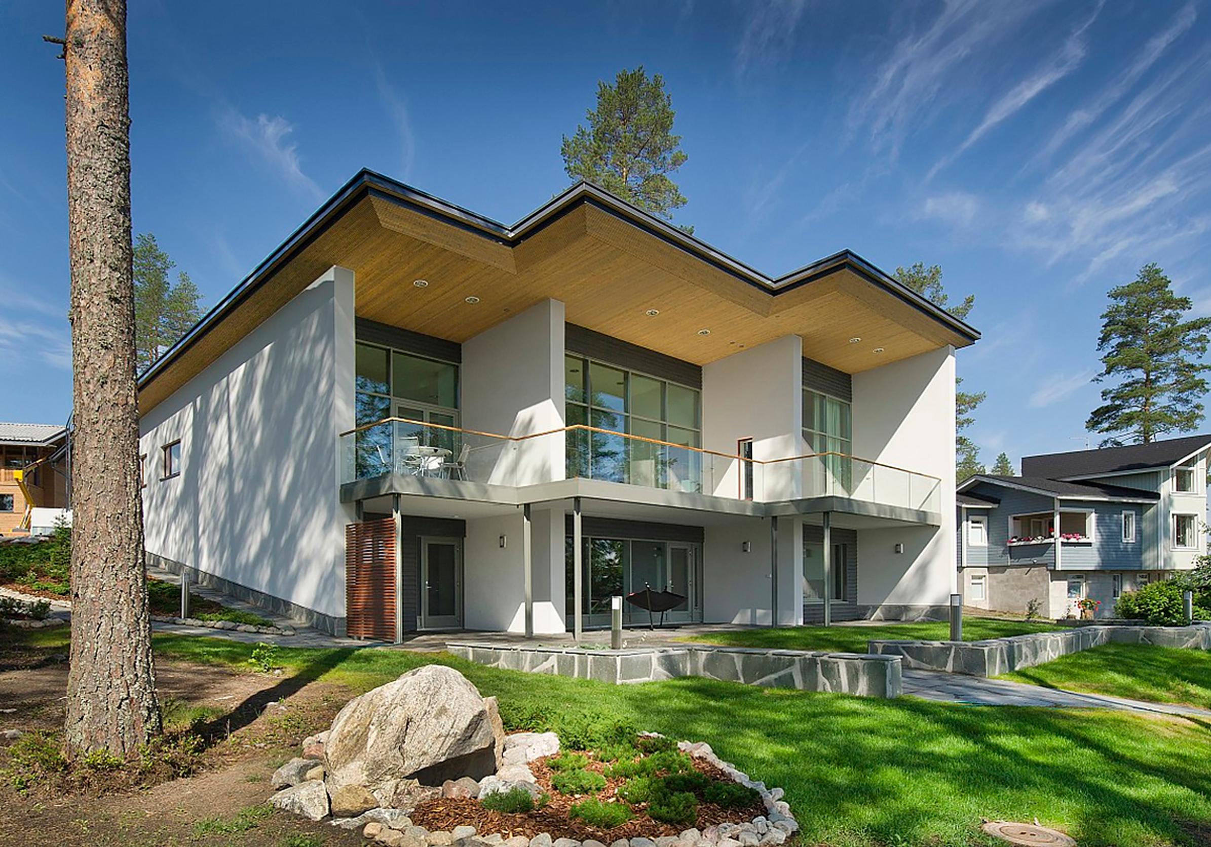Moderni rinnetalo avautui Kallaveden komeaan järvimaisemaan. Huolellisen viimeistelyn jälki näkyi niin julkisivussa kuin sisustuksessa.