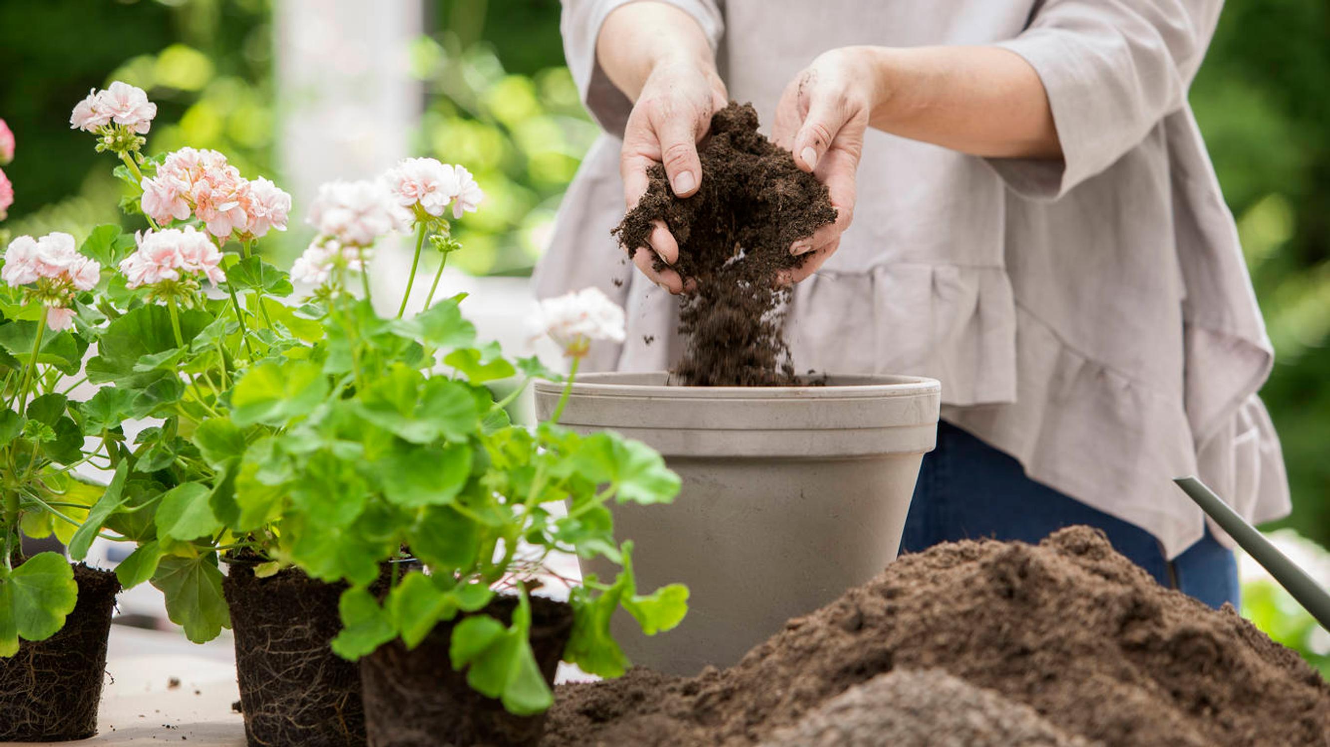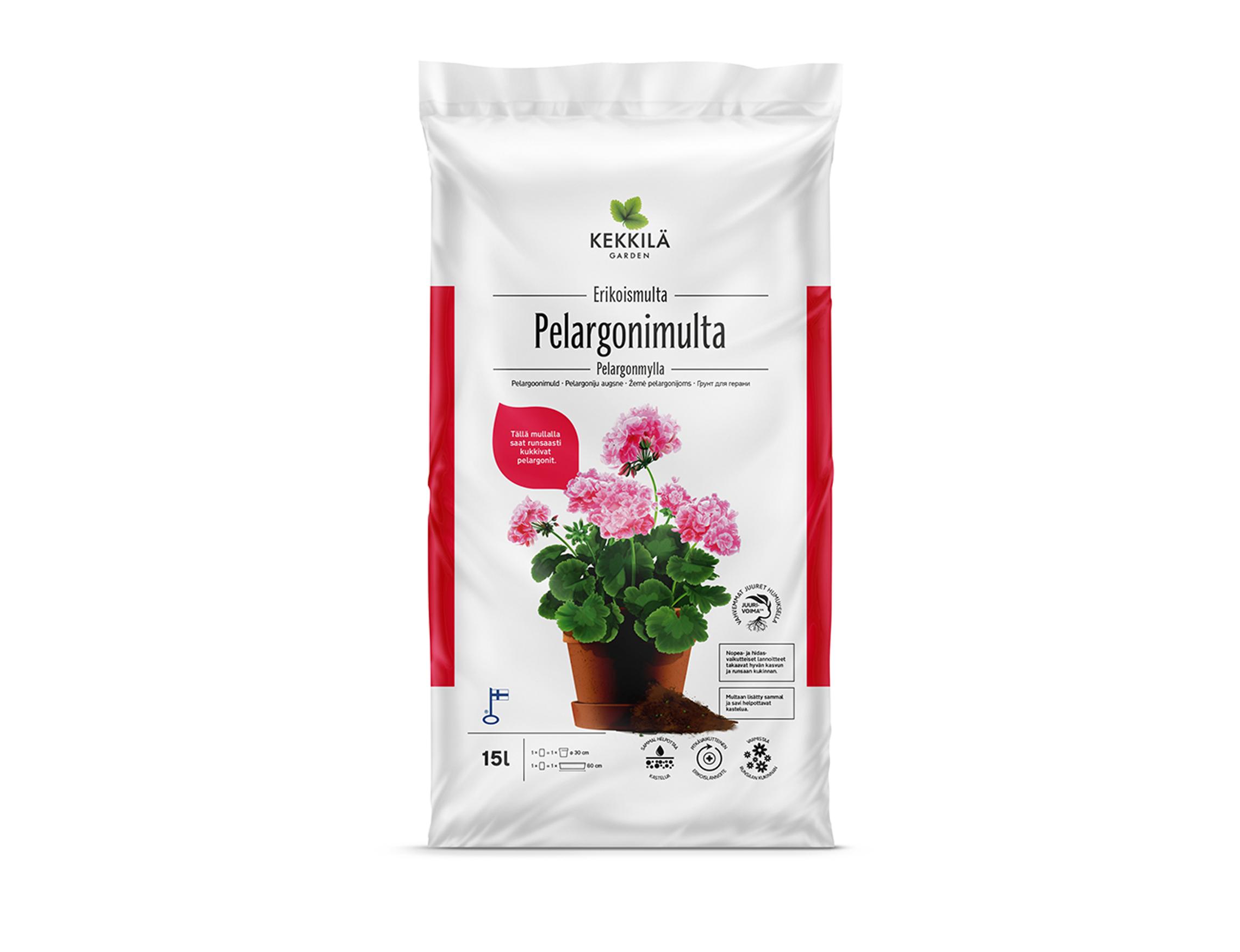 "Pelargonin kasvualustan pitää ehdottomasti olla ilmava. Esimerkiksi uuteen Kekkilä Pelargonimultaan lisätty sammal auttaa säilyttämään huokoisuuden. Jos haluaa pelargonien kukoistavan, suosittelen vaihtamaan niille kokonaan uudet mullat joka kevät. Eron kyllä huomaa.