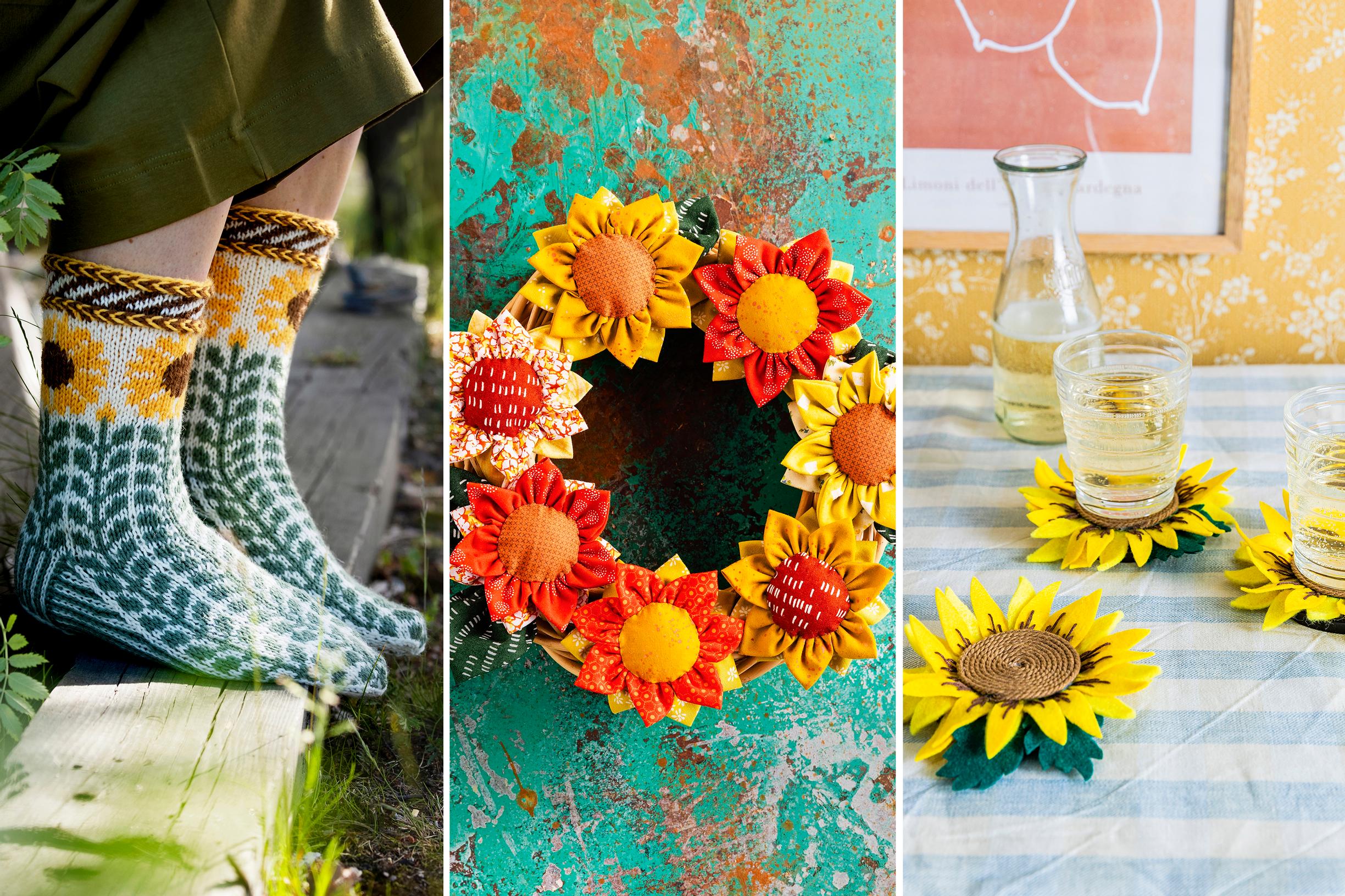 Rakastatko auringonkukkia? Neulo sukat, ompele kranssi tai askartele lasinaluset