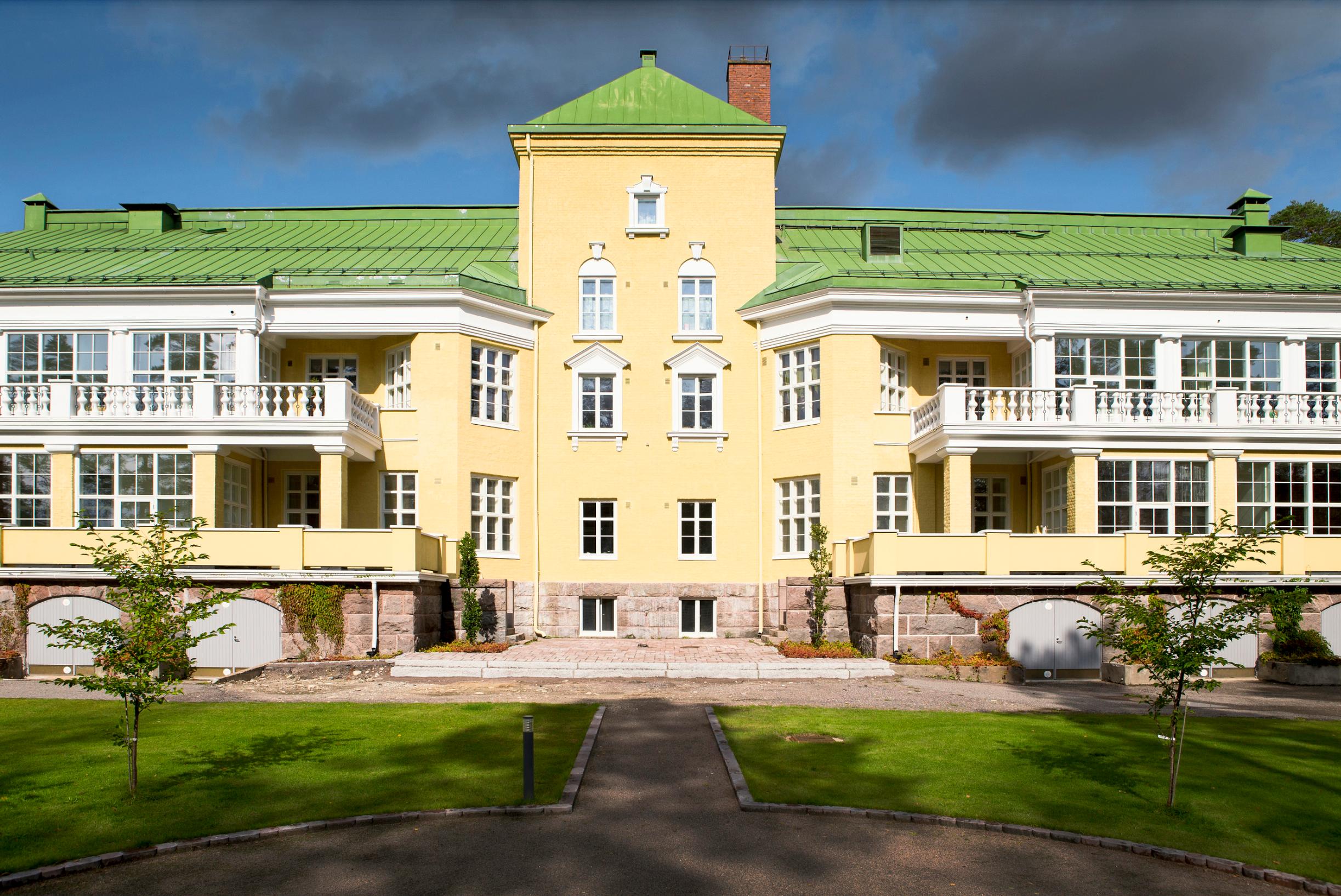 Kiinteistön saneerauksen jälkeen myös piha-alueet kunnostettiin maisemasuunnittelija Eeva Tavastin johdolla.