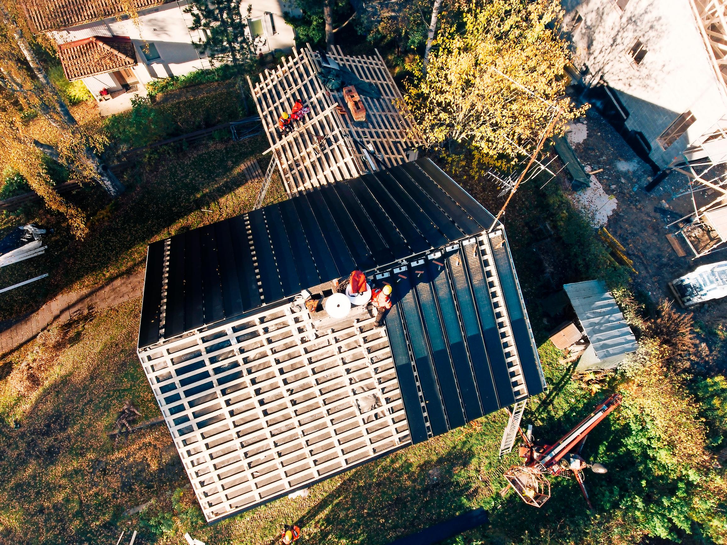 Purkamisen jälkeen miehet nikkaroivat uudet alusrakenteet, sitten mustanhohtoiset pellit nostettiin ylös. Kolmen ammattilaisen rivakalla tahdilla uutta vesikattoa syntyi kymmeniä neliötä tunnissa.