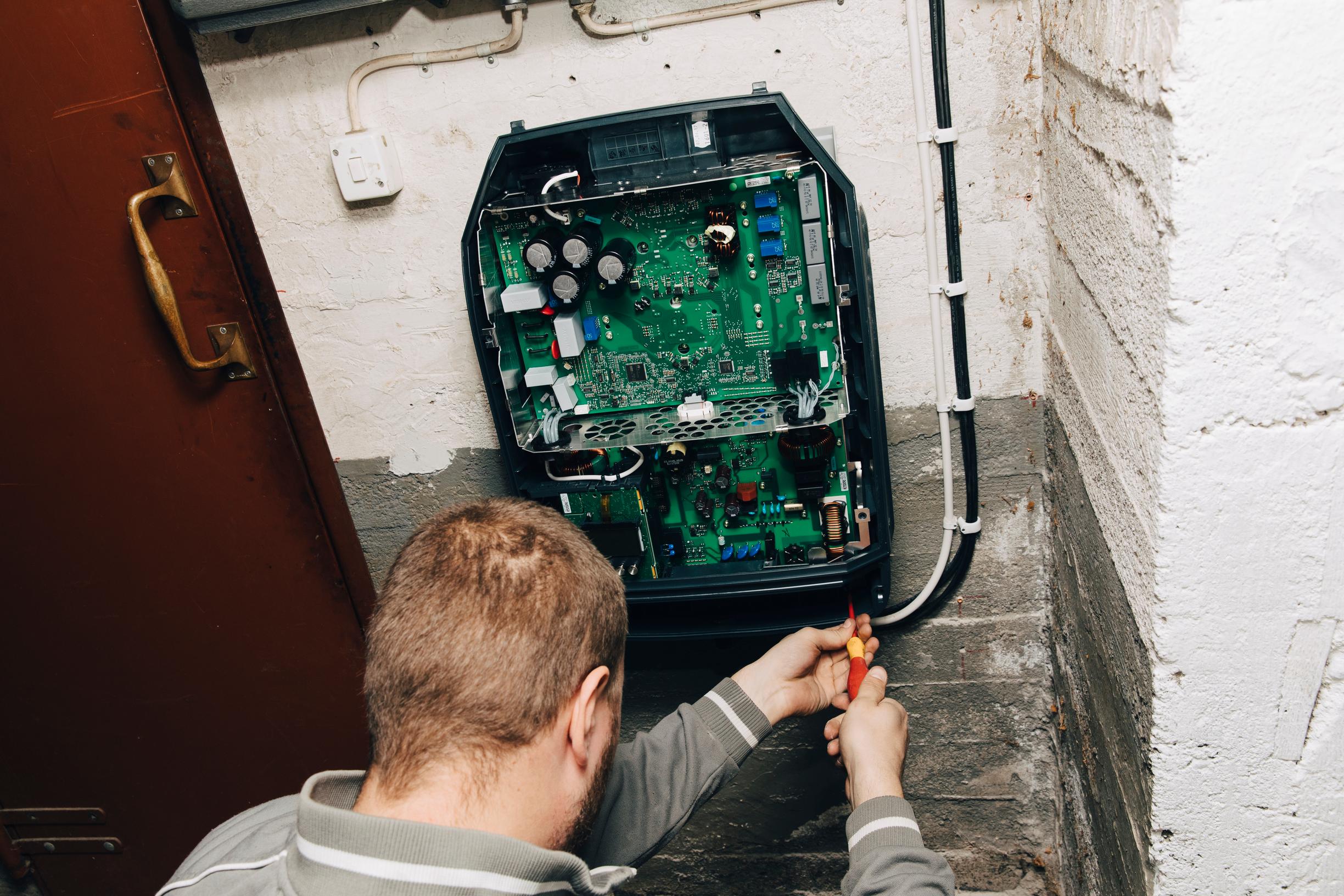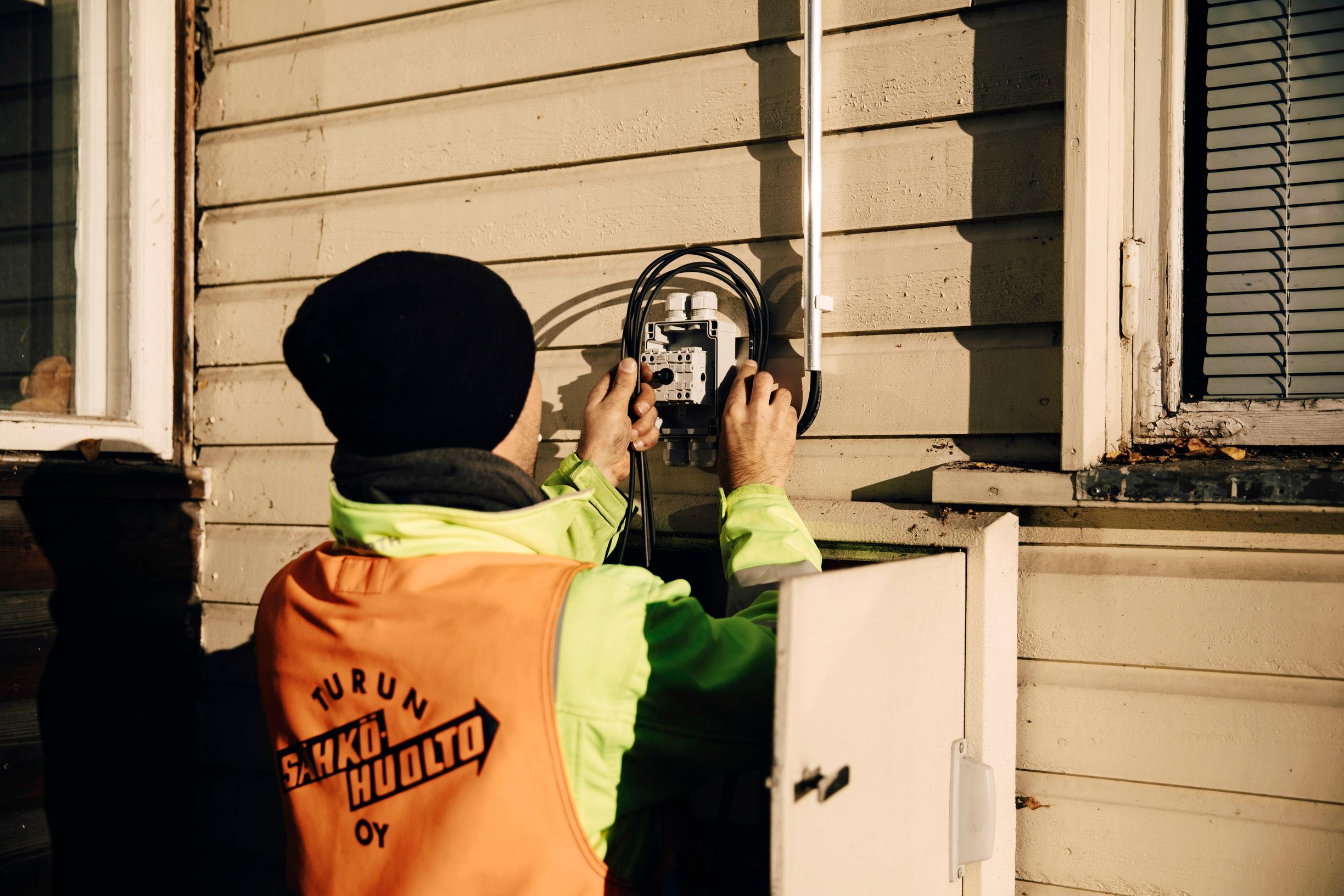 Ammattilaiset vaihtuivat, kun tuli sähkötöiden aika. Asentajista toinen veti kaapelit ulkoseinän turvakytkimeltä kummankin lappeen paneelikentälle. Maan kamaralla toinen asentaja asensi samaan aikaan kellariin verkkoinvertterin, veti kaapelin sähkökeskukseen ja kytki loput johtimet.