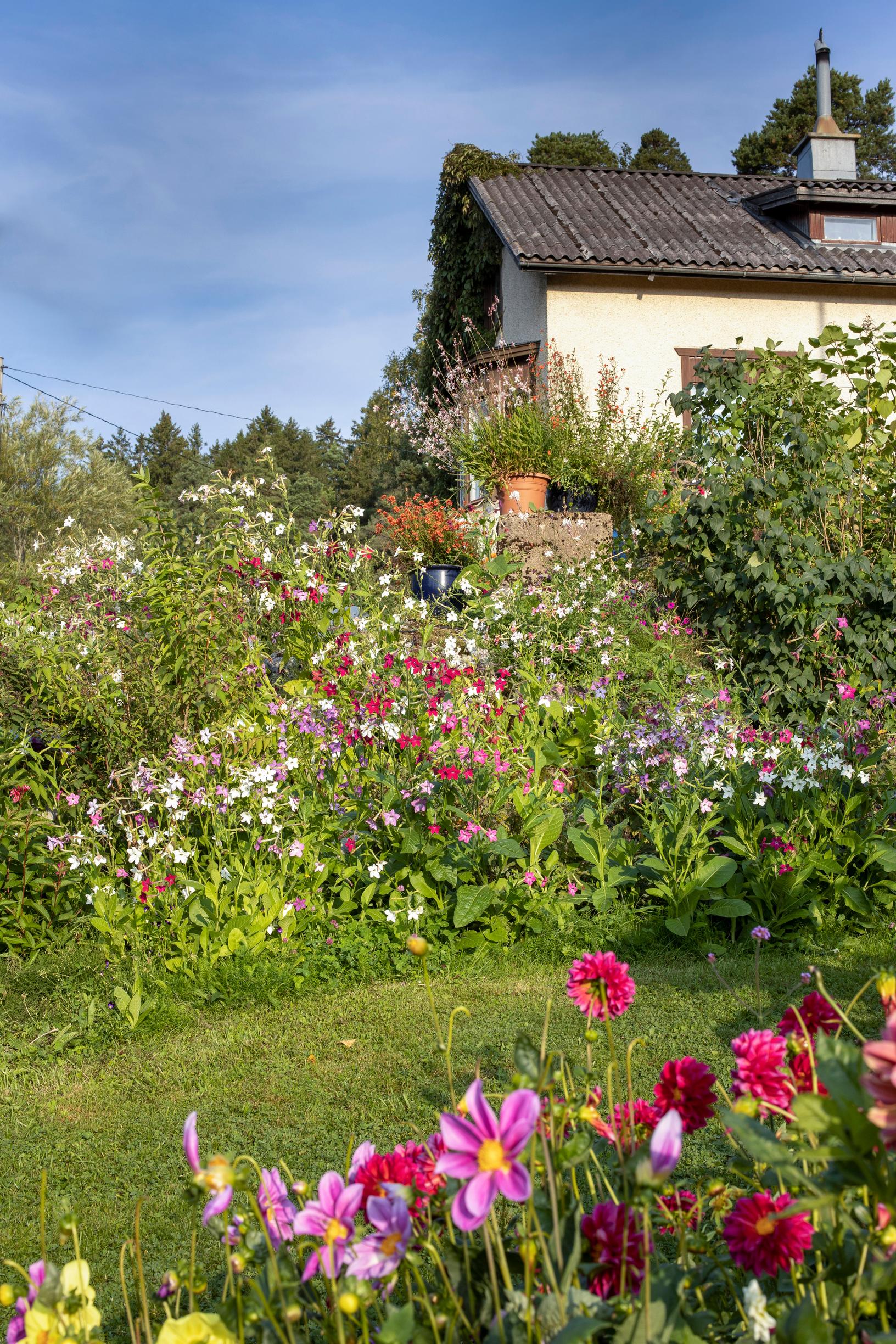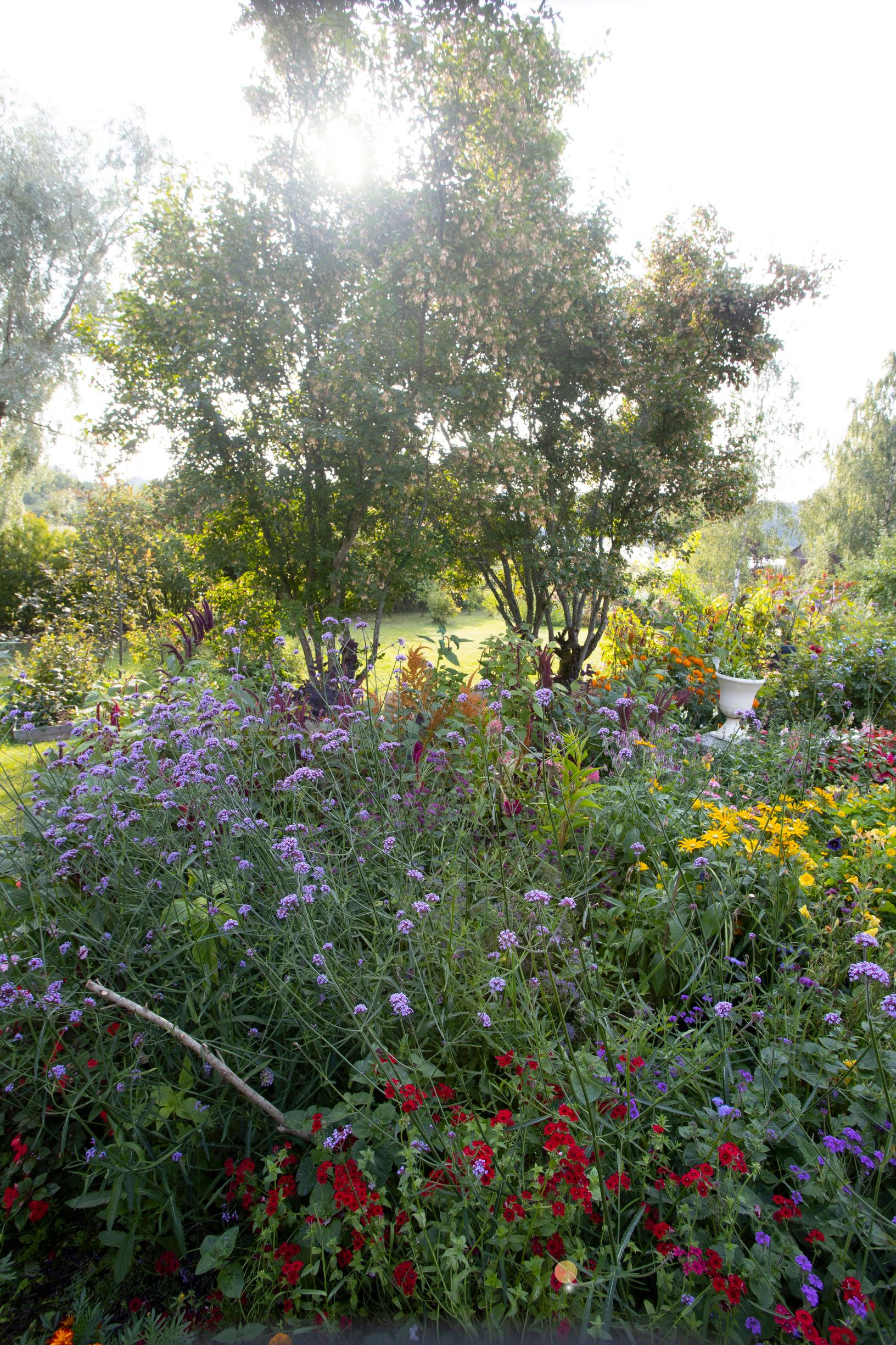 Pidän siitä, kun kasvit kylväytyvät ja leviävät itsekseen pihalla. On jännittävää seurata, mitä taimia nousee mistäkin. Periaatteeni on, että kaikki kukat saavat kukkia. Tämä on villi piha ilman muodollisuutta – sellainenhan oikea luontokin on.