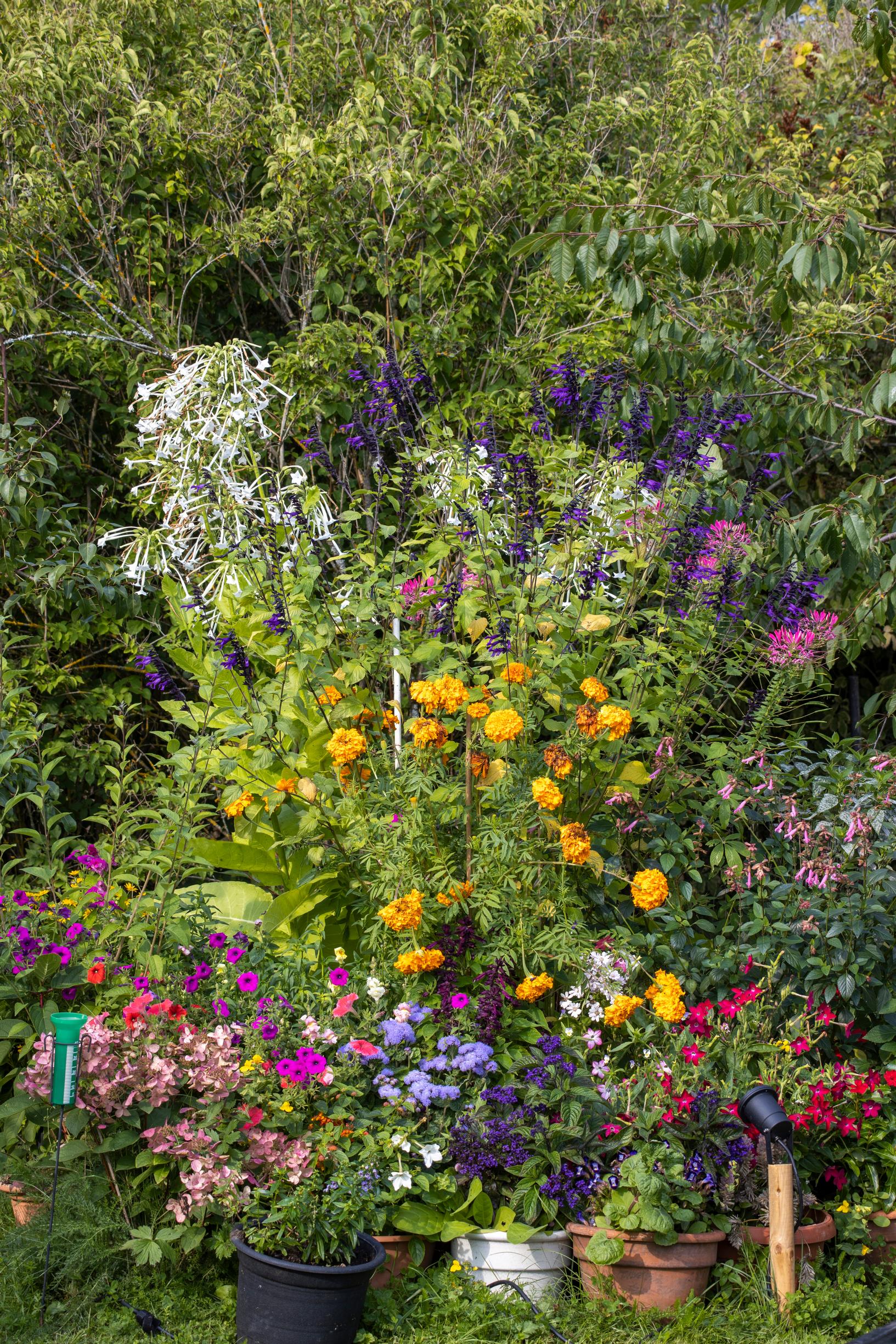 Tavoittelen sopusuhtaisia kokonaisuuksia. Kasviryhmien täytyy olla väreiltään tasapainossa, ja kasvutapojen on sovittava yhteen. Ruukuista perustan isoja ryhmiä, joissa kasvit ovat vieri vieressä ja lopulta kasvavat toistensa lomaan. Ryhmän rakenne kuitenkin säilyy samana koko kesän, sillä voimakkaammat kasvit eivät voi vallata tilaa. Ryhmän keskelle laitan halkaisijaltaan 80-senttisiä ruukkuja, joihin istutan narsissitupakkaa, isokokoisia salvioita, risiiniä ja hämähäkinkukkaa. Reunassa oleviin 30-senttisiin ruukkuihin pääsevät esimerkiksi heliotrooppi, ahkeraliisa, petunia, sinitähtönen ja kesäkaulus.