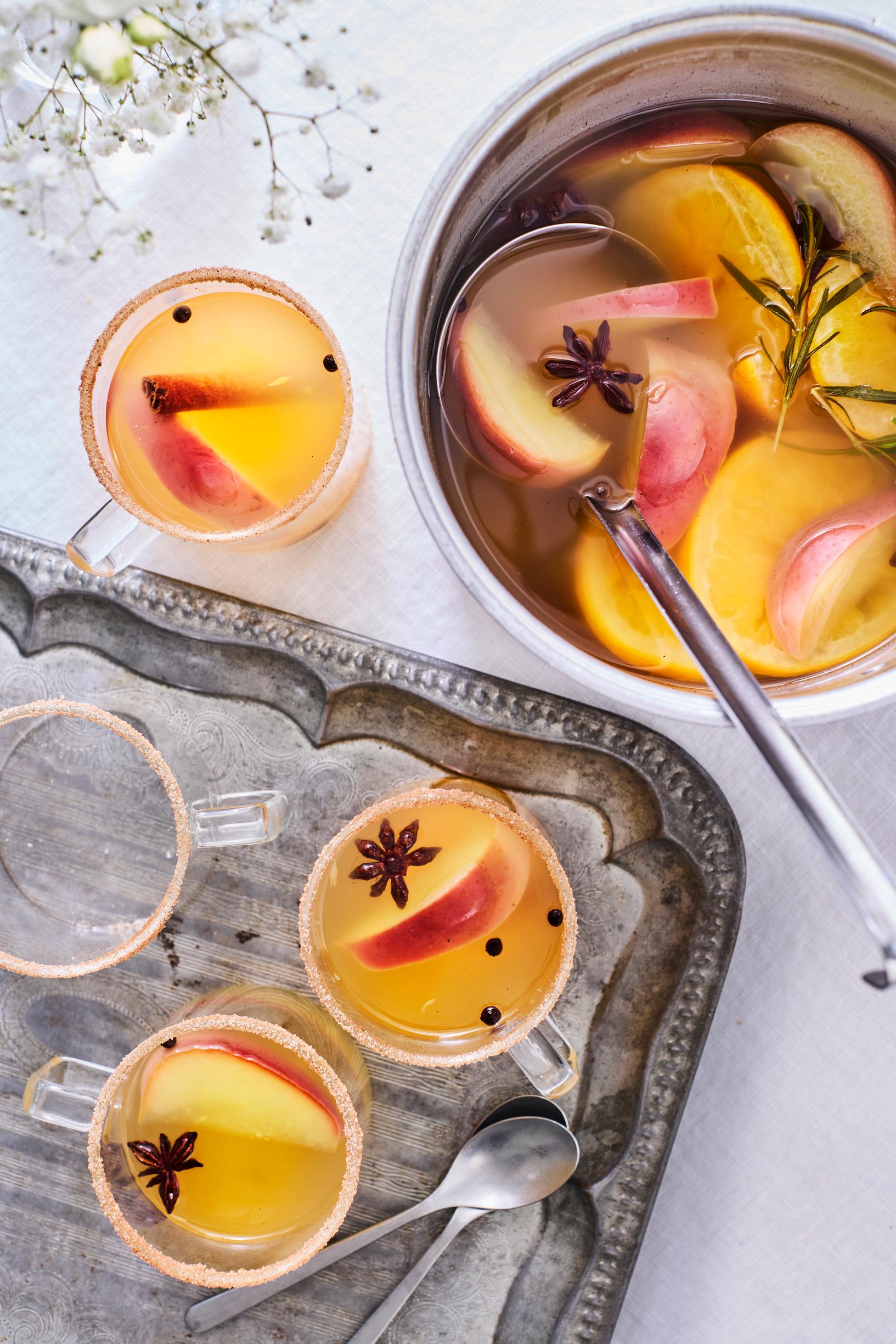 Mulled ciderin eli siideripohjaisen glögin tyyliin valmistettuun lämpimään siideriin saa upotettua joulun ajalta yli jääneet mausteet. Kanelisokerireunus piristää lasien reunaa.
