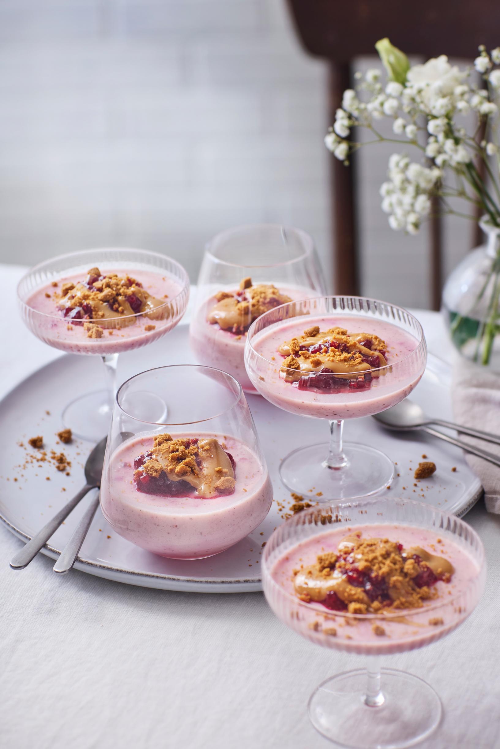 Puolukkapannacotta maustetaan soseutetulla puolukalla ja tarjotaan puolukkahillokkeen kanssa. Jälkiruoan viimeistelevät kinuskikastike ja keksimurut.