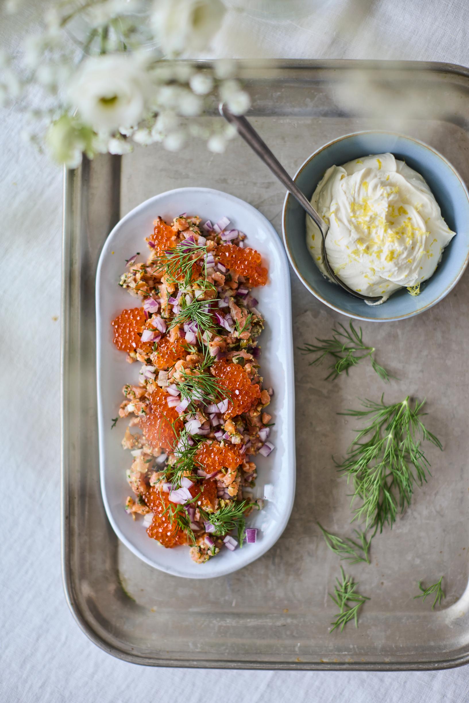 Kylmäsavulohitartar on vartissa valmis juhlapöydän herkku. Kuutioidun kylmäsavulohen makua täydentävät mäti, sipuli, kaprikset, tilli ja pehmeäksi vaahdotettu sitruunasmetana.