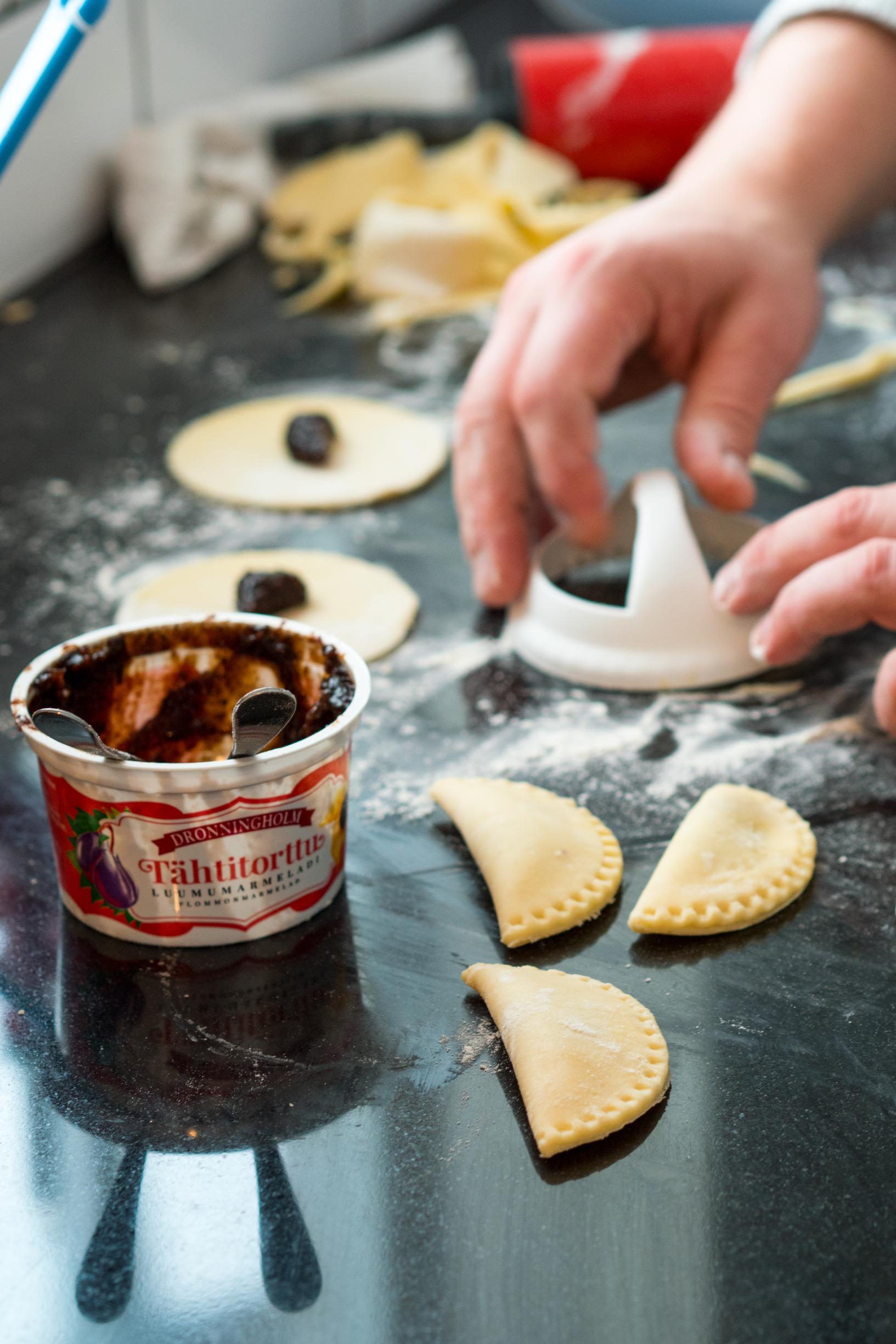 - Ota torttutaikinasta pyöreällä muotilla paloja ja laita pyörylöiden keskelle luumumarmeladia.