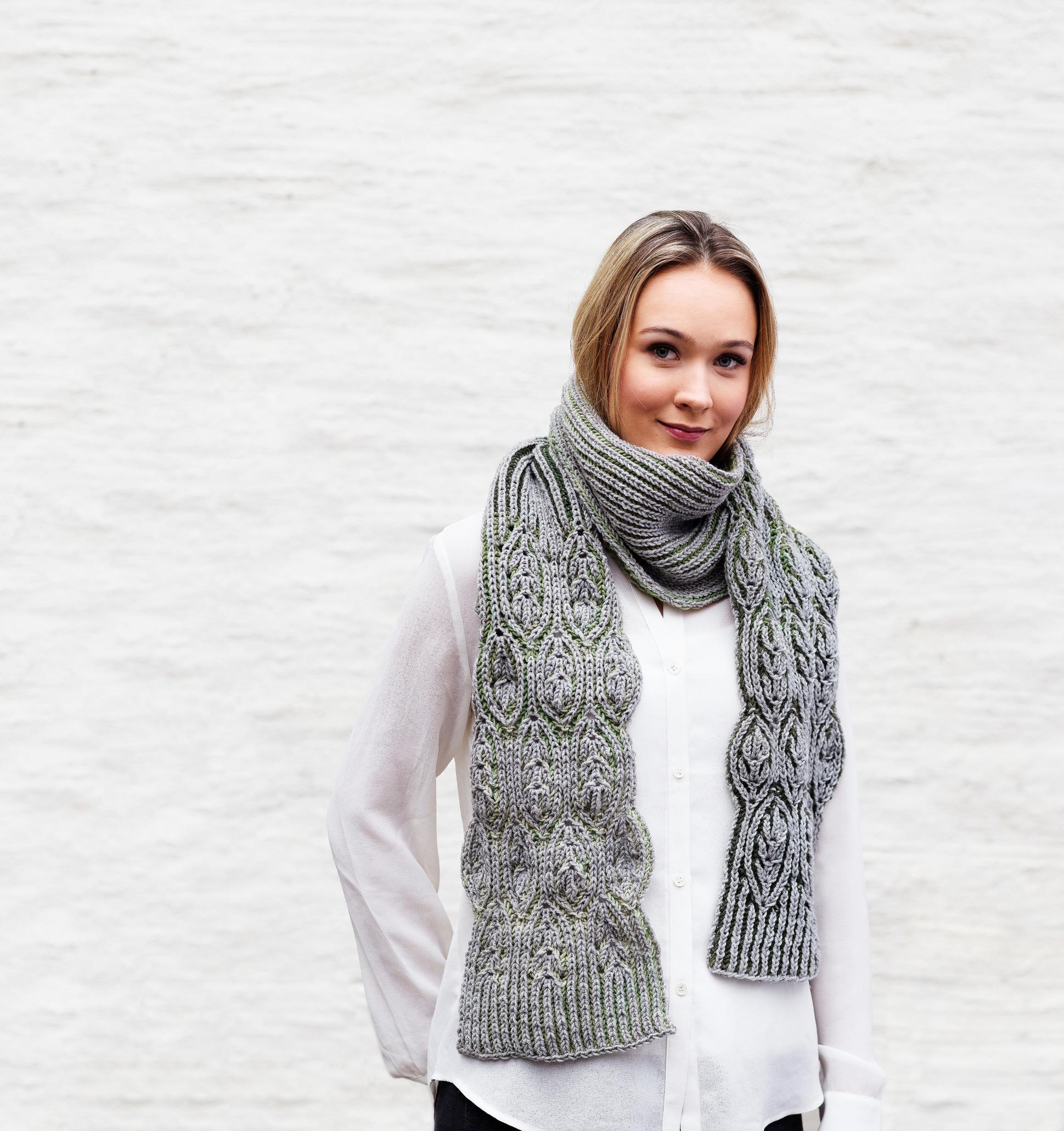 Briossihuivin lehtikuviot tehdään eläväisellä briossineuleella. Briossineuleen jujuna on tehdä neulos kahdella eri langalla, jolloin tuloksena on kaksivärinen patenttineulepinta. Yhdistä harmaaseen oma lempivärisi!
