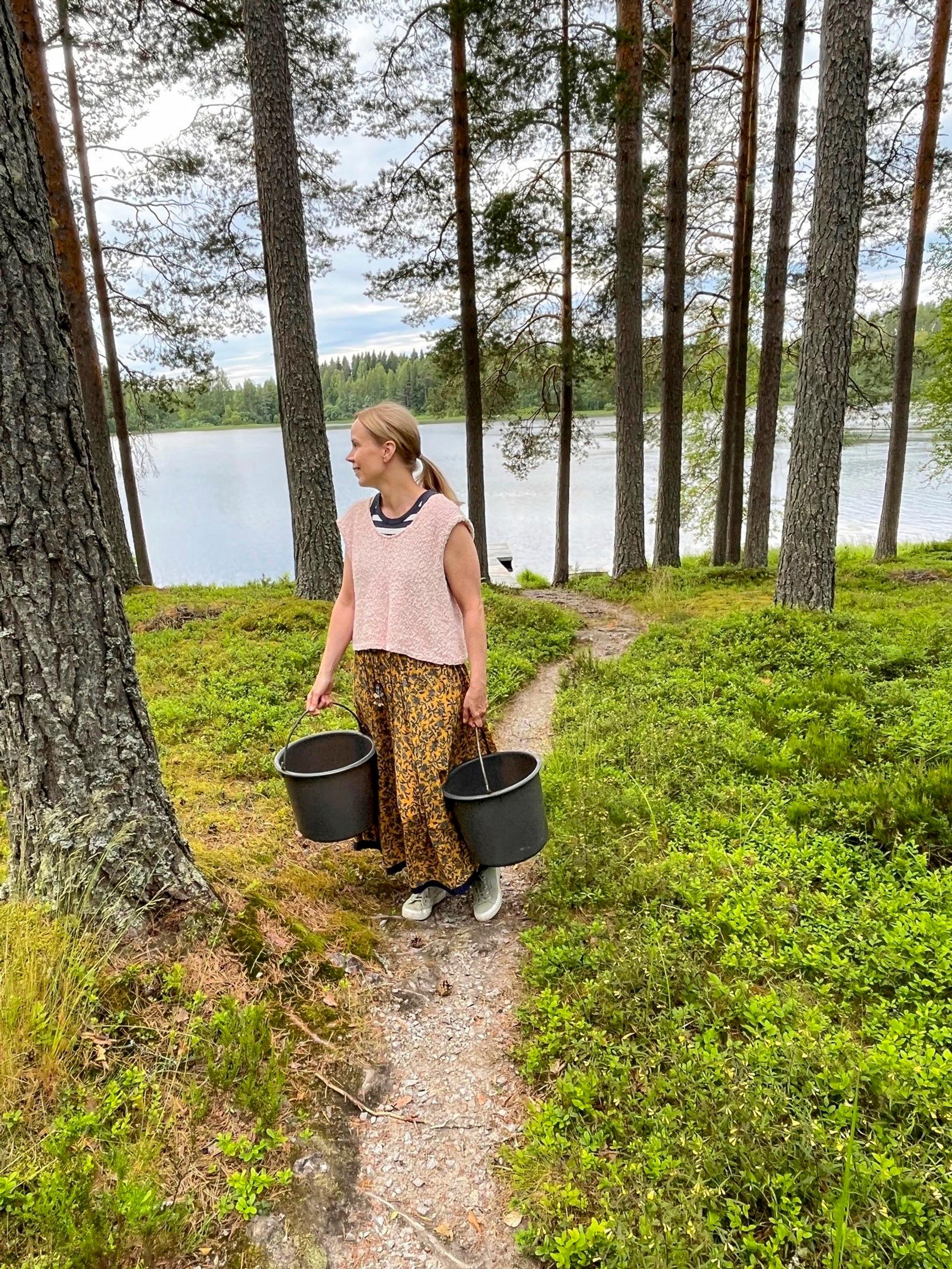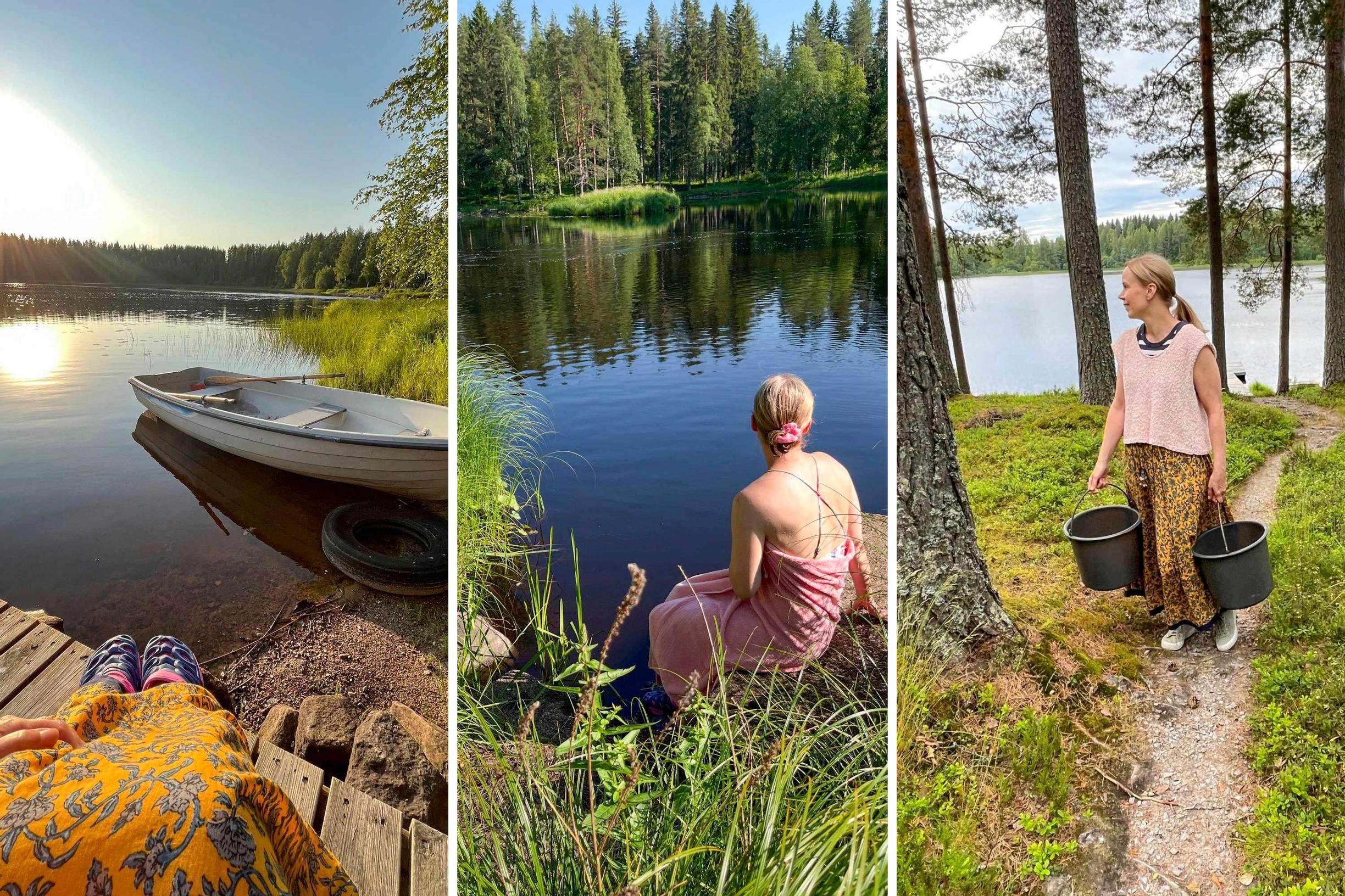Kapea metsätie johtaa kohti niemenkärkeä. Mieleni alkaa rauhoittua jo autossa, koska tiedän, että olen saapumassa suosikkipaikkaani. Olen viettänyt mökillämme kesät ja joulut lapsesta asti. Täällä saan palata perusasioiden äärelle. Ei turhia härpäkkeitä, kuten juoksevaa vettä, sisävessaa ja suihkua.