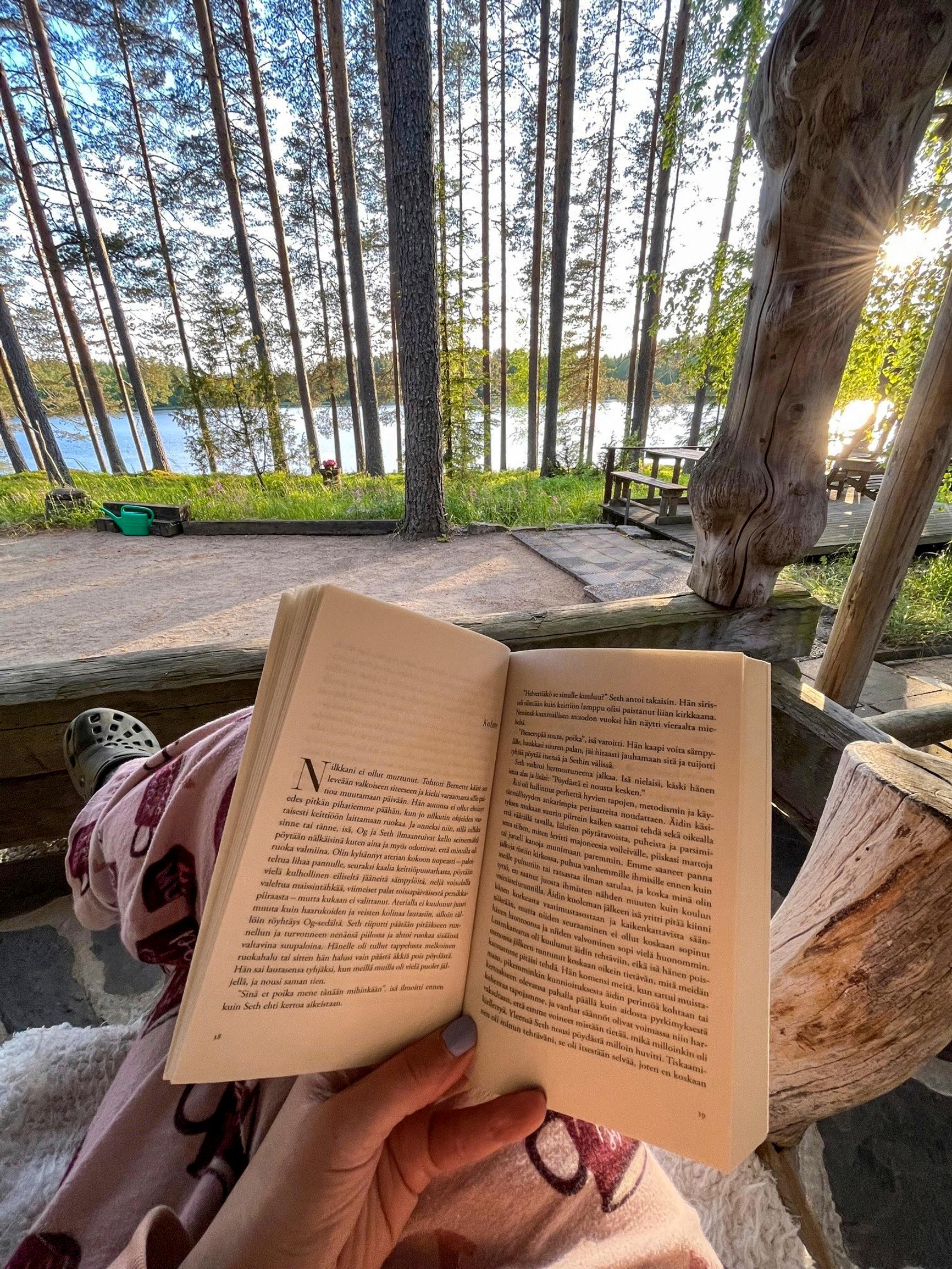 Vedän villasukat ja crocsit jalkaan ja asetun mukavasti pihakeinuun kirjan ja kahvikupillisen kanssa. Koivunlehdet havisevat tuulessa, linnut visertävät ja virta solisee. Miten täydelliset olosuhteet uppoutua tarinaan!