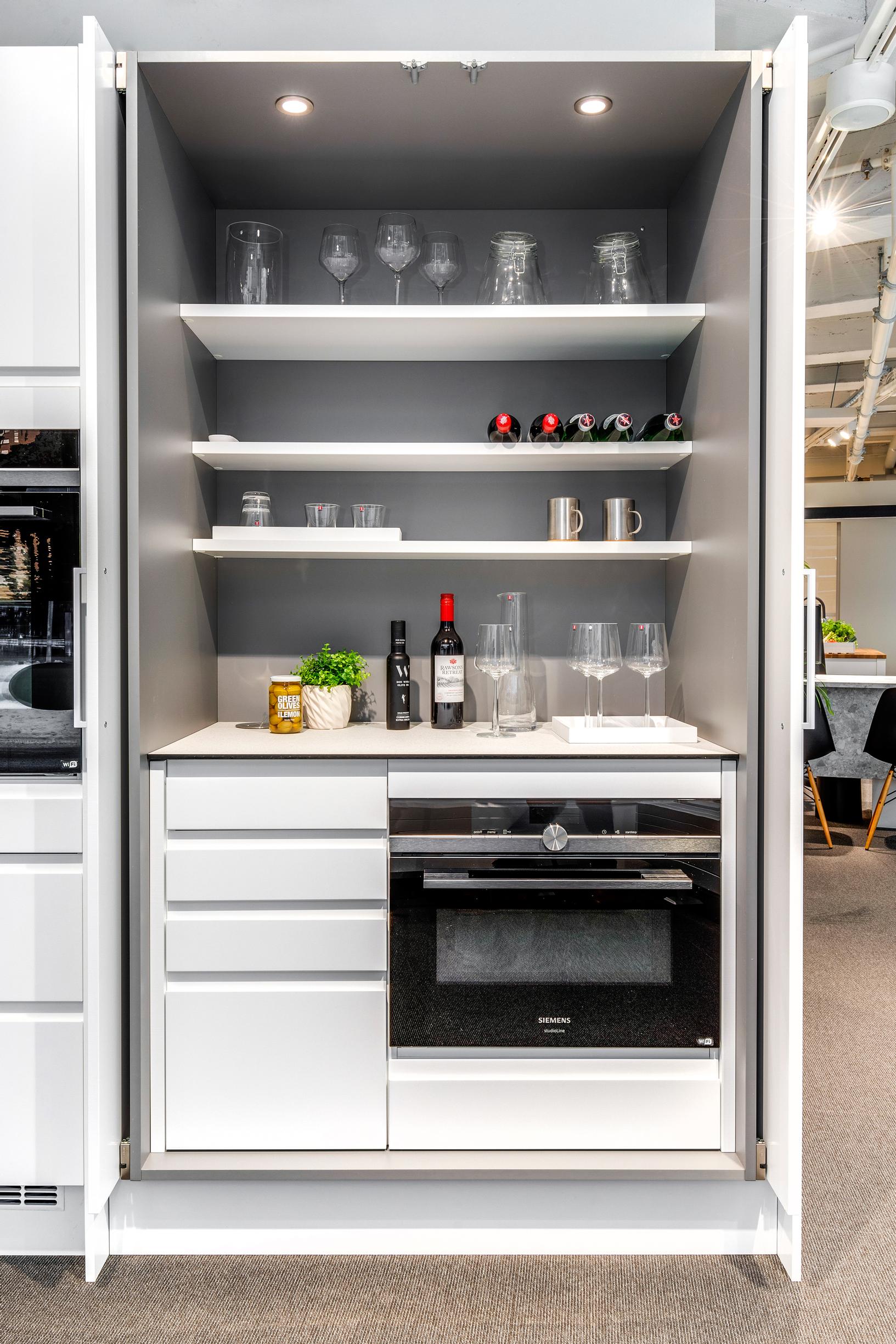 A la Carten Urban-keittiön sähköisesti nousevalla ja laskevalla kulmamekanismilla sekä Found-seinäkaapilla kodinkoneet ja muut keittiön tavarat saa helposti piiloon ja esille.