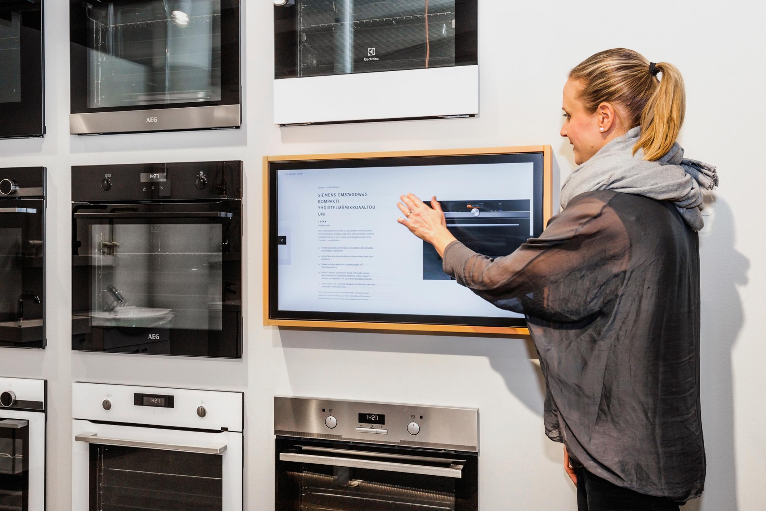 Myös kodinkoneet, altaat ja hanat on koottu myymälässä selkeästi yhteen paikkaan. Esillä on muutamia suosituimpia laitteita, mutta koko valikoimaan voi tutustua kosketusnäytöillä, joilla valikoimasta on helppo valita omat suosikit vertailtaviksi.