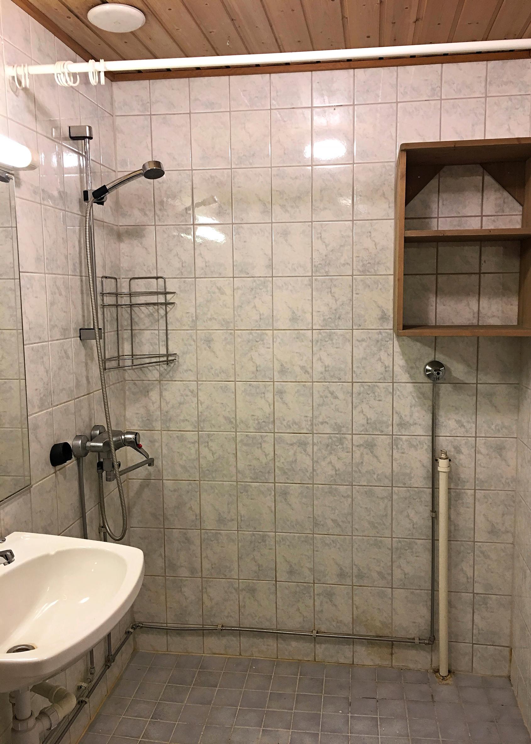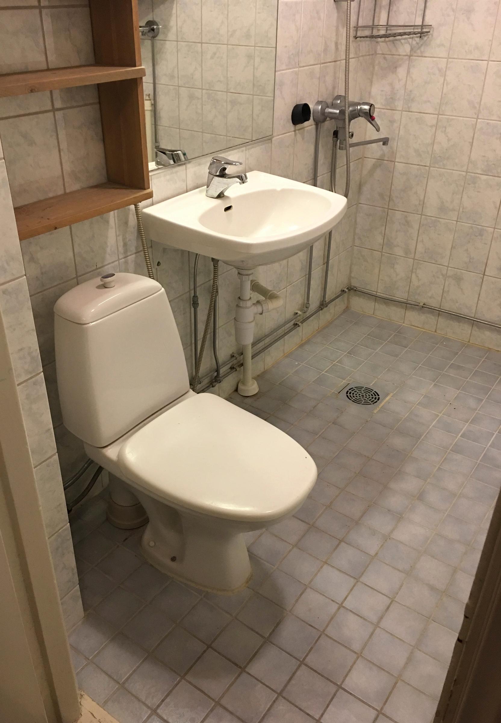 Edullinen kylpyhuoneremontti tasoitteilla – kulahtanut kylppäri uudistui valoisaksi ja toimivaksi parin tonnin pikarempalla