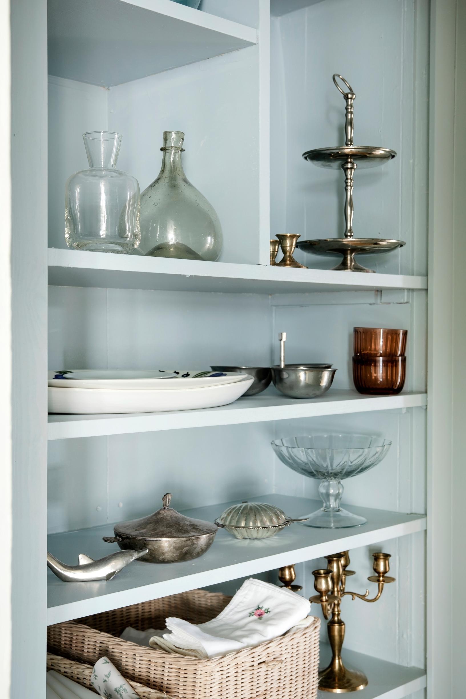 Astiakaappisyvennyksen utuisen siniharmaa sävy on Tikkurilan X438 Salaisuus. Tilassa oli alun perin kulahtanut 60-luvulla rakennettu hyllykkö. Eeva paikkasi ja maalasi hyllyn ja rakensi siihen peilikehykset äitinsä kanssa.