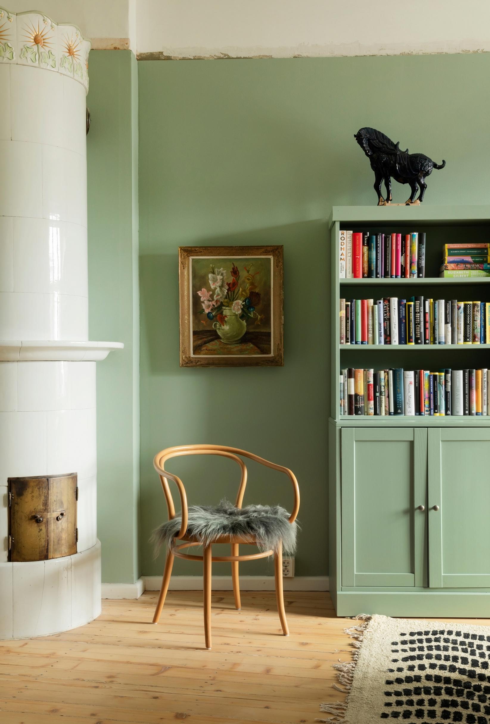 Yhdistettyä ruokailuhuonetta ja kirjastoa Eeva kutsuu vihreäksi salongikseen. Remontissa salongin seinät maalattiin ja lattia hiottiin ja käsiteltiin öljyllä. Seiniin on vielä etsinnässä sopiva koristelista. Eeva rakastaa vihreän salongin vanhaa, koristeellista kakluunia, jollaisesta hän unelmoi pitkään. Ton-tuoli on Torista ja taulu kirppikseltä. Tang-tyylinen hevospatsas löytyi Facebookin kierrätysryhmästä. Yllättäen siitä on tullut yksi Eevan lempitavaroista.