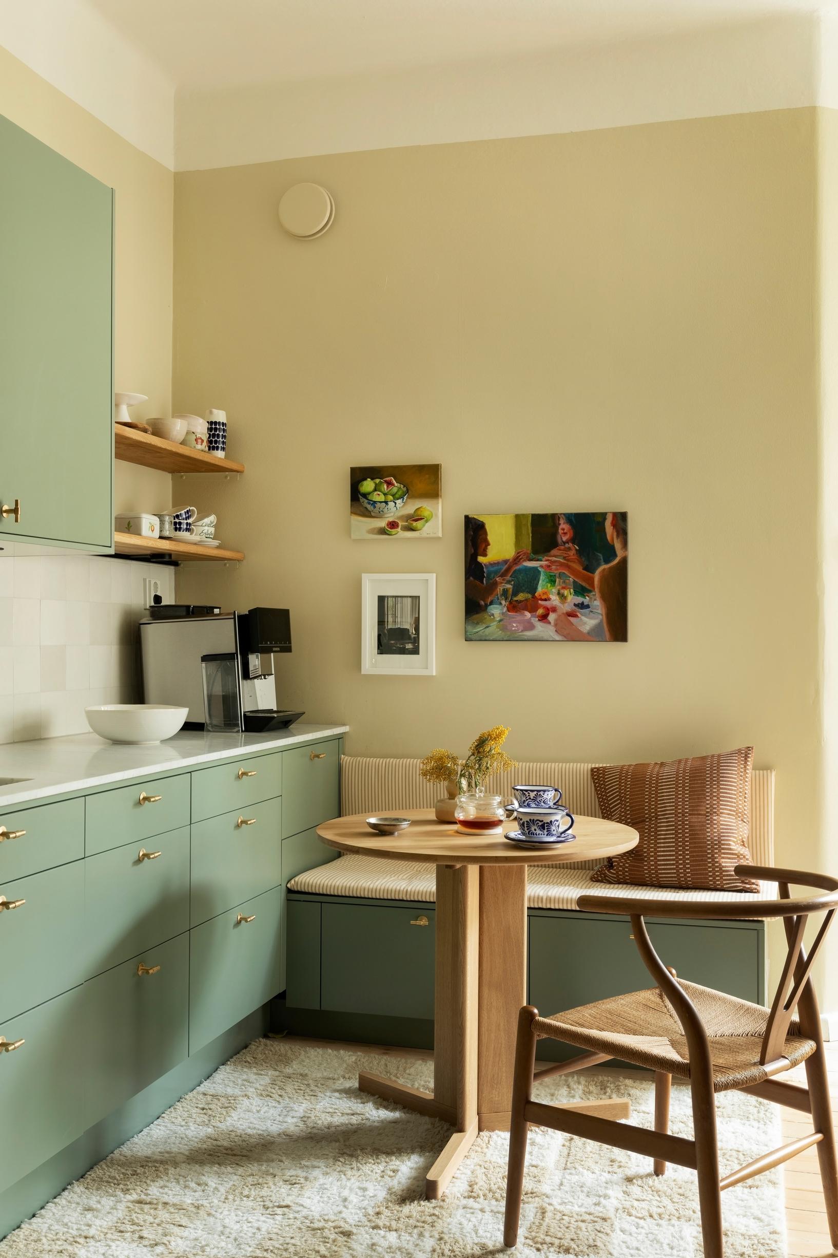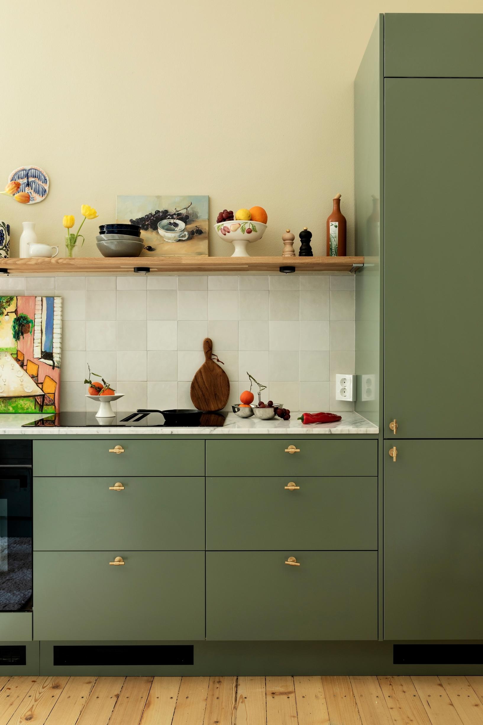 Eeva halusi ehdottomasti salvianvihreän keittiön, jonka toimitti Epoq. Myöhemmin Eeva huomasi, että väri oli jäänyt hänen mieleensä kodin rappukäytävästä. Tyypillinen jugendsävy istuu asuntoon hyvin. Pehmeä beige seinässä on Teknoksen Lagom T1659. Avohyllyt Eeva on tehnyt itse. Työtaso on marmoria ja välitilan laatat Värisilmästä.