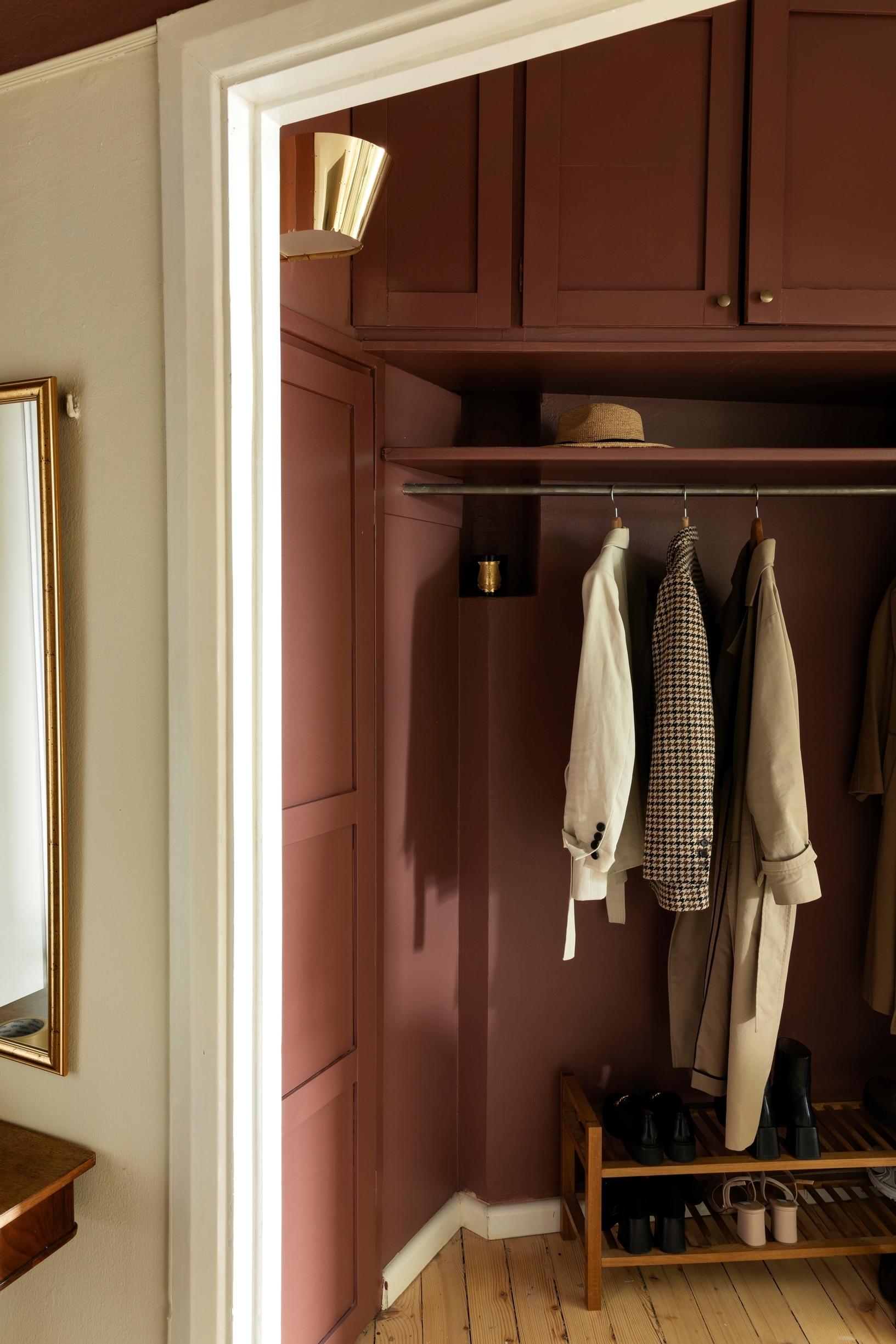 Isosta eteisestä avautuvat näkymät kodin kaikkiin huoneisiin, pikkueteinen taas on lähinnä läpikulkua ja ulkovaatteiden säilytystä varten. Eevalla oli kotia remontoidessa himo tummaan burgundiin ja syvääkin syvempään laivastonsiniseen sekä vihreän eri sävyihin. Pikkueteiseen hän valitsi burgundin sävyn. Koskaan hän ei ole kyllästynyt yhteenkään intuitiolla valitsemaansa maalisävyyn. Sen sijaan liian latteat tai varovaiset valinnat ovat aina harmittaneet jälkikäteen.