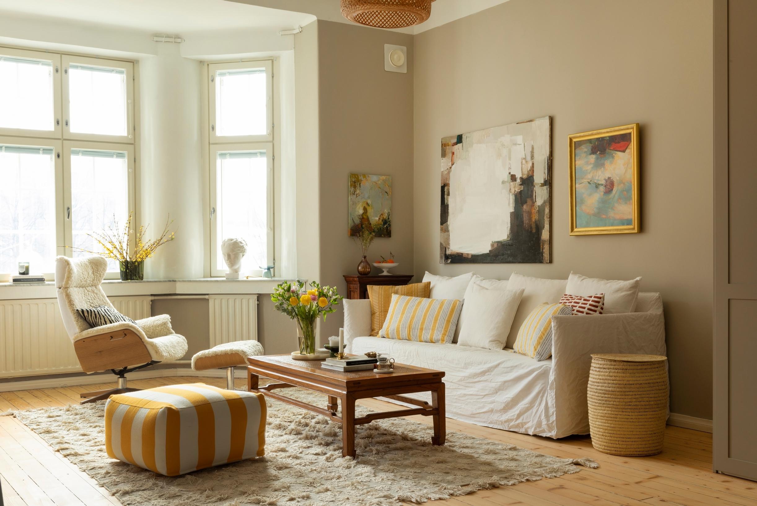 Yksi Eevan lempiasioista on olohuoneen itään avautuvat ikkunat. Remontissa vanha lankkulattia hiottiin. Entisen poikaystävän tekemä patsas on kulkenut Eevan mukana vuosikausia. Iskun nojatuoli raheineen valikoitui lukupaikaksi puhtaasti istuinmukavuuden perusteella. Siitä näkee sekä kotiin että ulos. Vanha kiinalainen sohvapöytä on Bukowskisilta. Sohva, Gervasoni. Sisustustyynyt, Artek. Raitarahi, Hakola. Matto, Anno. Maalaukset ovat Eeva-Kaisa Takalan ja iso Marianne Niemisen. Pionitaulu on kirpputorilta.