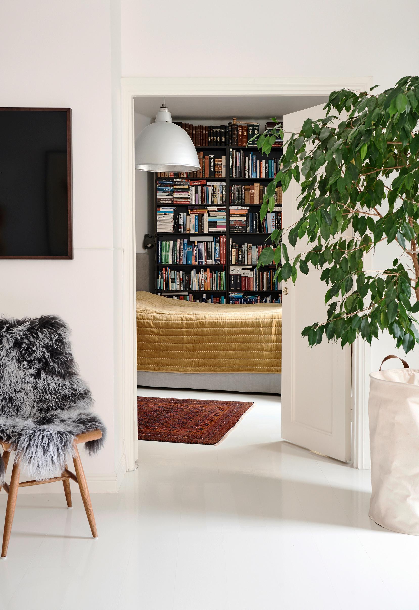 Taiteen ohella kirjat ja musiikki ovat keskiössä tässä kodissa. Aiemmin toinen makuuhuoneista oli pyhitetty yhdistetyksi kirjasto- ja ruokailutilaksi. Kun makuuhuoneita tarvittiin vauvan synnyttyä kaksi, ruokailutila yhdistettiin olohuoneeseen ja vanhemmat saivat oman makuutilan.
