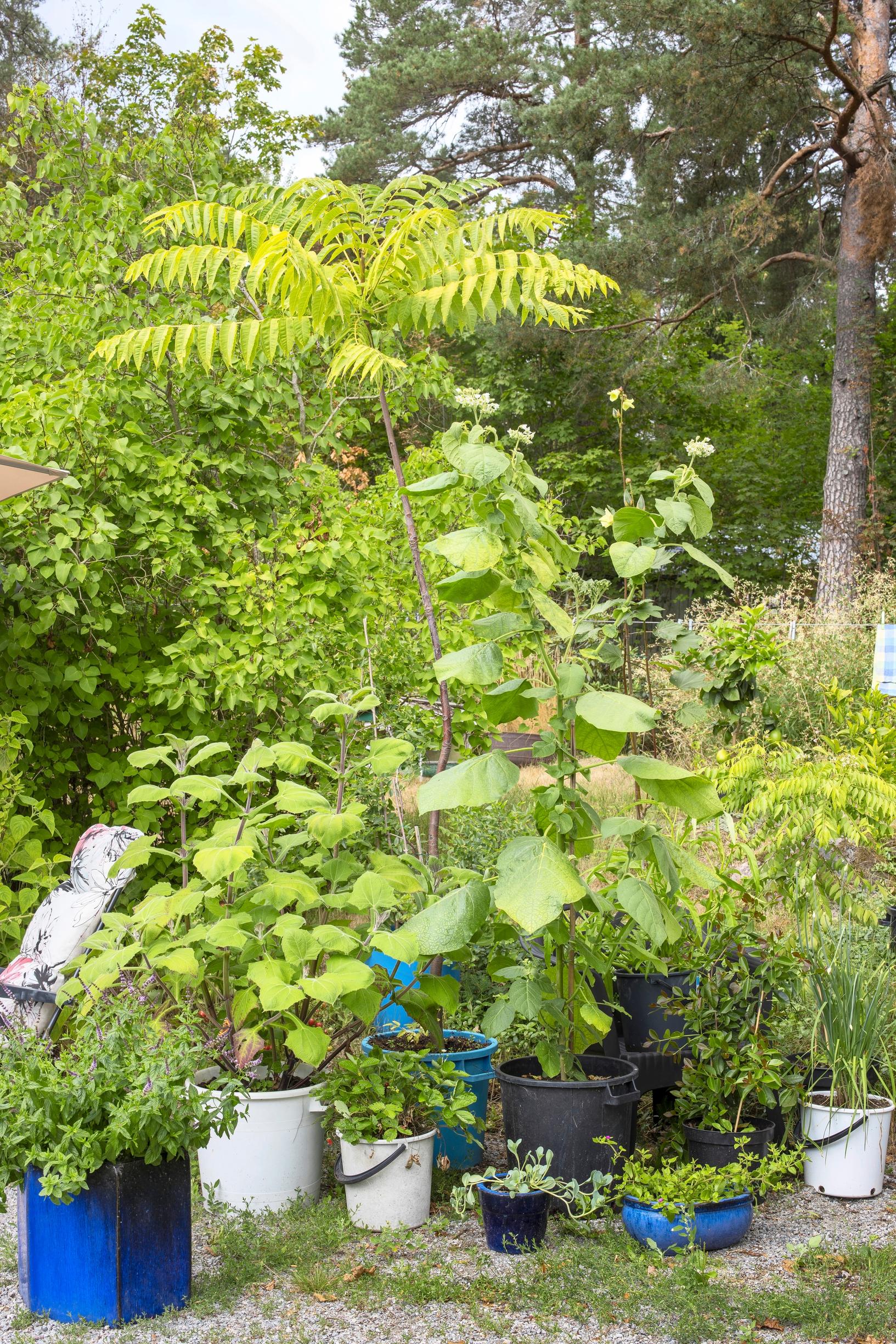 Suotuisalla kasvupaikalla eteläisetkin lajit voivat pärjätä ulkona vuoden ympäri. Maryn viikunapuu on talvehtinut Tammisaaressa pihalla jo pari vuotta. Seuraavaksi hän testaa kolmilehtisitrusta (Citrus trifoliata). Se kasvaa ihan kotitalon seinän vieressä paikassa, joka jää talvella sopivasti täysin kuivaksi.