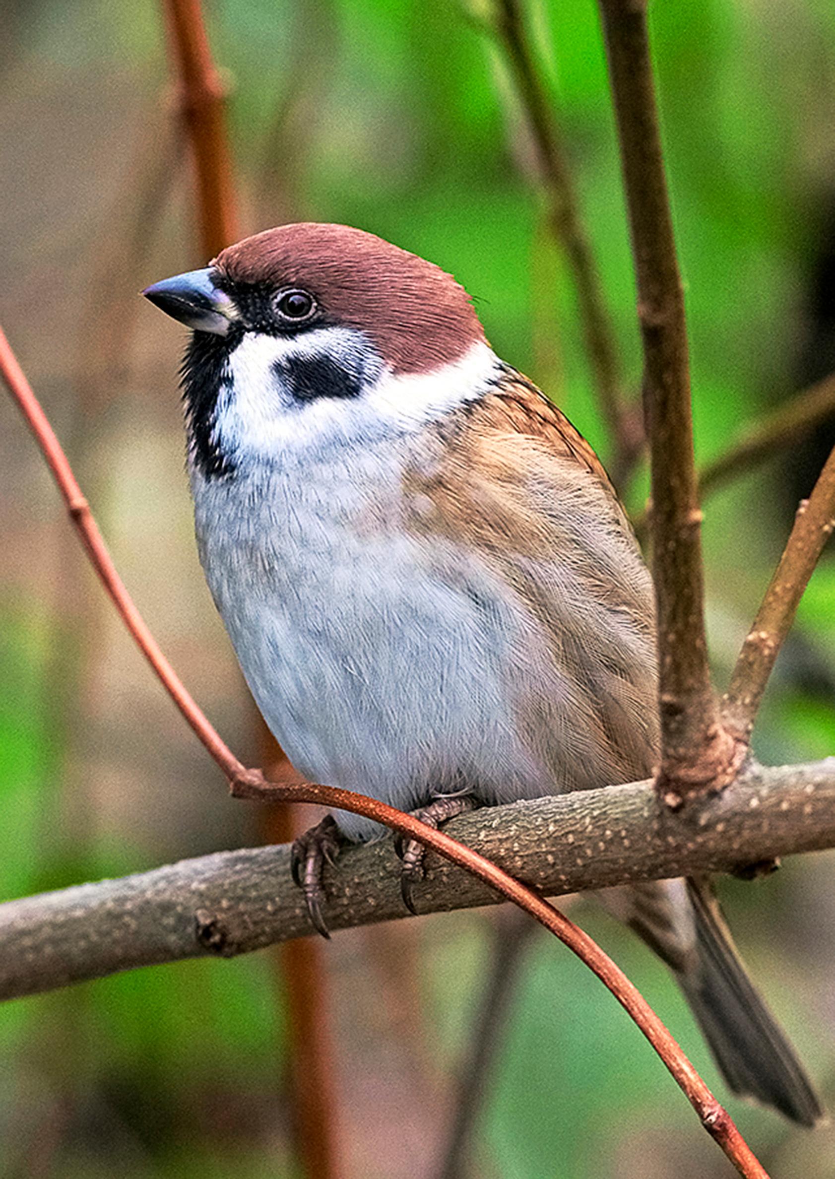 Tuntomerkit: Ruskea, etenkin päälaki puhtaan ruskea. Poskessa musta laikku valkealla pohjalla. Äänet iloisia ja sointuvia. Aavistuksen varpusta pienempi.