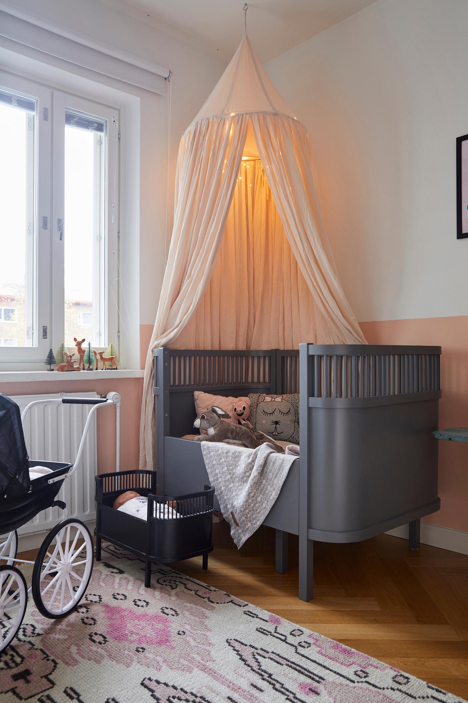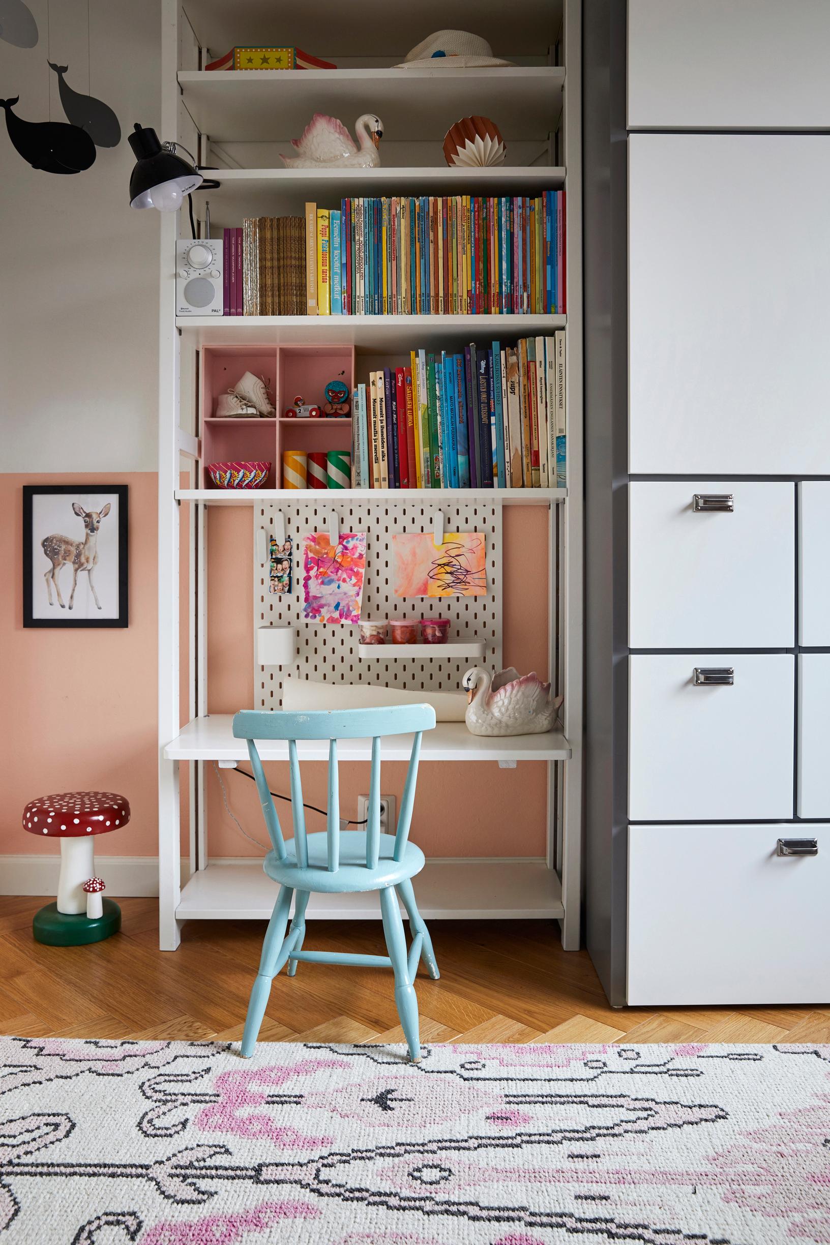 Leluja on pitkin ja poikin. Alle metrin korkeudella ei voi pitää mitään särkyvää. Korkea lukollinen senkki on ollut loistava. Sinne ja kirjahyllyn ylähyllyille saa tavaraa lapsen ulottumattomiin. Matildan huoneessa halusin välttää lastenkalusteita ja -kuoseja, jotta ratkaisut kestävät aikaa. Lastenhuoneessakin saa olla vintagea!
