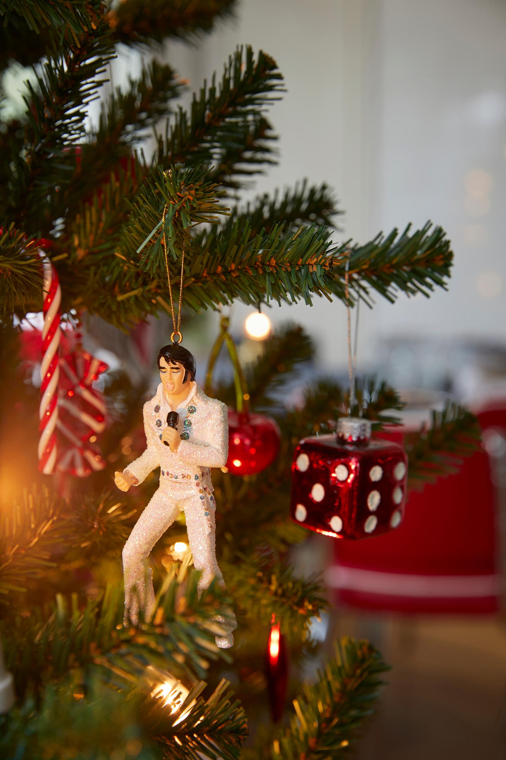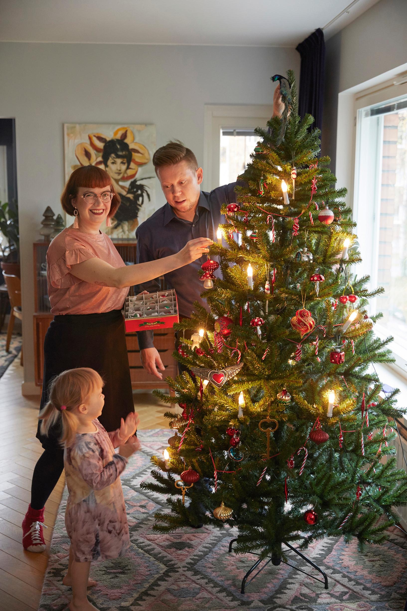 Meillä on paljon amerikkalaistyylisiä koristeita, kuten överit, runsaat kranssit ja joulusukat. Vanhan malliset lasipallot toimme Yhdysvalloista. Kimalteva Elvis Key Westistä pääsee aina kuusen parhaalle paikalle. Kun Elviksen Blue Christmas alkaa rahisten vinyyliltä, tulee jo ensimmäisistä nuoteista joulufiilis. Meillä on tekokuusi, koska emme ole koskaan jouluna kotona.