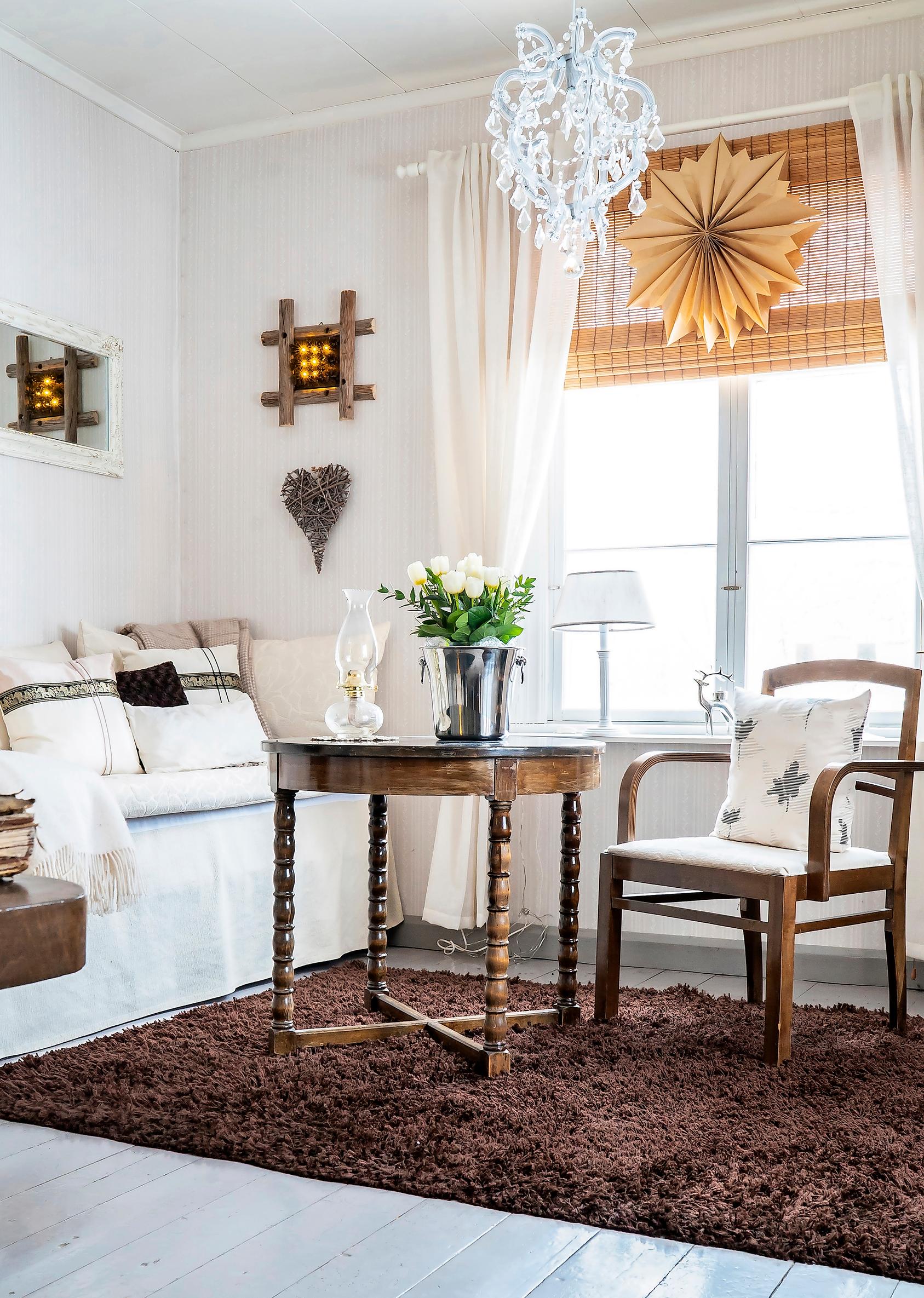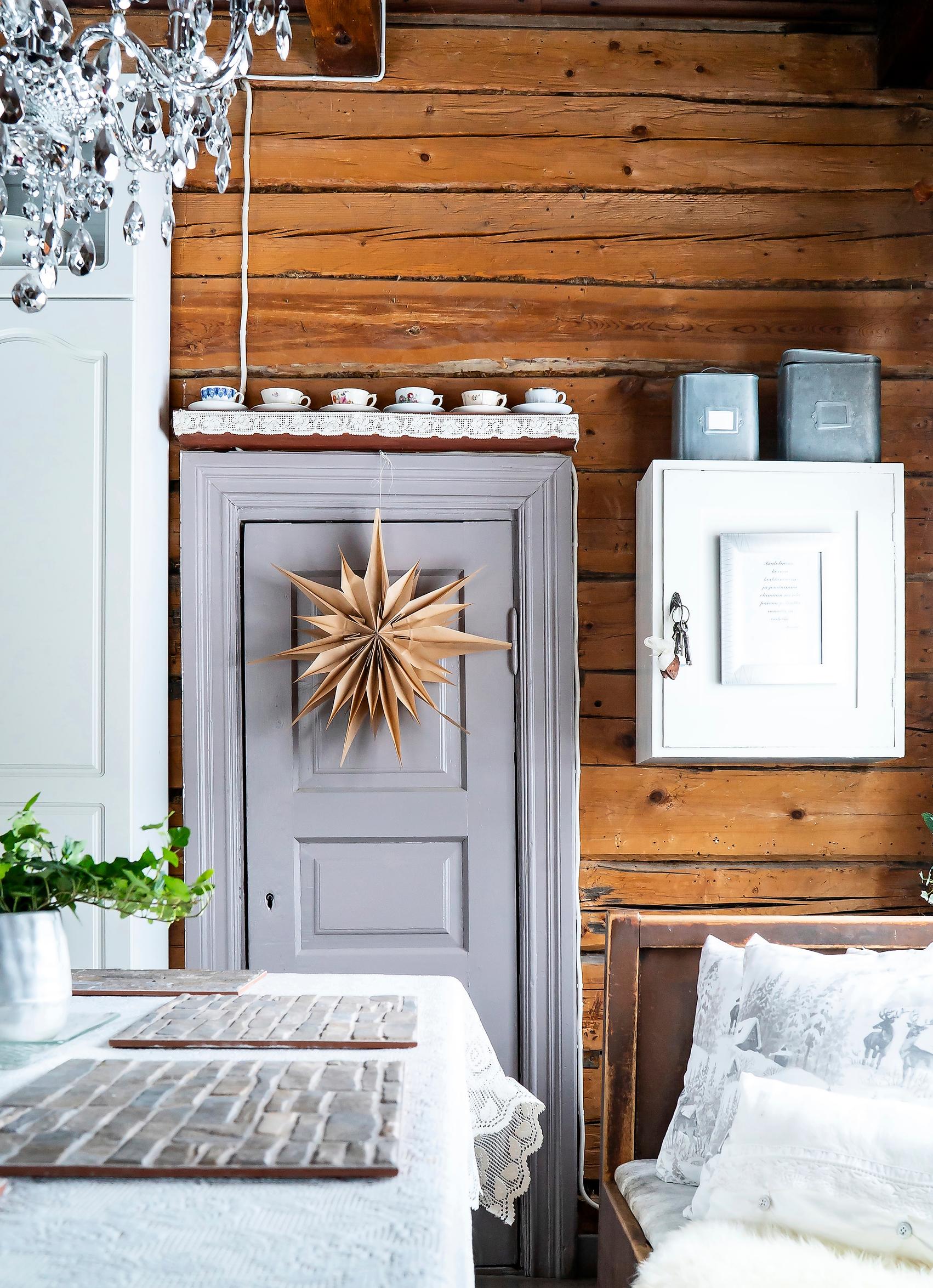 Mökin sisustamisen kultaisena sääntönä on ollut elämän jälki. Se saa näkyä kaikessa ja kaikkialla. Suurin osa kalusteista on ollut talossa aina. Yksi pöydistä on Elisan äidin pelastama, ja ilman uutta kotia se olisi joutunut polttopuuksi. Ystävän tuomia mökkilahjoja on seinillä ja pöytien päällä.