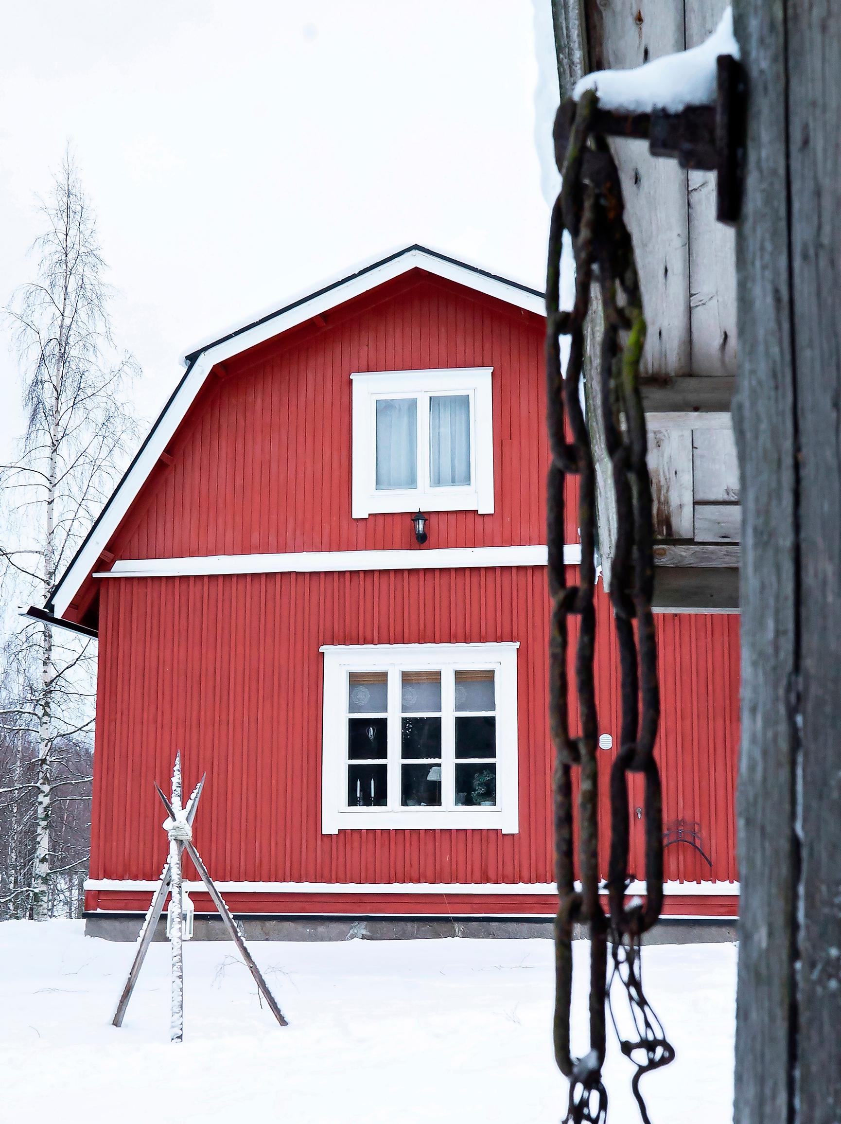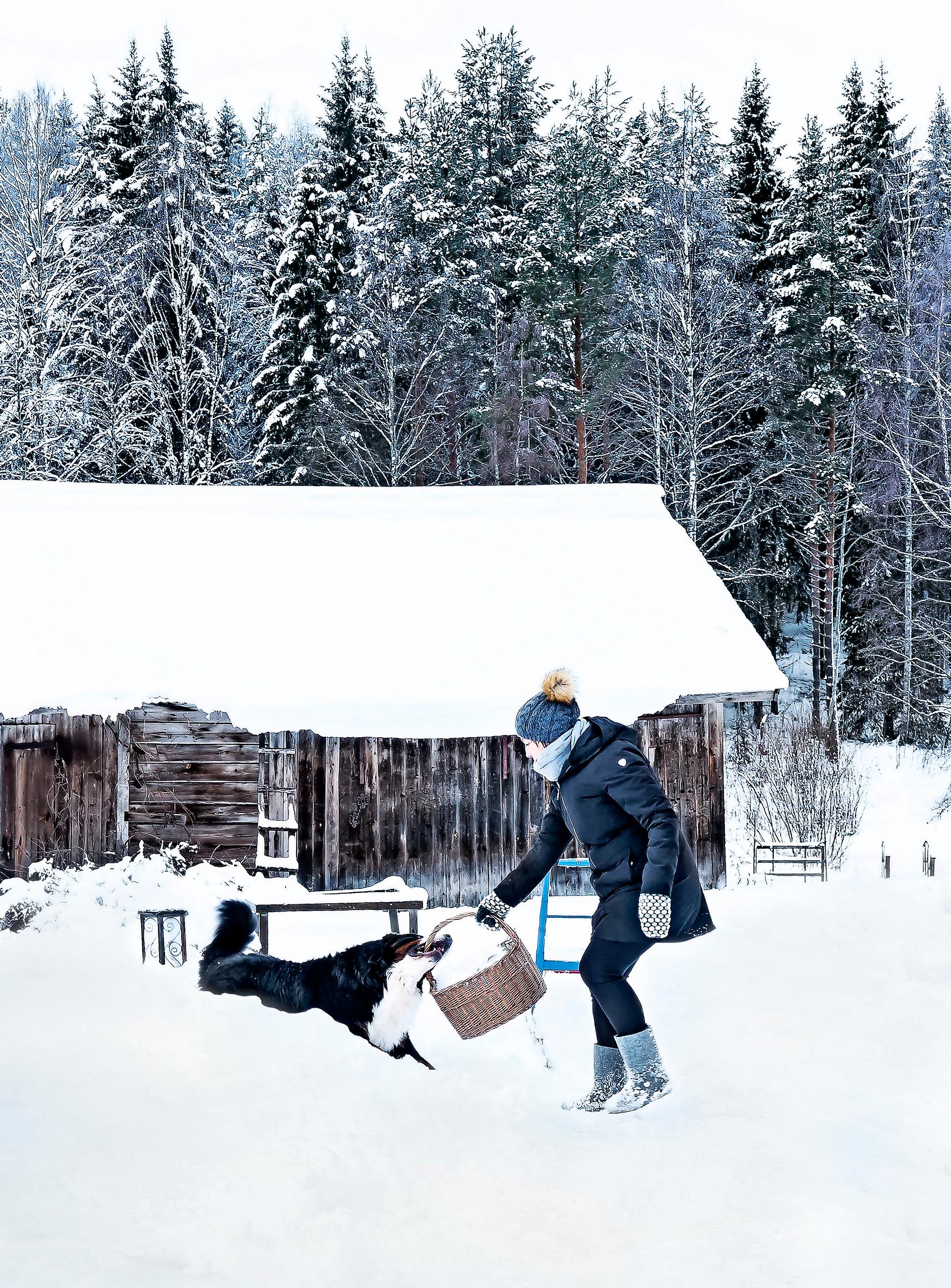 Mistä tietää, että Myllylät ovat mökillään? Punaisen, mansardikattoisen talon pihaan porhaltaa halki lumisten peltojen berninpaimenkoira Manu. Pian vanhan navetan takaa ilmestyvät esiin Elisa ja Arto potkureillaan. On aika kääntää kelkat kohti metsätietä, joka johtaa rantasaunalle.