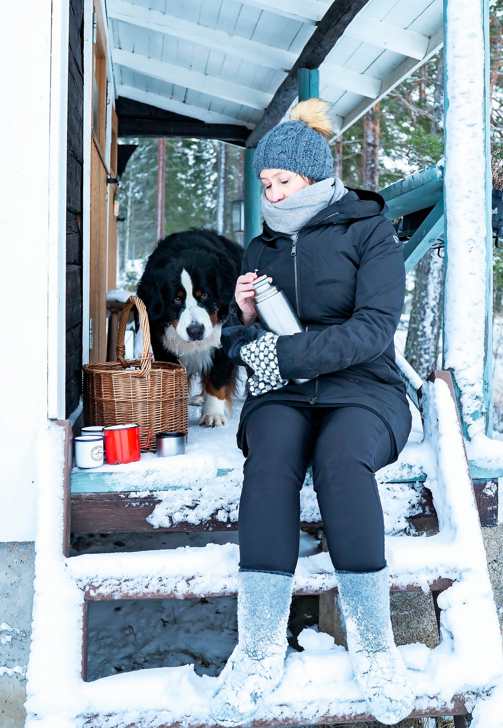 Saunamatka kruunautuu tänään höyryävällä glögillä. Elisan ja Arton eväspaikka on terassin päässä, josta portaat vievät järven jäälle. Kesäisin siitä voi pulahtaa suoraan raikastavaan viileyteen. Manun itsehillintä on pettämäisillään eväsleipien rapistelun yhteydessä.