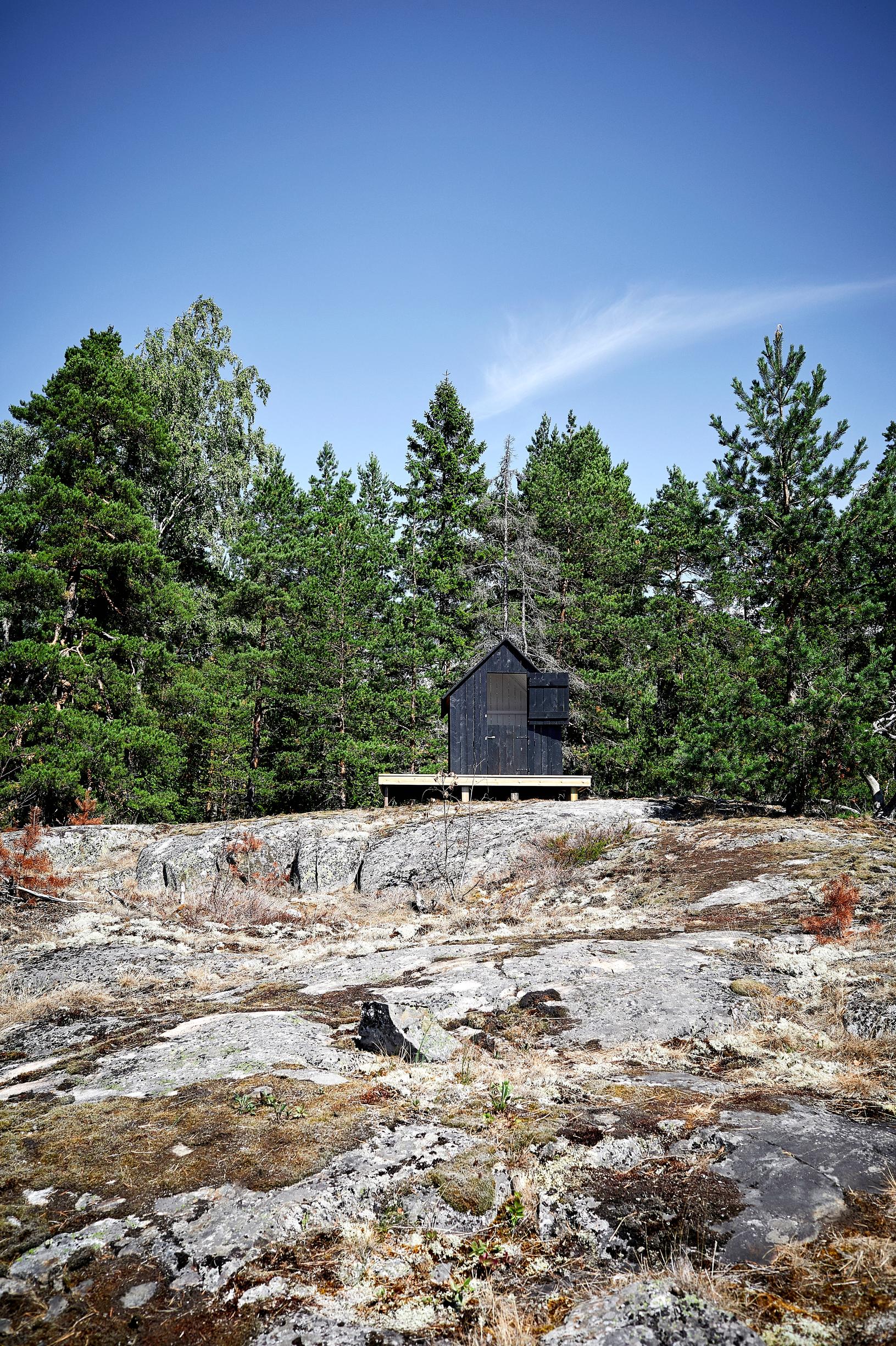 Aloitin projektin miettimällä sopivaa rakennuspaikkaa ja talon kokoa. Kaikki rakennukset kesäpaikassamme ovat mustia, joten musta oli luonteva värivalinta ulkopintaan. Isovaarini on 1960-luvulla suunnitellut perheelleen ulkosaaristoon Lingonsö-nimisen kesäpaikan, jossa on upea lasinen rakennus, Kappeli. Siellä koko perhe nauttii aina maisemasta ja hiljaisuudesta. Poimin sieltä vaikutteita ja toivon, että minunkin suunnittelemassani pienessä leikkimökissä olisi hyvä viettää aikaa. Maisema ainakin on saaren parhain. Lingonsö inspiroi myös saluunamaiseen oviratkaisuun. Halusin leikkimökille karun ja riisutun ilmeen.
