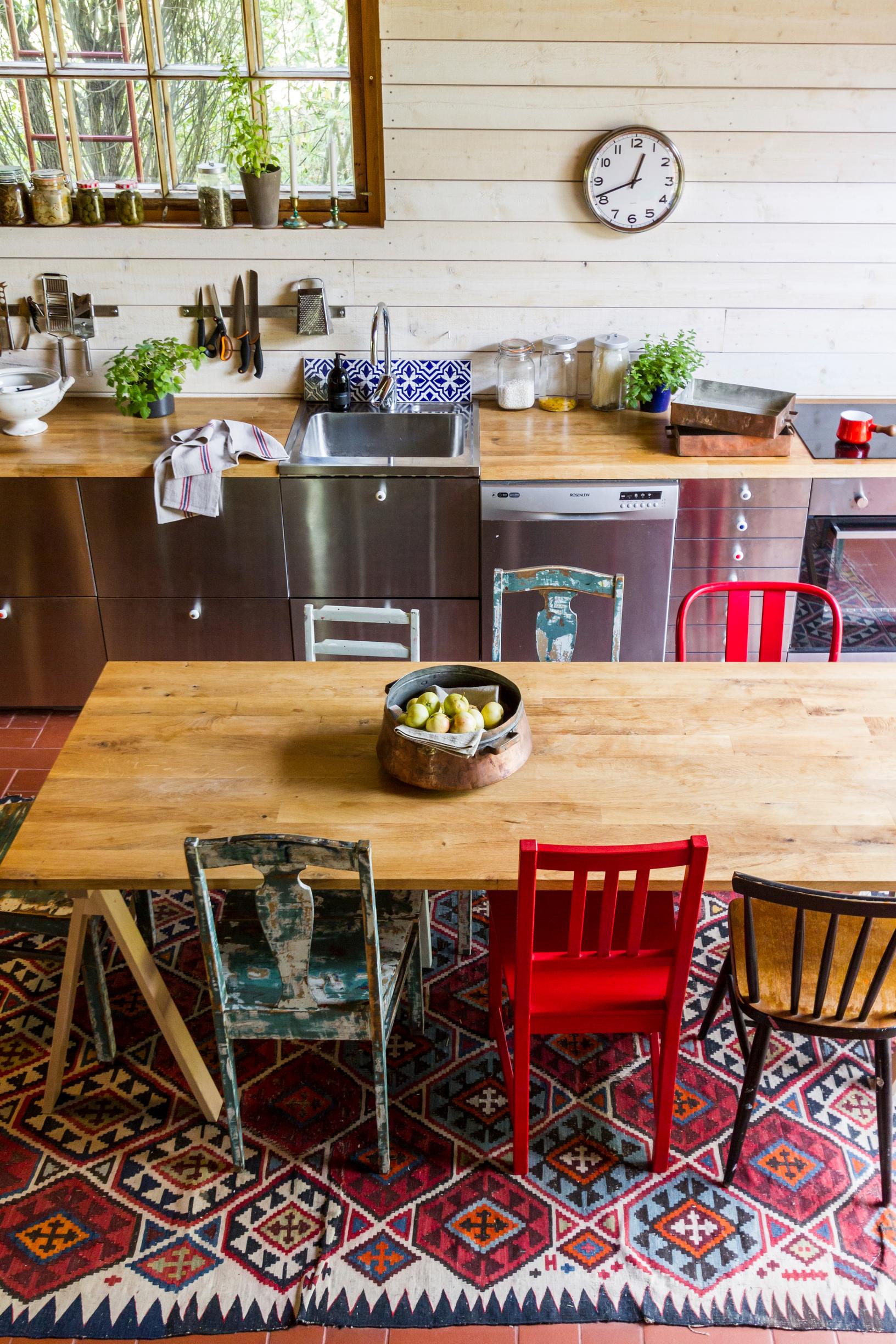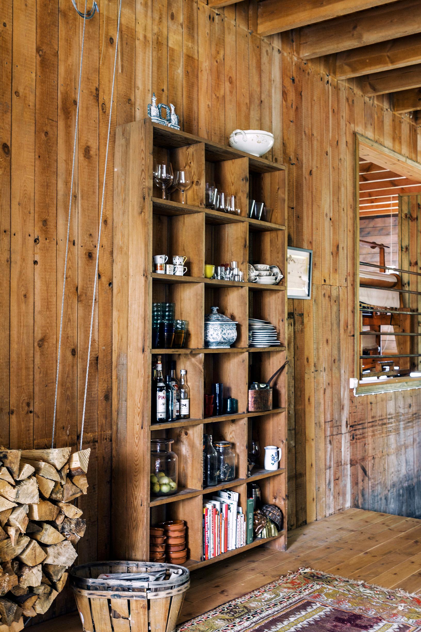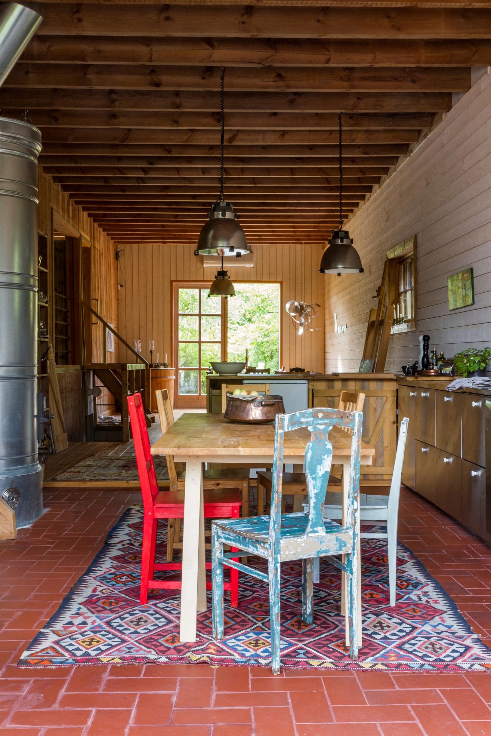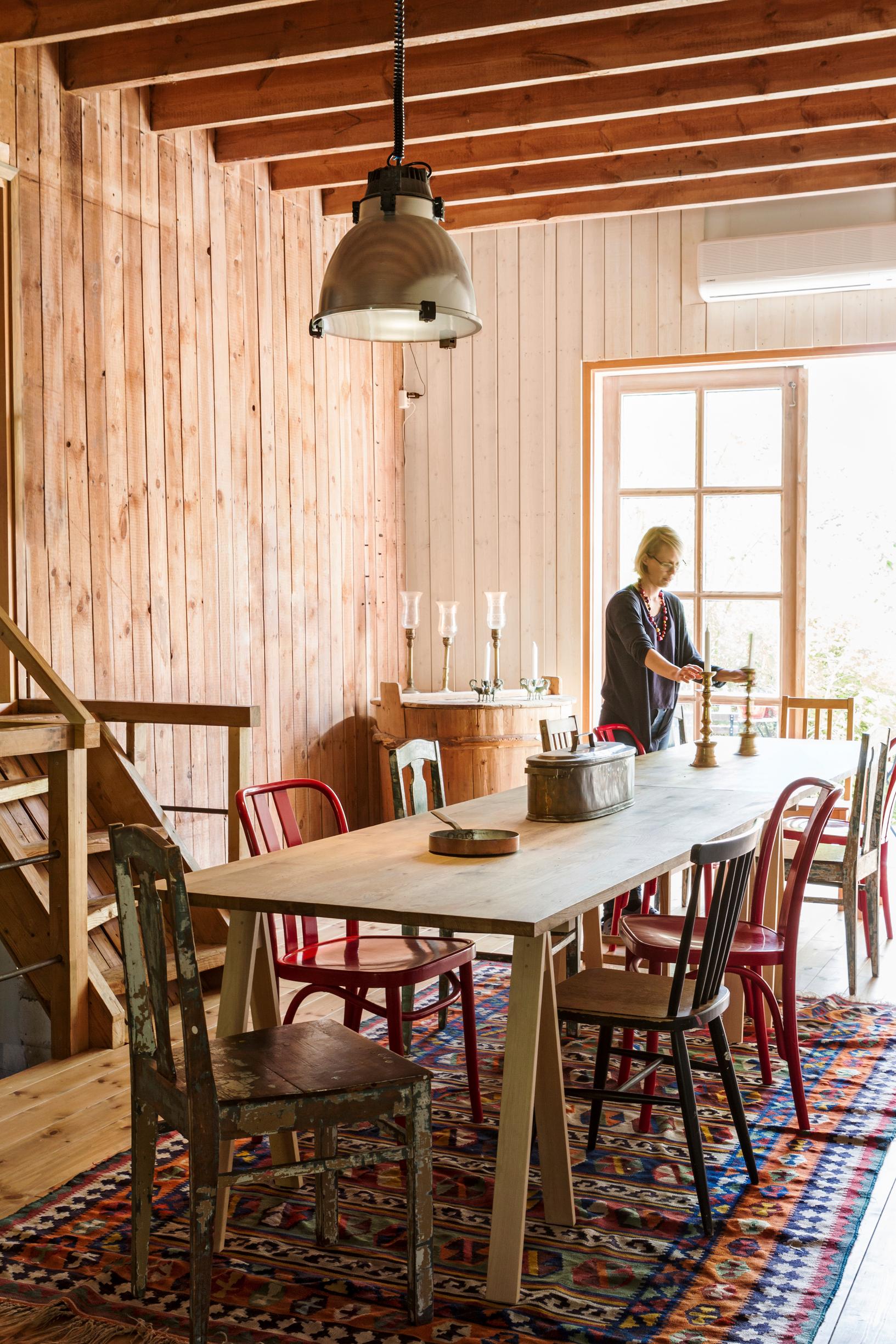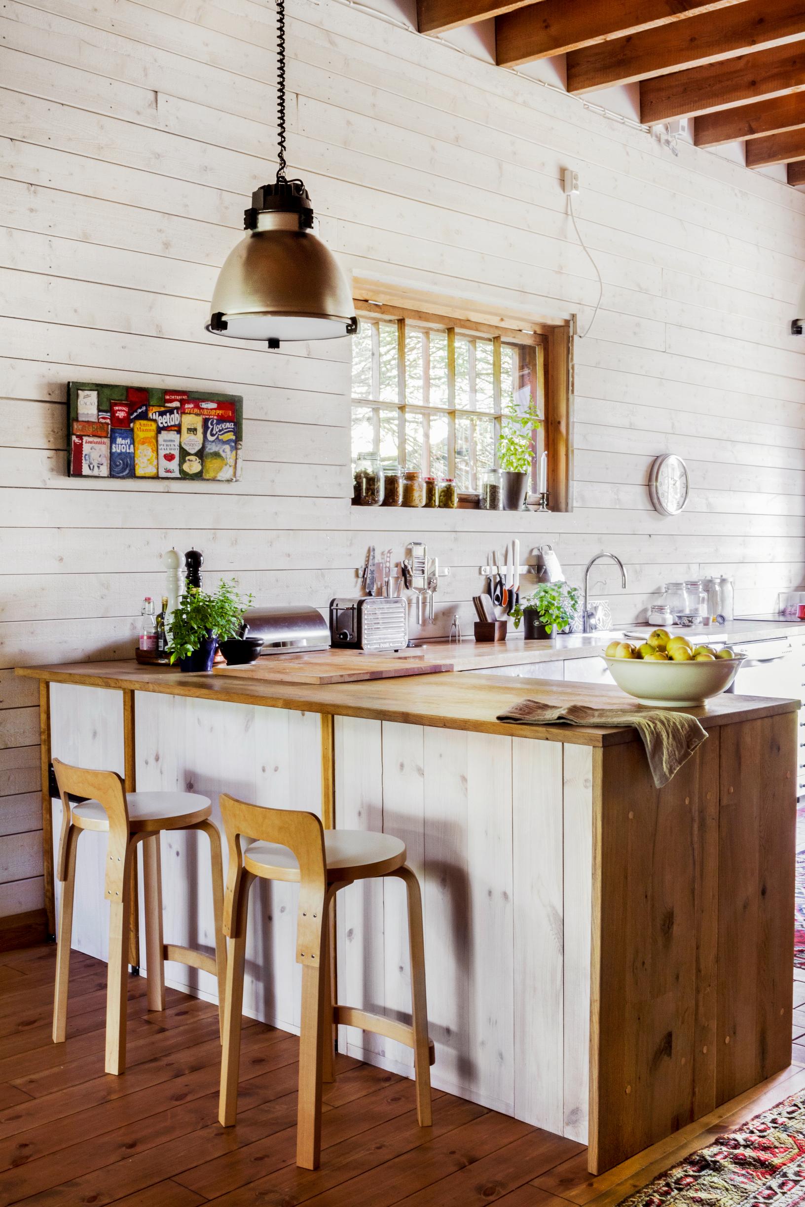 Nina remontoi tilan laudoittamalla seinät sekä katon. Keittiösaarekkeen hän rakensi entisen keittiön tammirungosta ja yhdisti siihen Ikean rosterikaapit. Ne sopivat vanhaan rakennukseen upeasti.