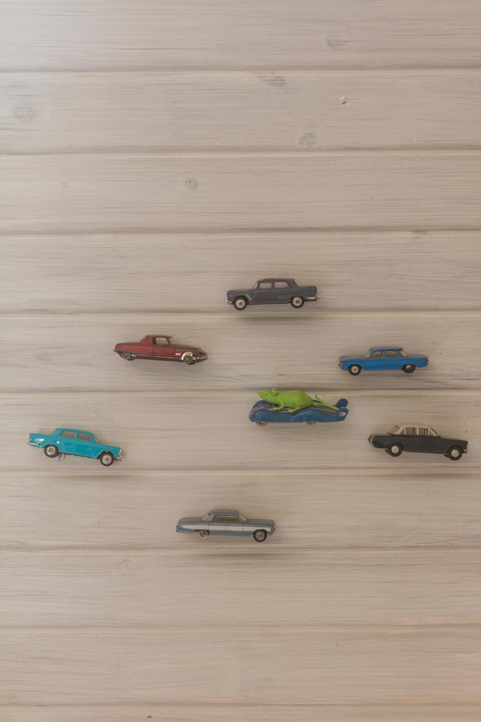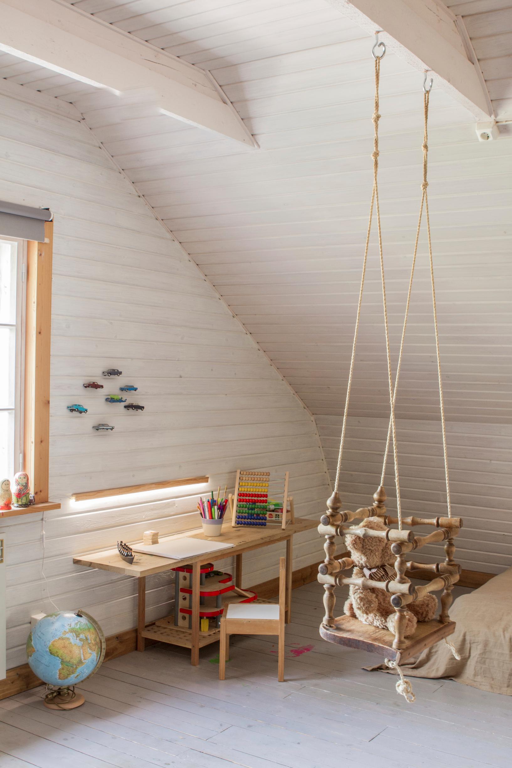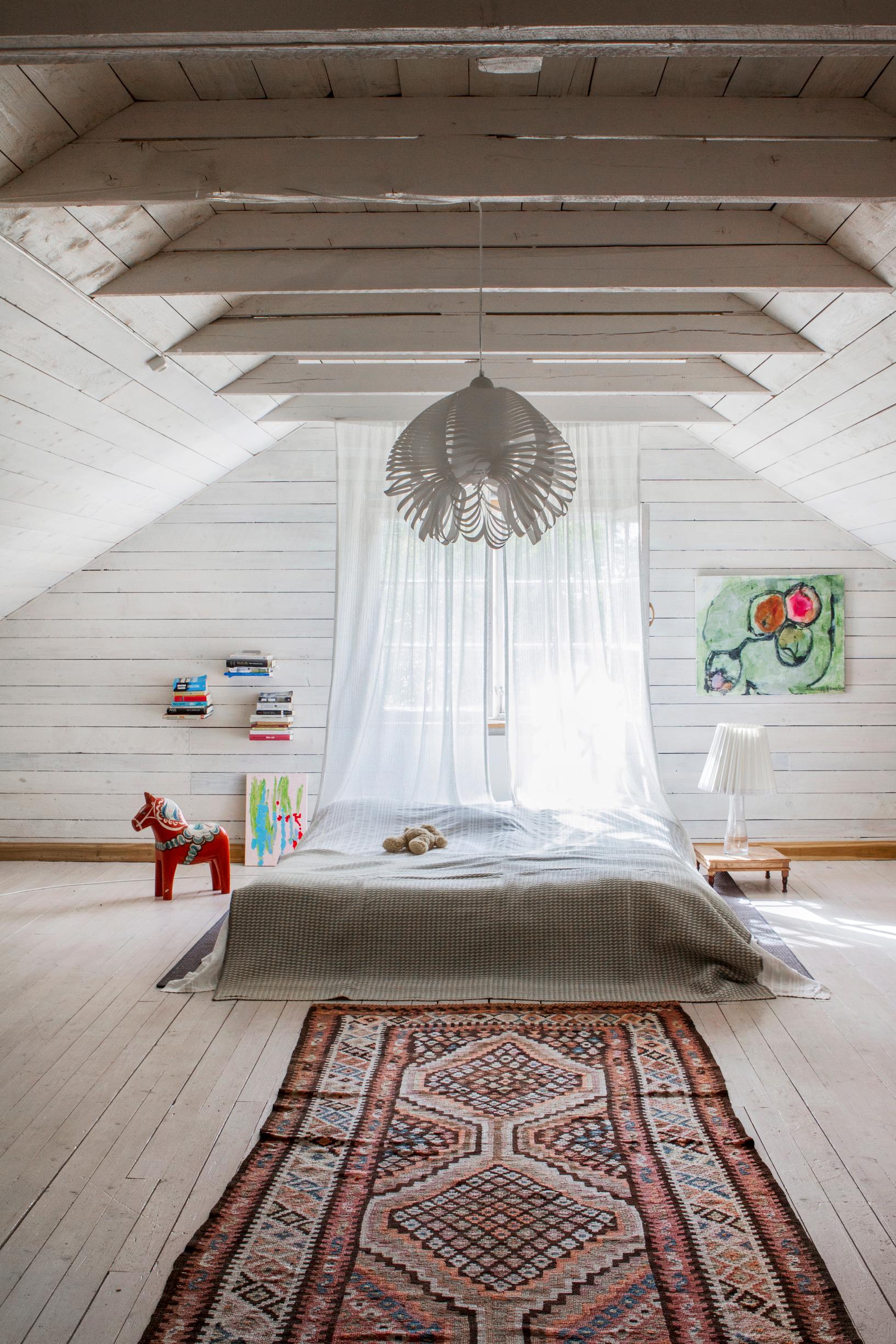 Yläkerrassa ovat makuuhuoneet. Vaikka tila on valtava, sinertävät seinät ja metrin päähän ikkunasta ripustettu Ninan mummin vanha pitsiverho tekevät siitä unenomaisen. Tarkkaan katsoessa huomaa, että Soili Arha on sävyttänyt jokaisen seinälaudan hieman eri sävyiseksi. Ripaus sinistä saa vaalean seinän kuin leijumaan poutapilvien lailla.