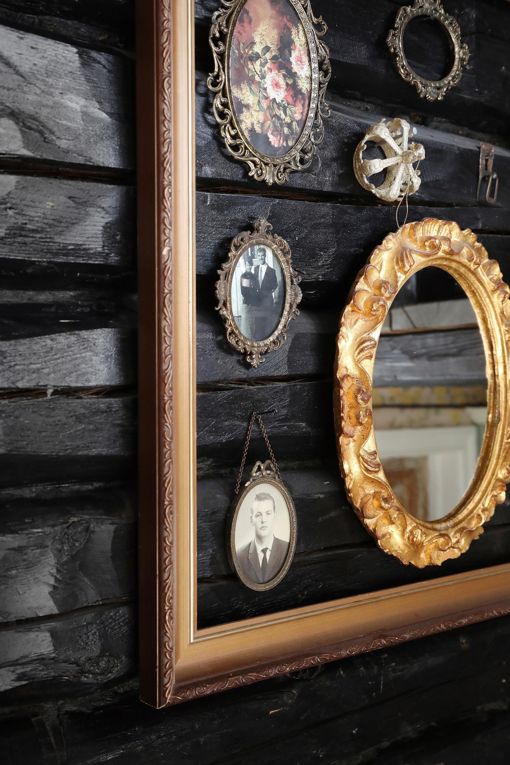 Portaikon seinälle on kerätty kauniita peilejä ja kehyksiä. Kehyksissä on valokuvia Annelle tärkeistä ihmisistä.