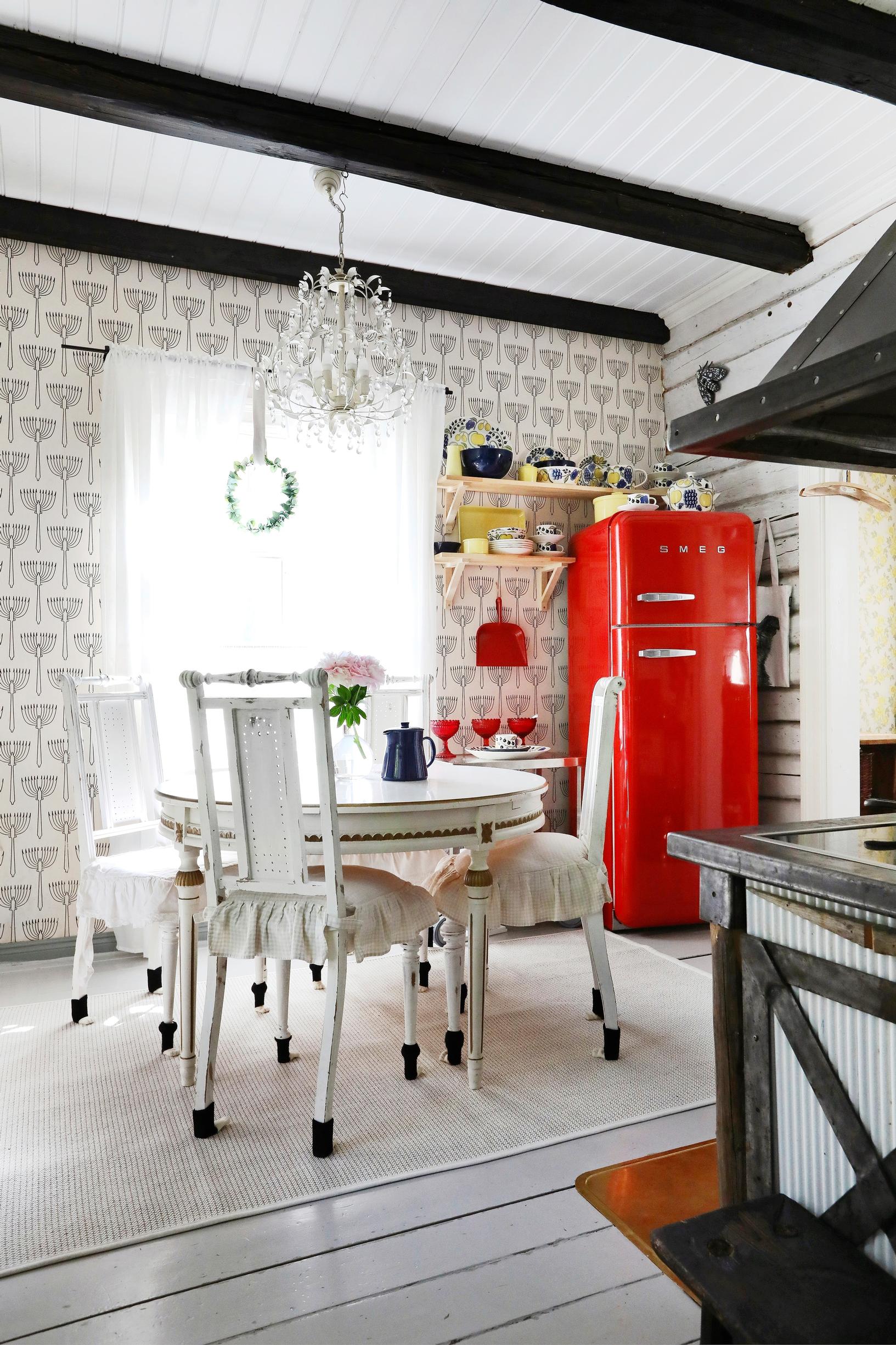 Punainen jääkaappi on keittiön herkullinen väripilkku. Se suorastaan huusi saada kaverikseen kauan sitten kerätyn Paratiisi-astiaston, jota aiemmin on säilytetty katseilta piilossa. Pöytä on ostettu antiikkiliikkeestä ja tuolit kirppikseltä. Anne maalasi ne kalkkimaalilla valkoisiksi ja sittemmin jo mustaksi. Kattokruunu on yksi harvoista uutena ostetuista tavaroista. Tapetti on Pihlgren ja Ritolan Atrain. Kaveriksi Anne askarteli tiskipöydälle taulun, jossa on sisällä oikea atrain.