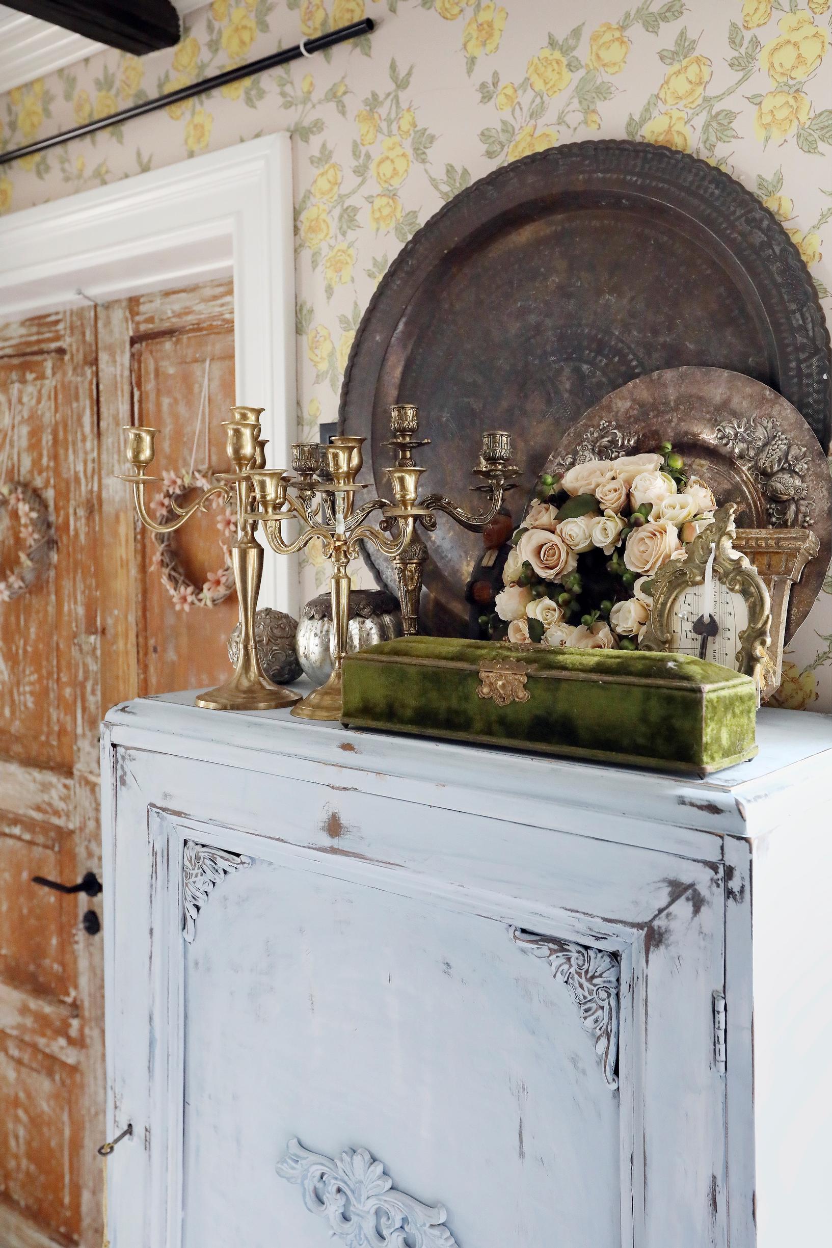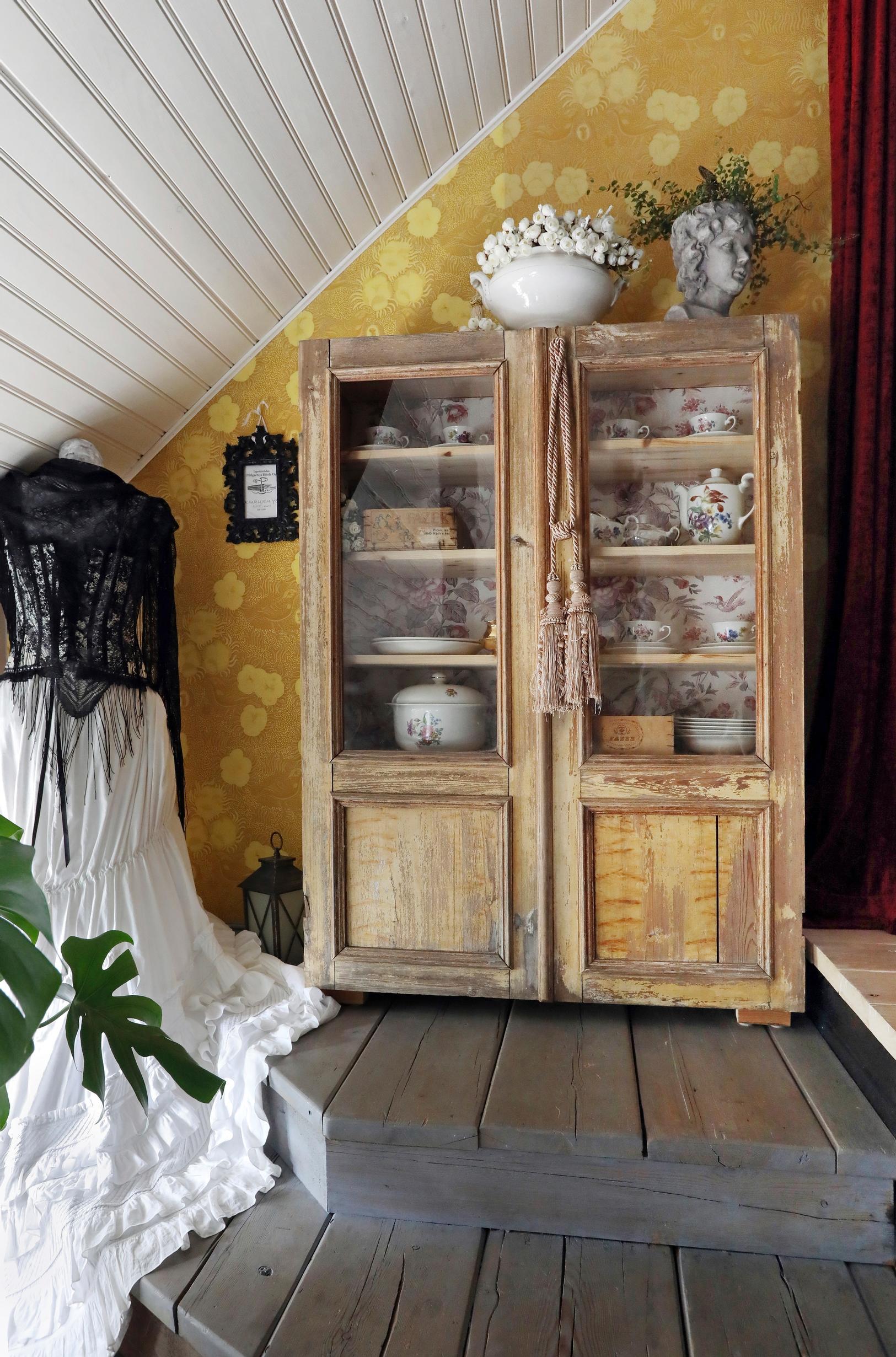 Anne osti Facebook-kirppikseltä kauniit, antiikkiset ovet. Jari teki niille levystä ihanan kaapin, jonka Anne vanhensi maaleilla. Tapetti on Kiurujen yö Pihlgren ja Ritolalta.