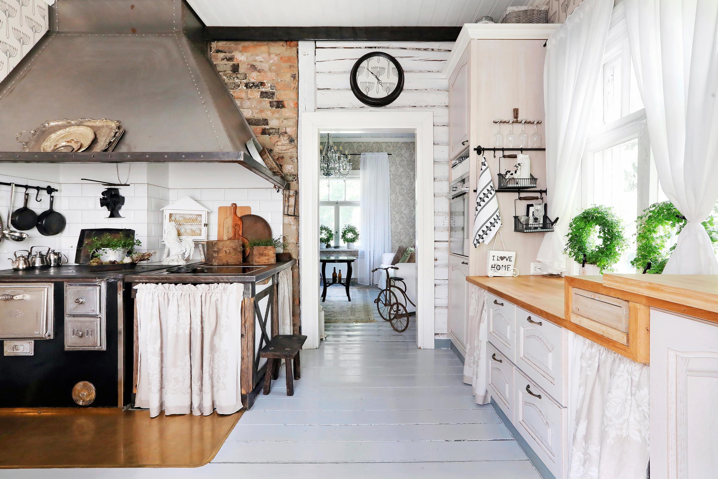 Anne on peittänyt kauniilla, vanhoilla pellavapöytäliinoilla arkisia säilytystiloja hellan alla ja keittiökaapistojen vieressä. Kylmään aikaan Anne herää neljältä aamulla sytyttämään tulet hellaan, jotta ehtii nauttia aamukahvit ihanassa tunnelmassa. Sen jälkeen sadan kilometrin työmatkakin alkaa hyvissä fiiliksissä.