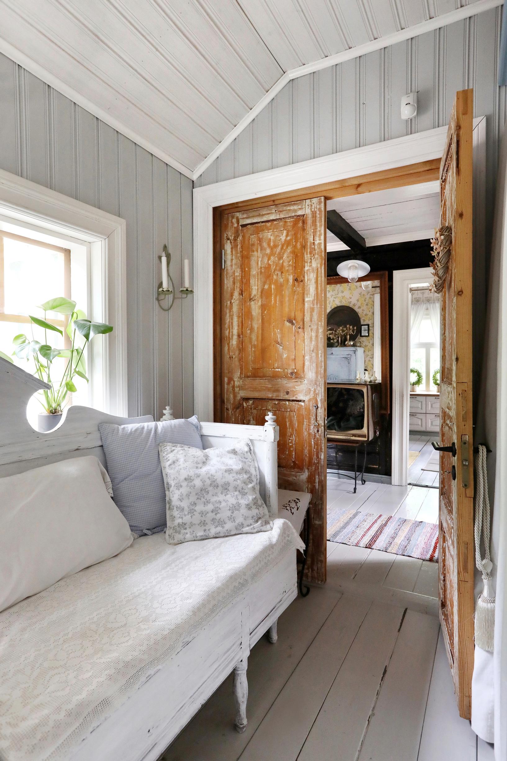 Kapeaa eteistä kaunistaa vanha puusohva Tori.fistä. Anne maalasi sen valkoiseksi ja heti kotikuvauksen jälkeen jo mustaksi. Vuokraemäntä on tehnyt aiemmin kovan urakan rapsuttaessaan upeista ovista puupinnat näkyviin.