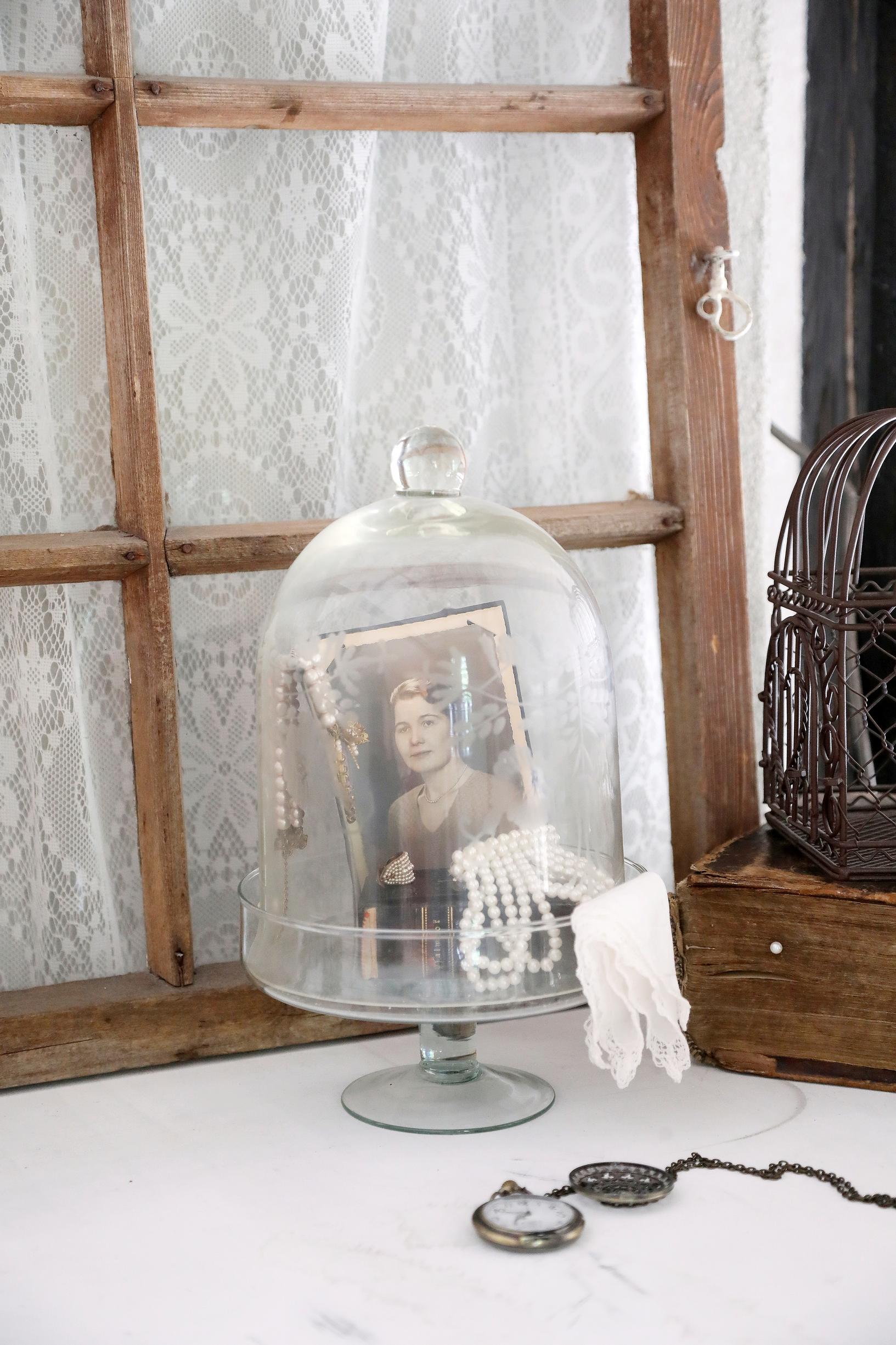 Annen isoäidin kuva ja hänen kultareunainen Raamattunsa lasikuvun alla yläkerran pöydällä muistuttavat tärkeästä ihmisestä. Henkeen sopivat helmet ja taskukello ovat kirppislöytöjä.