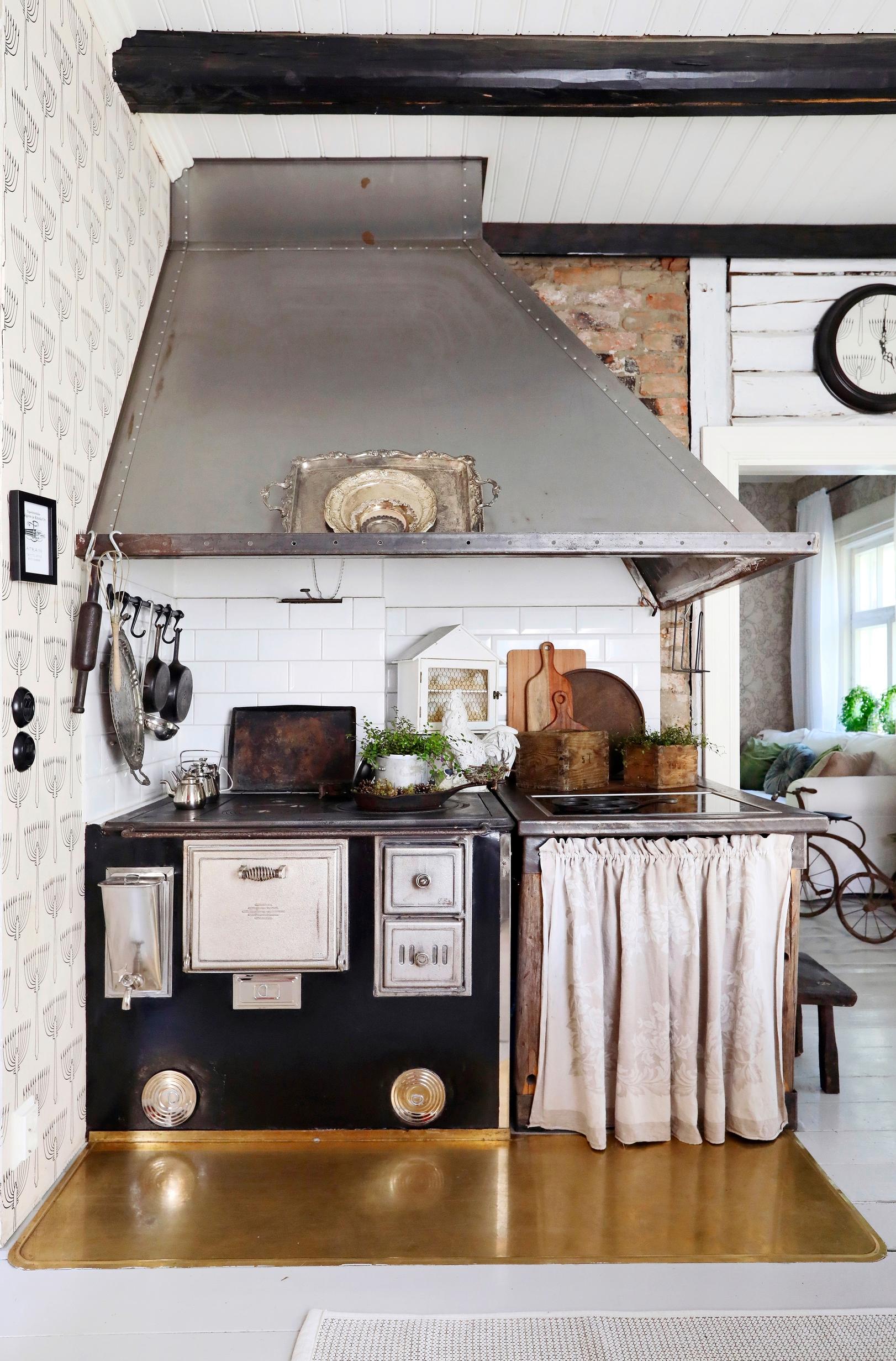 Tilavassa keittiössä on kotoisaa. Tummat kattoparrut tuovat ripauksen ranskalaista maalaistunnelmaa. Vuokraemäntä on tuunannut ison seinäkellon Pihlgren ja Ritolan Atrain-tapetilla. Esiin otettu tiiliseinä ja vaaleaksi maalattu hirsi luovat kiinnostavan parin.