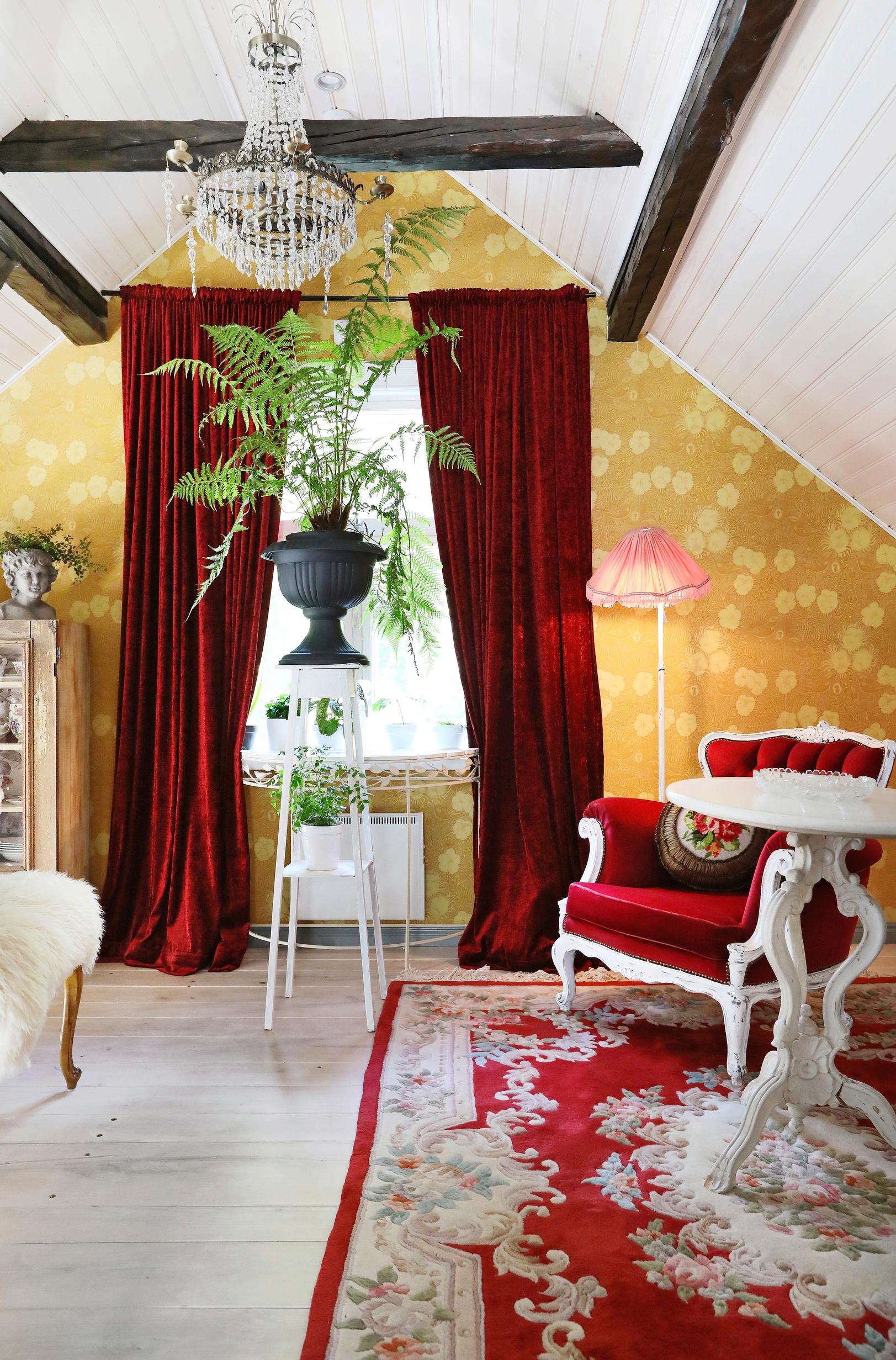 Yläkerran nurkkauksen upea nojatuoli on vanhan tavaran kaupasta ja pöytä ostos tuttavalta. Kaikki muut tavarat ovat löytöjä Tori.fistä ja kirppiksiltä. Näyttävässä muoviuurnassa viihtyy puusaniainen. Keltainen tapetti on Kiurujen yö Pihlgren ja Ritolalta.