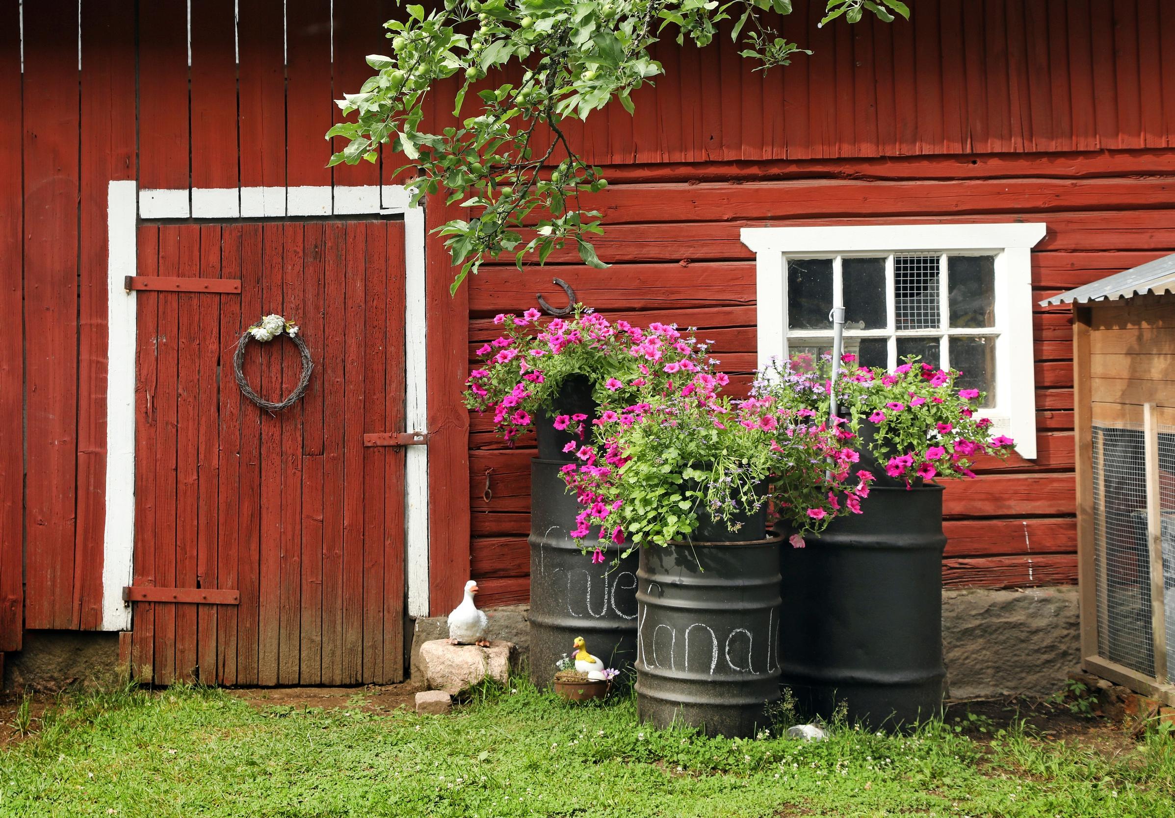 Piharakennuksessa on Annen askartelutila, jossa hän tekee kukkakimppuja ja kransseja. Materiaalia löytyy runsain mitoin kotipihasta. Anne innostui yhtenäistämään puutarhan esineistöä mustalla värillä. Vanhat öljytynnyrit maalattiin peltikattomaalilla. Kyljissä lukee ”navetta” ja ”kanala”. Petuniat viihtyvät taitavan viherpeukalon hoivissa.